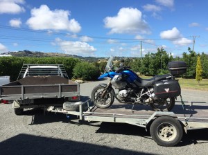das Motorrad auf einem Anhänger. Dann noch gute Weiterfahrt-