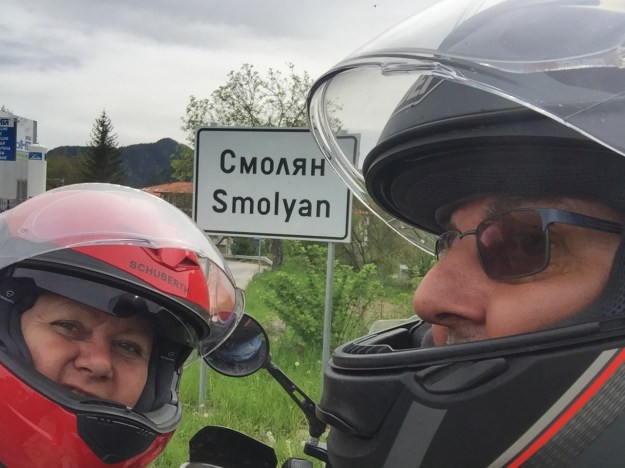 Wenn es schon einen Ort mit dem Familiennamen vom Bock-Chef gibt, dann nichts wie hin. Nicht unweit von der Teufelshöhle bogen wir rechts ab auf eine vorerst passable Schotterpiste. Das sollte der richtige Weg nach Smolyan sein? Ja, warum nicht? Ich habe zwar auf der Karte eine richtige Straße eingezeichnet gesehen, das kümmerte aber den Meister Garmin nicht im geringsten. Je höher wir rauf kamen, umso steiniger wurde es, alles noch kein Thema um umzukehren. Aber letztendlich mussten wir doch zurück, weil ein umgefallener Baum den Weg versperrte. Und die Alternativroute, die wir an einer Abzweigung gesehen hatten, war definitiv nicht zu befahren. Also die ganze Strecke retouro und auf offizieller Straße mit dem Herrn Szmolyan nach Smolyan reisen. Schnell machten wir ein Foto mit der Ortstafel, dafür sind wir ja her gekommen. Angeblich gab es einen Smolyan Clan, der sich hier niedergelassen hatte. Ob mein Szmolyan von denen abstammt, dazu muss erst eine Sage erfunden werden.
