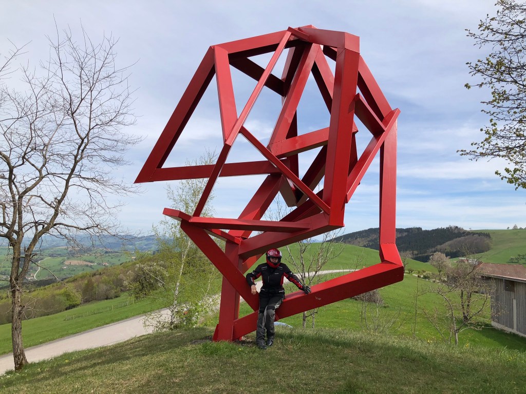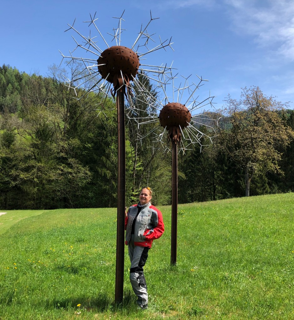 Weiter auf der Panoramastraße lockte uns eine riesige rote Skulptur auf einem Hügel an. Landart erfahren, von unserem letzten Italienurlaub, wollten wir natürlich wissen, was das ist. Wir stiefelten rund herum und rätselten. Es handelt sich um den impossanten „Wächter des Mostviertels“, wie uns ein kleines Mädchen, das mit den Eltern in der Wiese saß, erklärte. Wow, sehr beeindruckend. Sicher hat er auch gewacht; über die heurige Blütenpracht! 🙂