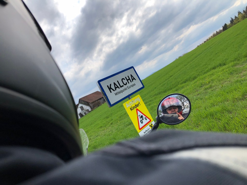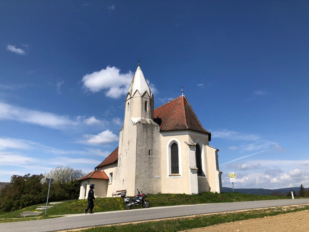 Rasenkanten hin oder her! Die nächste Pilgerfahrt mit dem Bock musste her. Es ging nicht an, dass die wenigen Sonnenstunden im April nur dem Garten gehörten. Gleich über die Feldwege hinter Sarling steuerten wir die kleine romanische Nikolauskirche an, die direkt auf der Pilgerstrecke nach Maria Taferl liegt. Vorbei am Schlösschen in Krumnussbaum streiften wir bei Melk einen Donauarm und bei Aggsbach ging es legal unbesfestigt rauf nach Nesselstauden. Es gibt sie ja doch, die kleinen erfreulichen Strassen-Überraschungen! Wir kurvten so dahin in der Frühlings-Landschaft und plötzlich waren wir beim Mittelpunkt Europas angekommen. Kalcha – Mittelpunkt Europas war da angeschrieben, Ortsschild und ein Bauernhof, sonst nix. Noch nie gehört, dass dieser bedeutende Punkt nur 14 km von unserer Homebase entfernt liegt. Auch diesmal wurde Dr. Google befragt, ob das stimmen kann, da diesen Titel mehrere Orte beanspruchen. Ich gehe mal davon aus, dass es sich in unserem Fall eher um eine touristische Kuriosität für den Mostbauern handelt, als um einen ernsthaft wissenschaftlich ermittelten Ort. Wenn es für‘s Geschäft dienlich ist warum nicht. Wir hatten auf alle Fälle wieder mal eine coole Entdeckungsrunde im Mostviertel gedreht.