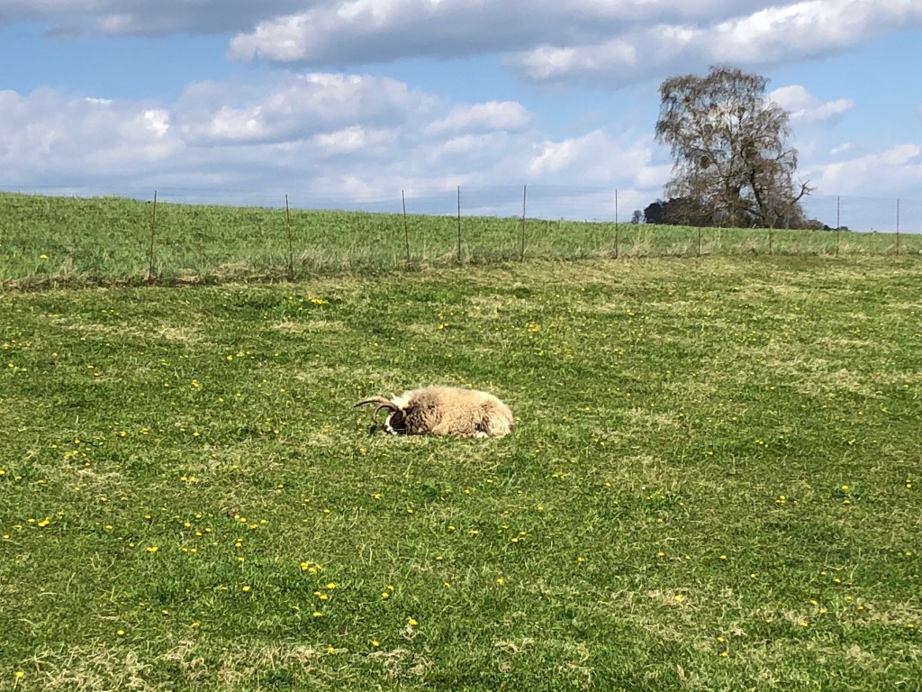 Unser Hausberg ist der Hengstberg und dort haben wir gleich mit der ersten Spritztour begonnen. Meister Garmin überraschte erfreulicherweise mit einem wunderbaren Waldstrasserl. Die legale Befahrbarkeit konnte nicht wirklich geklärt werden, was im Nachhinein ja auch irrelevant ist. Und so landeten wir beim Nadlingerhof. Das Heimatmuseum war natürlich wegen der verlängerten Osterruhe zu, ebenso der Mostheurige. Mit dem „Strassenräuberknoten“ befestigten wir den Bock am Pferdeparkplatz und schauten uns um. Der Haushund begrüßte uns Schwanz wedelnd. Dann bestieg er wieder seinen Streitwagen und ließ sich durch die Gegend kutschieren, so ein fauler Hund. War aber eine witziger Anblick, der große Hund in dem kleinen Wagen! Ein paar Kilometer weiter bremsten wir uns noch bei einer Lama-Koppel ein. Ein ganz armes Schaf mit ziemlich verwachsenen vier Hörnern lag da in der Wiese. Oh wie arm, dachte ich. Der Schafbock ist sehr hässlich! Ich bin ja keine Zoologin, trotzdem hat mich dieses missgebildete Kreatur beschäftigt. Die Dr. Google-Befragung zuhause ergab erstaunlicherweise, dass es sich bei der gesehenen Spezies um ein Jakobsschaf gehandelt hat und das Konglomerat an Hörnern ist bei dem Tier normal. Wieder was dazu gelernt bei der beschaulichen Runde mit Tierkunde.