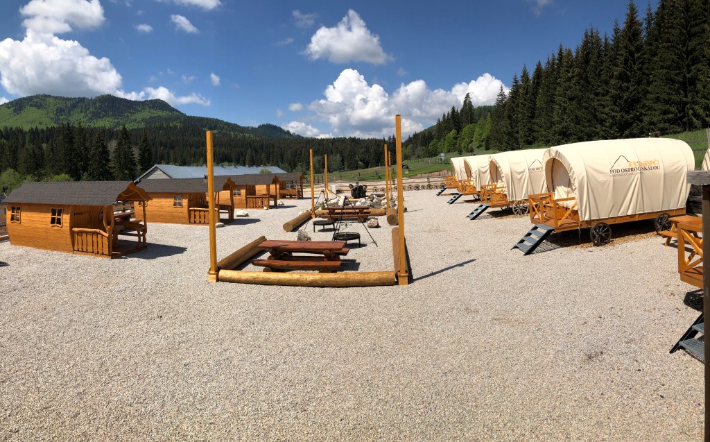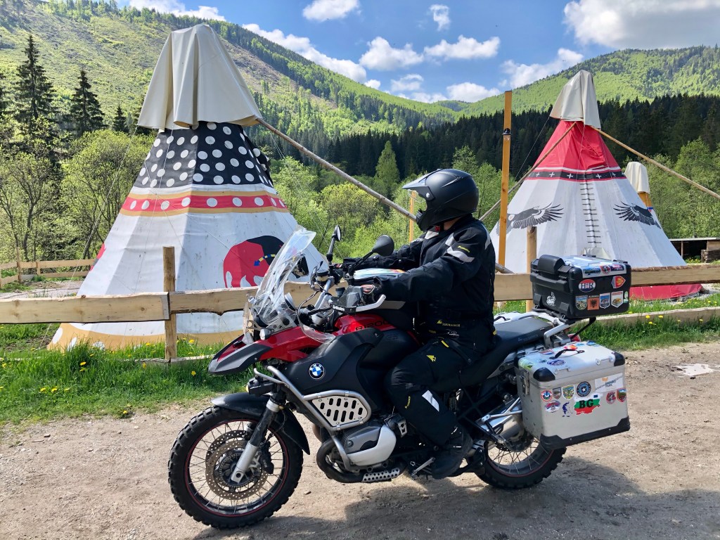 Am nächsten Morgen stiegen die Nebelschwaden aus den umliegenden Wäldern und Tälern, der Himmel war blau und die Sonne legte an Temperatur zu. Aufbruch zum Grajnar-Pass! Aber halt wie cool ist das? Indianerzelte und Siedlerwagen am Straßenrand und ein Saloon? Sind die letzten Indianer in die Slowakei ausgewandert? Das mussten wir uns näher ansehen, ausserdem kam eine kleine Kaffeepause grade recht. Nun hier Irgendwo im Nirgendwo hat ein findiger Geschäftsmann einen kleinen Family-Park im Western-Stil errichtet. Bald sollte die Eröffnung sein und dann kann so ein Siedlerwagen oder Tippy auch zum Nächtigen gemietet werden. Das ist sicher ein Erlebnis, nur so lange konnten wir nicht warten, denn der nächste Pass musste angefahren werden. Der Bock-Chef ließ sich wieder Mal von Meister Garmin in punkto Off-Road-Asphalt-Möglichkeiten beraten. Und in der Tat, der Meister spielte all sein Kartenmaterial aus, um möglichst asphaltfrei zum Sulova Sattel zu kommen. Die zwei Männer am Gartenzaun in Delava haben ganz schön geschaut, als wir mit der BMW GS 1200 Adventure um die Büsche quasi am Feldweg daher gehöppelt kamen, um auf die Dorfstraße einzubiegen. Das sieht man hier sicher nicht alle Tage.