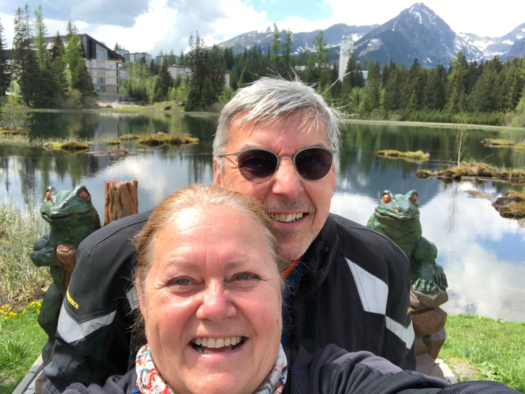 Nachdem wir alles auf der Burg abgestiefelt hatten, ging es weiter in die Hohe Tatra. Hier gibt es richtige felsige Berge, die bis zu 2500 hoch sind. Schneebedeckte Gipfel und Hotels, die schon bessere Zeiten erlebt haben, aber auch ganz moderne Bungalows, stehen für die Gäste bereit. Bei unserer Tour in die Ukraine haben wir hier schon übernachtet. Aber jetzt noch schnell zum Zielpunkt beim Nove Strbske Pleso auf 1346m bevor die Frösche ins Wasser springen (*grgrgr*).