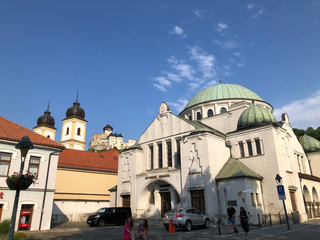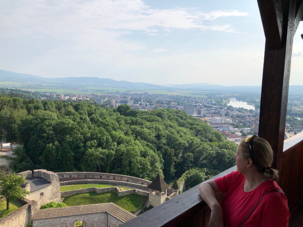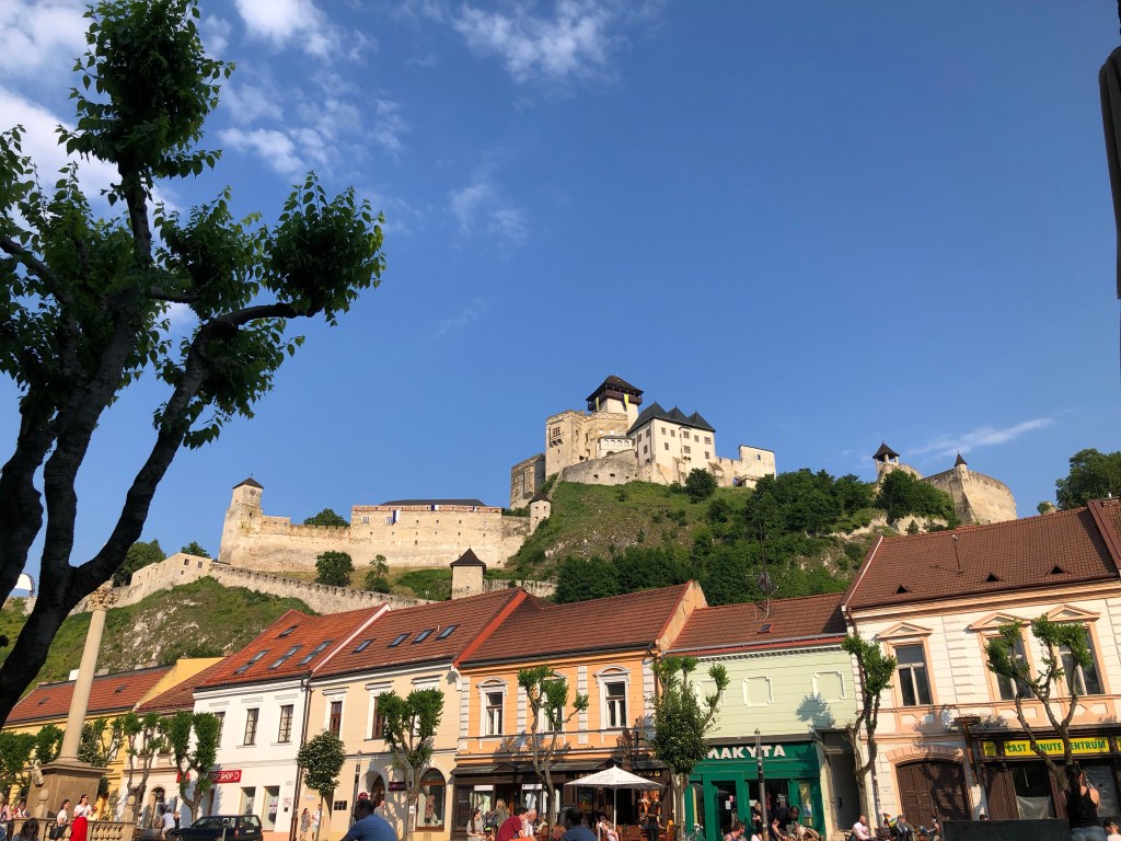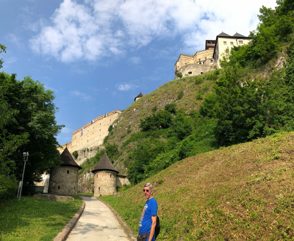 Auf der Terrasse im Maladinovo genossen wir heuer unser erstes Frühstück in der Sonne. Es wurde auch schon Zeit, für ein wenig Sommer-Feeling. Ein Pass fehlte noch, den steuerten wir schnurstracks an, Martinske hole auf 1250m. Die Tourenbeschreibung ließ einen „herausfordernden Straßenbelag“ erwarten und viele Kurven auf einer schmalen Straße, was dann auch so war. Nachdem der Bock ja eh gerne höppelig unterwegs ist, war das für uns natürlich keine aussergewöhnliche Herausforderung. Nur ein paar Radfahrer und ein, zwei Autos sind uns begegnet. Am Wochenende ist sicher mehr los. Von hier ging es noch zum Endpunkt unserer Slowakei-Reise nach Trencin. Die drittgrößte Burg in der Slowakei steht hier und die wollten wir unbedingt noch ansehen. Der Bock bekam wieder einen Spezialparkplatz in einem Durchgang, der über Nacht abgesperrt wurde. Wir streiften in der Penzion Scarlet unsere Motorrad-Rüstungen ab und machten uns auf. Der steile Fußweg rauf zur Burg war nicht minder anstrengend, als die Auffahrt zum Martinske hole. Die Castell-artige Anlage ist authentisch renoviert. Man hat von da oben einen phantastischen Blick auf die Stadt, mit den Kirchtürmen und dem Kuppeldach der Synagoge. Die Burg von Trencin thront uneinnehmbar hoch oben auf ihrem Felsen über der Stadt – genau so hab ich mir immer eine Märchenburg vorgestellt. Den Tag liessen wir gemütlich in der Clock-Bar am Stadtplatz bei Bier, Wein, Cocktails UND mit köstlicher Gänseleber-Pastete ausklingen. (Ich hör schon so manchen „buuuh“-Ruf wegen der Gänseleber. Freunde, die Leberpastete war der Hammer! Kein schlechtes Gewissen und auch nicht Galle und Co konnten uns davon abhalten gleich zwei Portionen davon zu essen.)