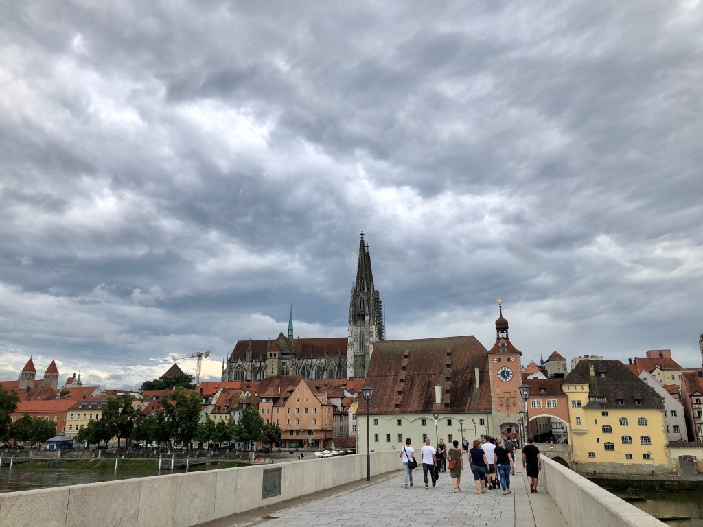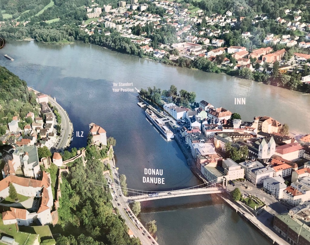 Deutschland ist unser größter Grenznachbar, der so viel Sehenswertes und historisch Interessantes zu bieten hat. Deswegen haben wir uns für diese Reise auch die Besichtigung einiger Städte, die auf der Strecke zu den Pässemarathon-Zielen liegen, vorgenommen. Begonnen haben wir in Passau. Das Dreiflüsseeck hier ist weltweit die einzige Stelle, wo sich drei Flüsse aus drei Himmelsrichtungen kommend vereinen und in die vierte Himmelsrichtung gemeinsam weiter fließen: von Norden die Ilz, von Westen die Donau und von Süden der Inn, als Donaustrom ziehen sie gegen Osten weiter. Sollte Wasser die nächsten Tage unser Begleiter bleiben?