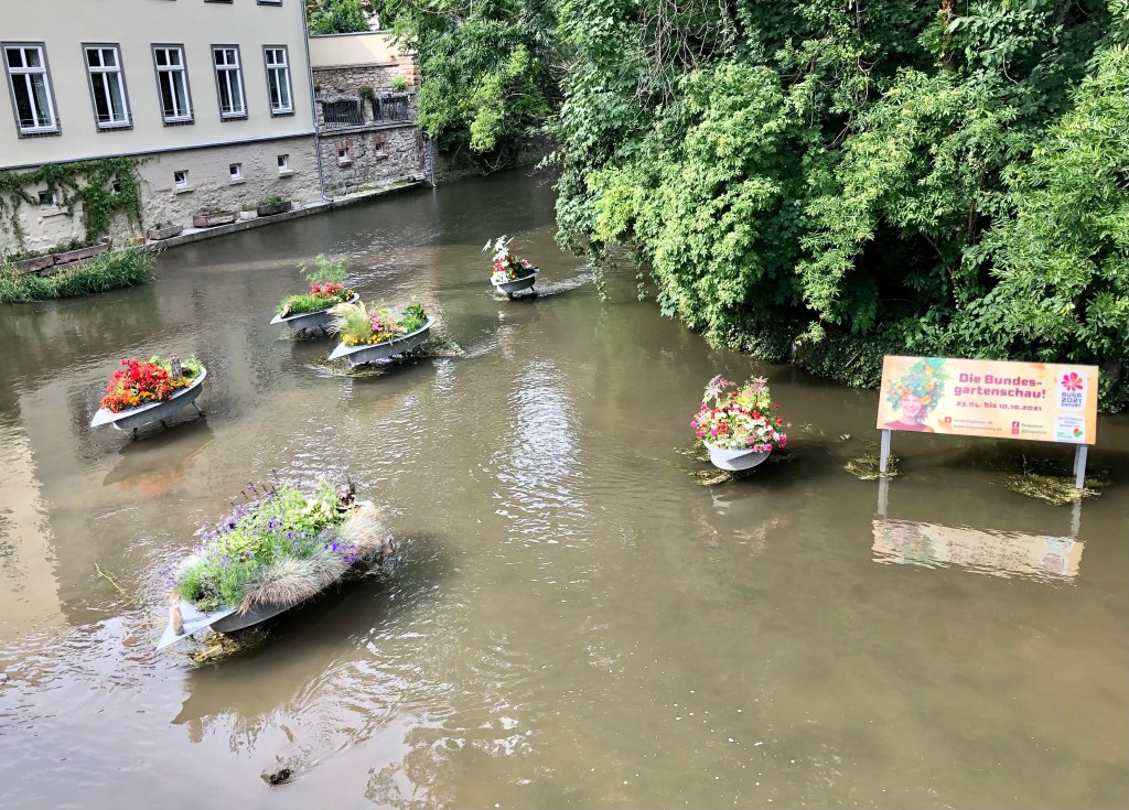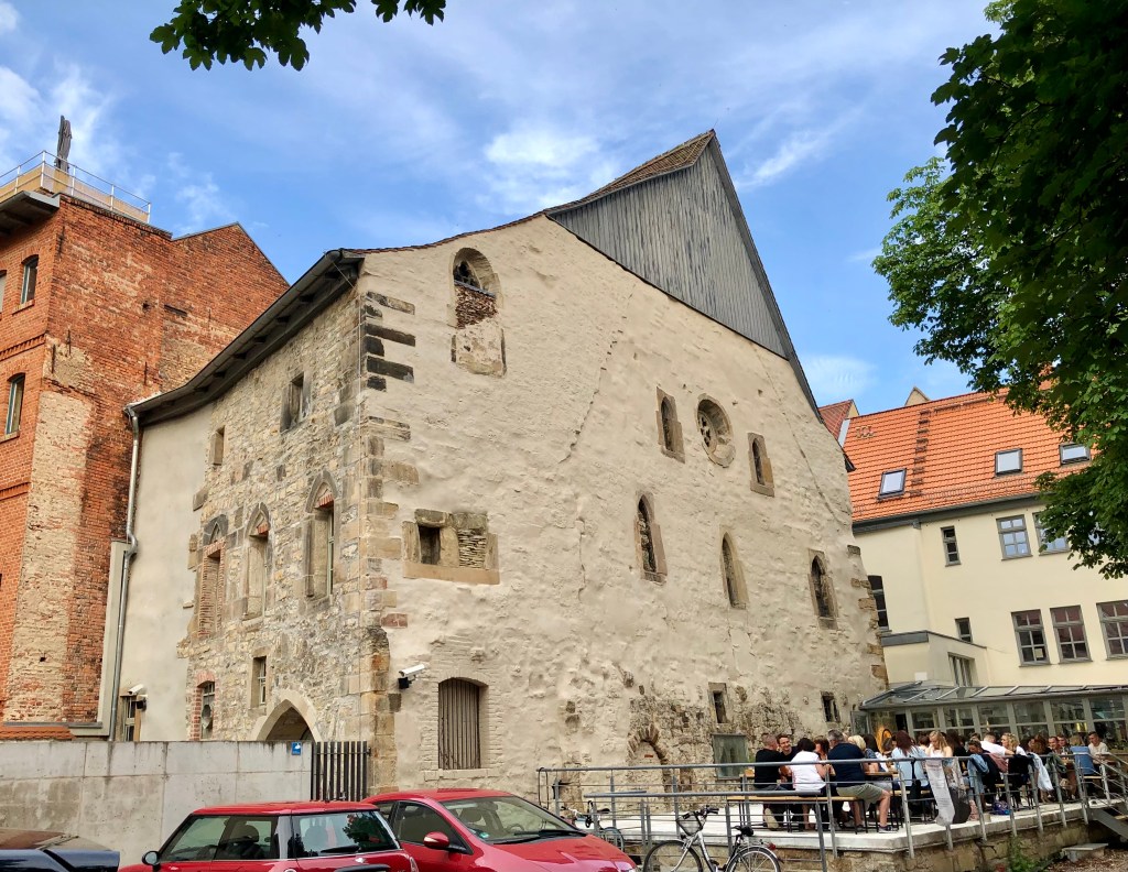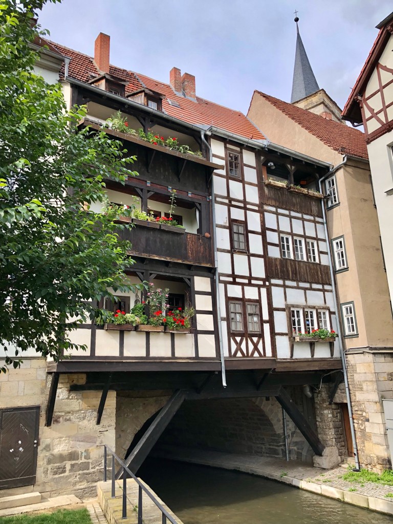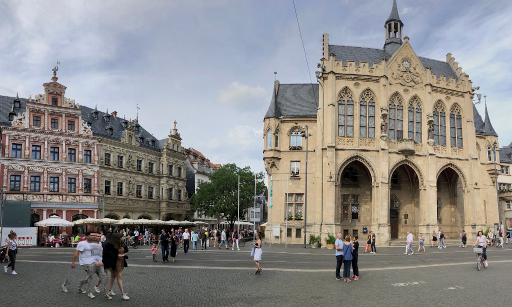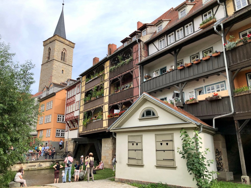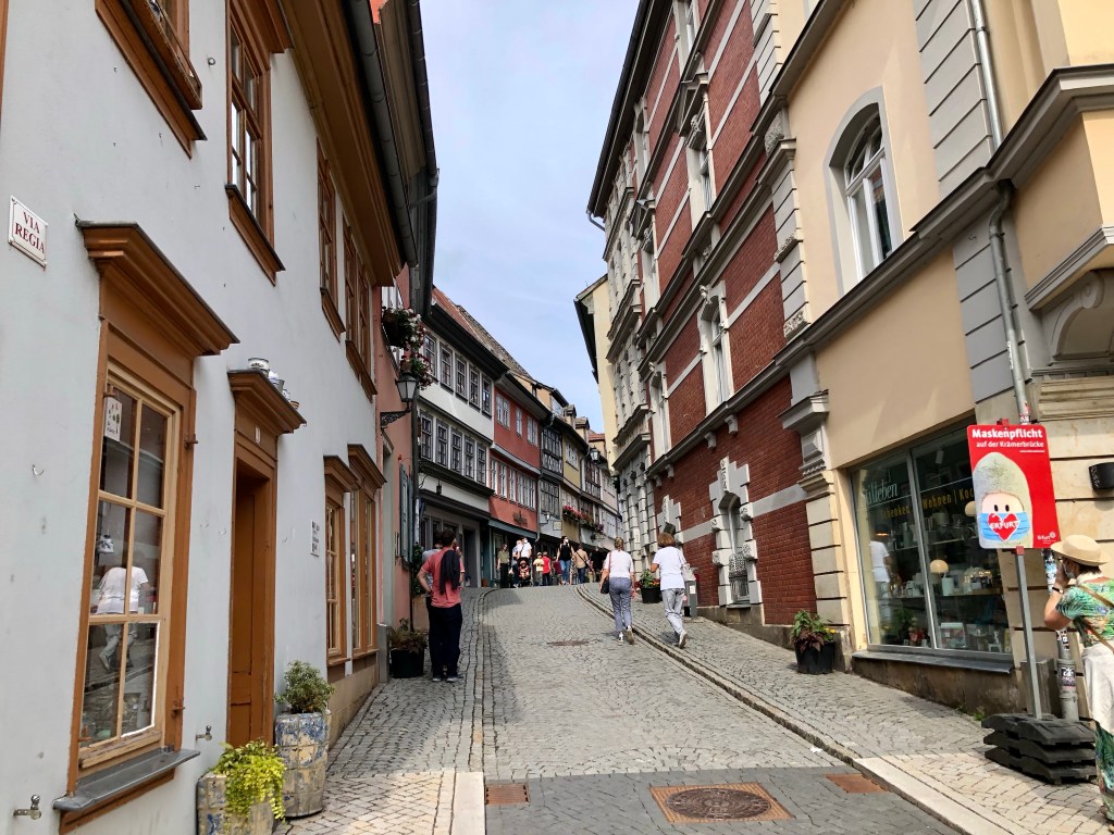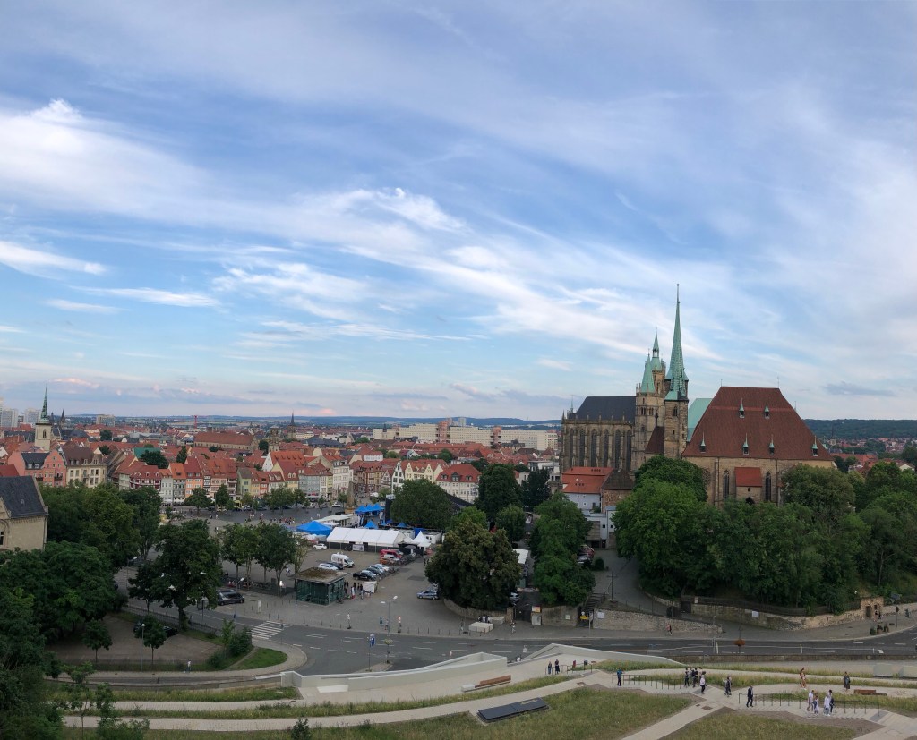 Genug Geschichten, nun wird schnell weiter gefahren in die Hauptstadt von Thüringen – Erfurt. Die Hauptsehenswürdigkeiten sind der Dom, der mittelalterlich geprägte Altstadtkern mit etwa 25 Pfarrkirchen, die älteste erhaltene Synagoge in Mitteleuropa, die wunderschönen Bürgerhäuser und nicht zu vergessen die Krämerbrücke, das älteste profane Bauwerk Erfurts. Sie ist die längste durchgehend beidseitig mit Häusern bebaute Brücke Europas. Ursprünglich als Holzbrücke über die Furt der Gera erbaut, wurde sie im 14. Jahrhundert durch einen Steinbau ersetzt. Erfurt ist laut Dekret auch die älteste Universitätsstadt von Deutschland. Einer der bekanntesten Studenten war sicher Martin Luther. Es macht richtig Spass durch die Gassen der Stadt zu flanieren. Es war ein sonniger Tag und in vielen kleinen Höfen hatten die Biergärten offen. Wir strandeten letztendlich bei unserem Spaziergang auf der Zitadelle Petersberg. Von dort hat man einfach einen perfekten Blick auf die Stadt.