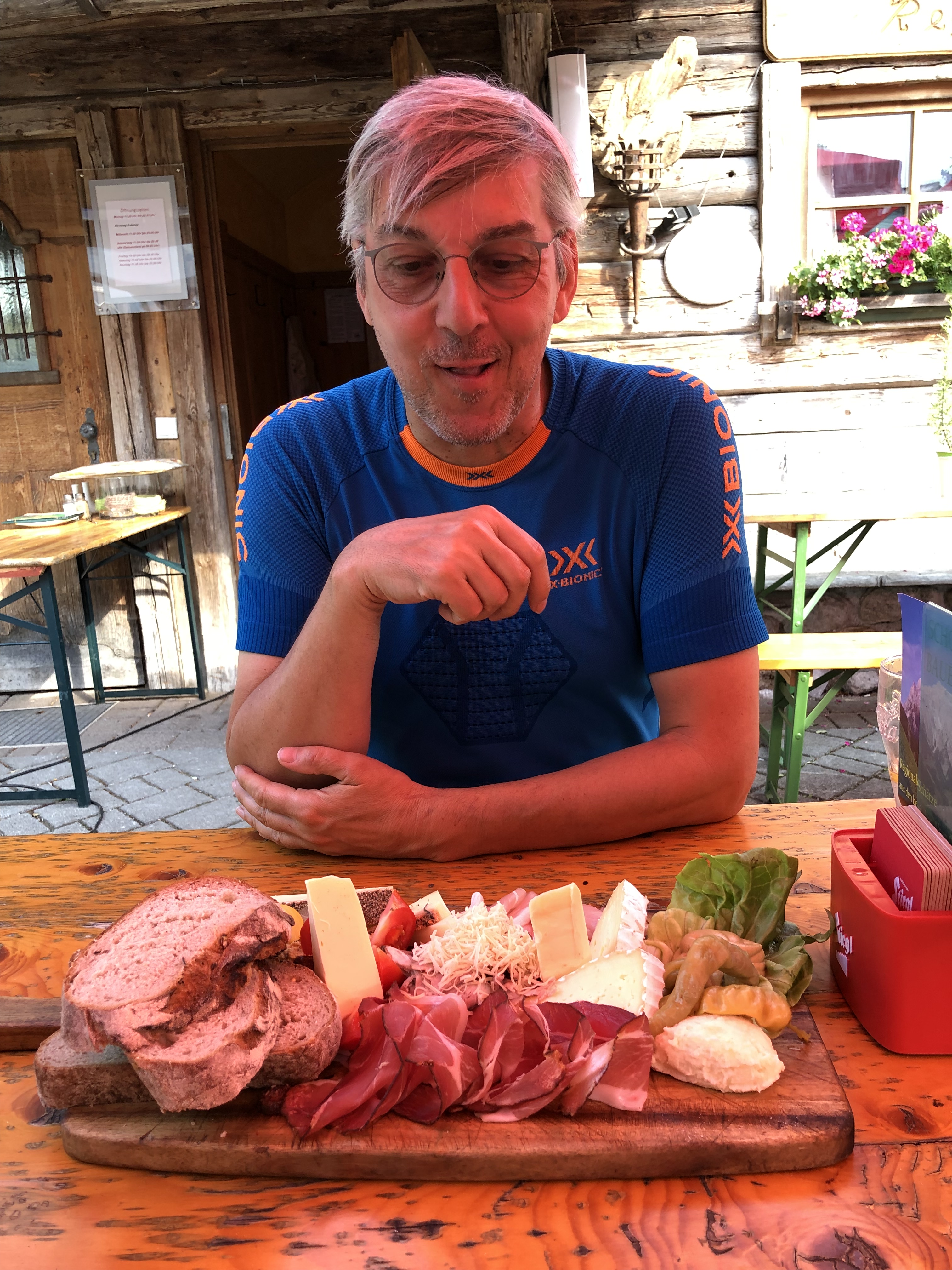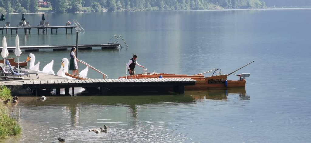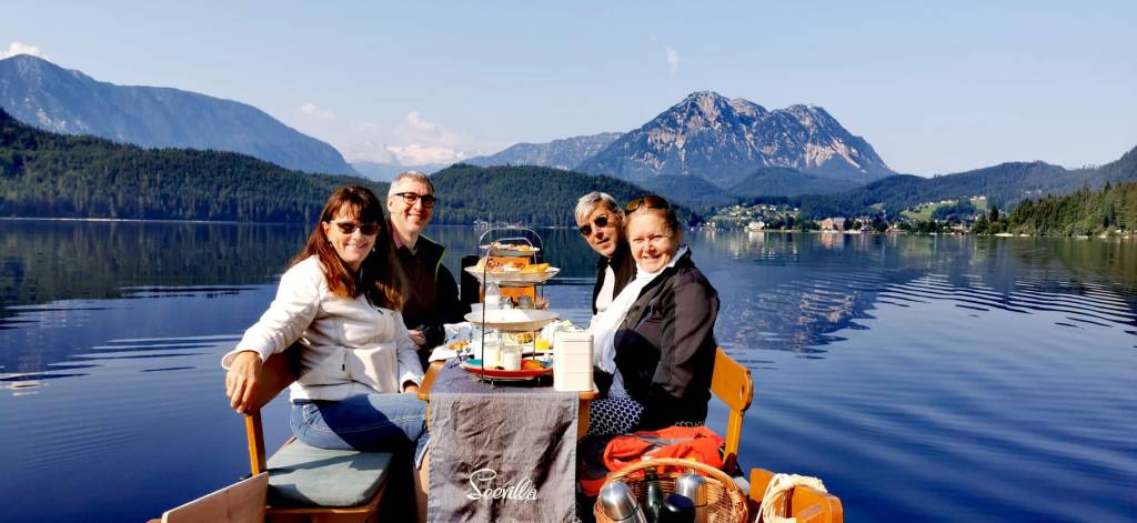 Nun, wir kamen aber nicht nur wegen den Pässemarathon-Zielen, sondern wir hatten noch ein Hochzeitsgeschenk einzulösen. Es gab schon zwei Versuche seit 2019, die dann Wetter bedingt nicht stattfinden konnten und die Pandemie machte es auch nicht leichter einen Termin zu finden. Aber jetzt schien es perfekt zu werden. Wir hatten nämlich eine Einladung zu einem Frühstück auf einer Plätte am Altausseer See. Wir – die illustre Gesellschaft – glitten über den ruhigen See mit einem trachtigen Fährmann und der Dachsteingletscher leuchtete bei blauem Himmel in der Morgenstunde herüber. Es war einfach genial, kitschig und köstlich zugleich. Danke nochmals an dieser Stellte an die edlen Spender. Ich weiß ihr lest mit. *grgrgr*