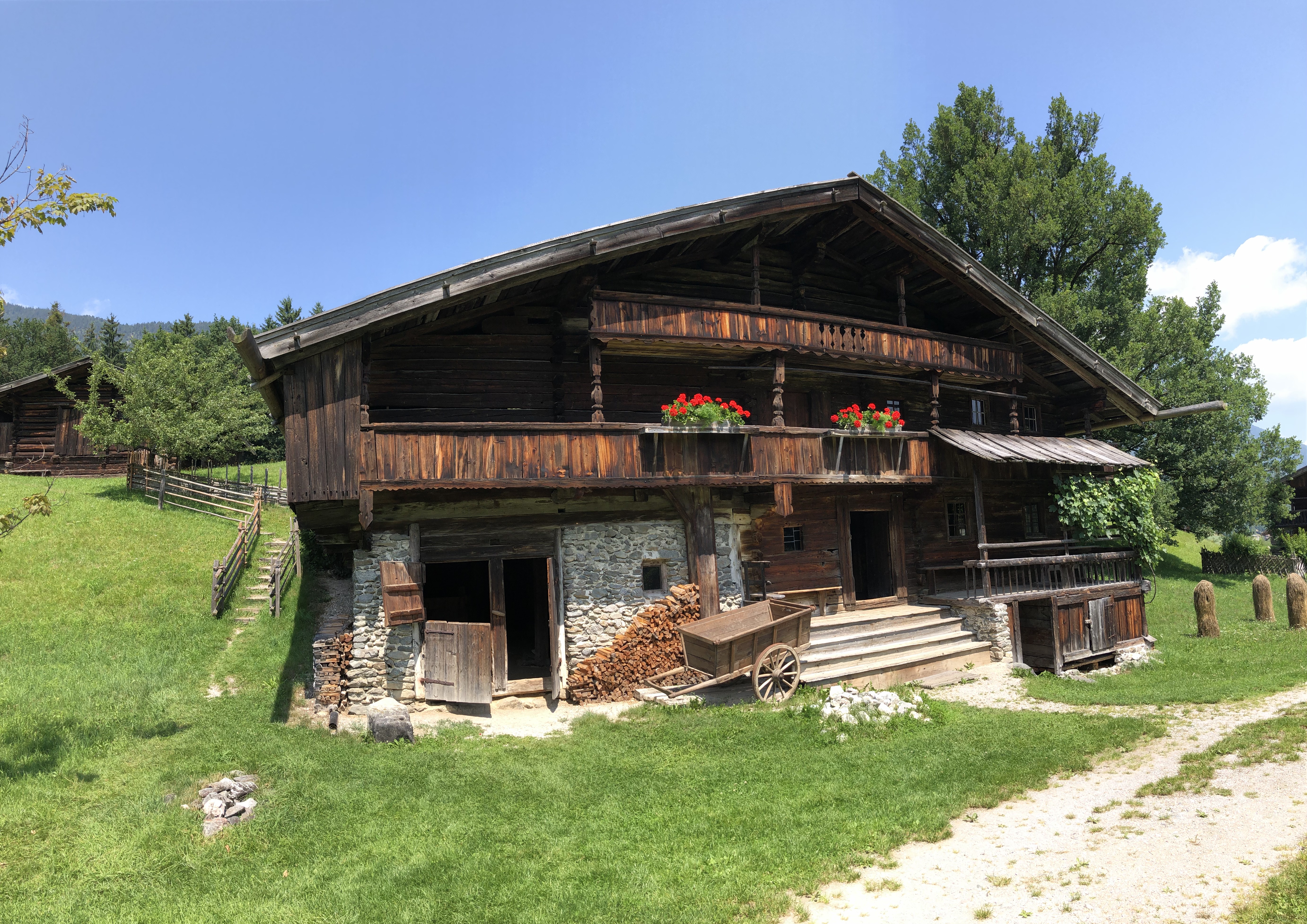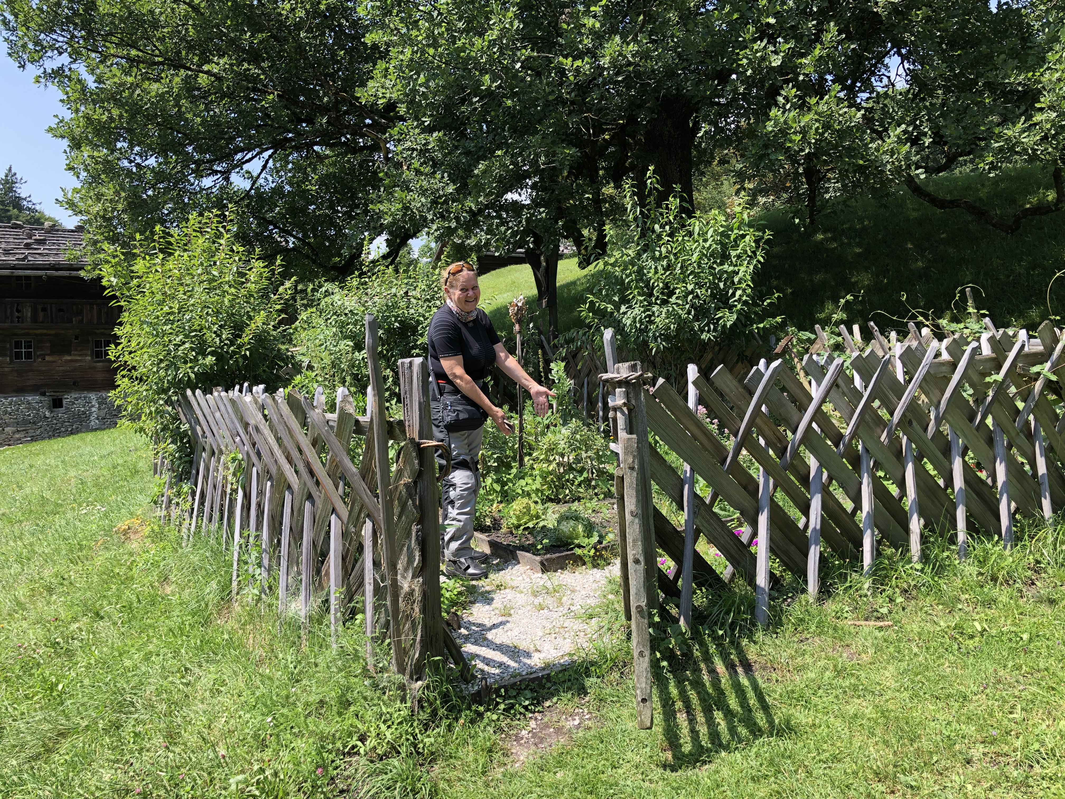 Für den Rest des Tages gab es kein bestimmtes Besichtigungsprogramm und die Fahrstrecke nach Bad Mitterndorf hatte sich Meister Garmin eh schon ausgerechnet. Wir hatten also Zeit. Die Ankündigung für die Abzweigung zum Museum Tiroler Bauernhöfe in Kramsach kam daher recht gelegen. Der Bock wurde im Schatten unter einem Baum am Parkplatz zurück gelassen und wir wanderten die paar Schritte zum Besucherzentrum des Museum. Die Bauernhöfe aus dem 16., 17. und 18. Jahrhundert liegen verstreut in einer 8,5 ha großen hügeligen Landschaft. Dazwischen sind Spazierwege angelegt und so wandert man von Haus zu Haus. Am Donnerstag war der Besucherstrom sehr überschaubar, trotz sonnigem Wetter. Das war für uns natürlich super. Kein Gedränge bei den Höfen, meist waren wir alleine in den Häusern. Beim Summerau Hof gab es auch einen Bauerngarten. Ich musste feststellen, dass es auch in Tirol gefrässige Schnecken gibt, die den Kohl ganz schön zugesetzt hatten, aber dafür ist er sicher bio. Das Hofleben muss schon sehr hart gewesen sein, auch wenn der Hof so prächtig da steht und wir mit einem etwas verklärten romantischen Blick die Dinge bestaunten.