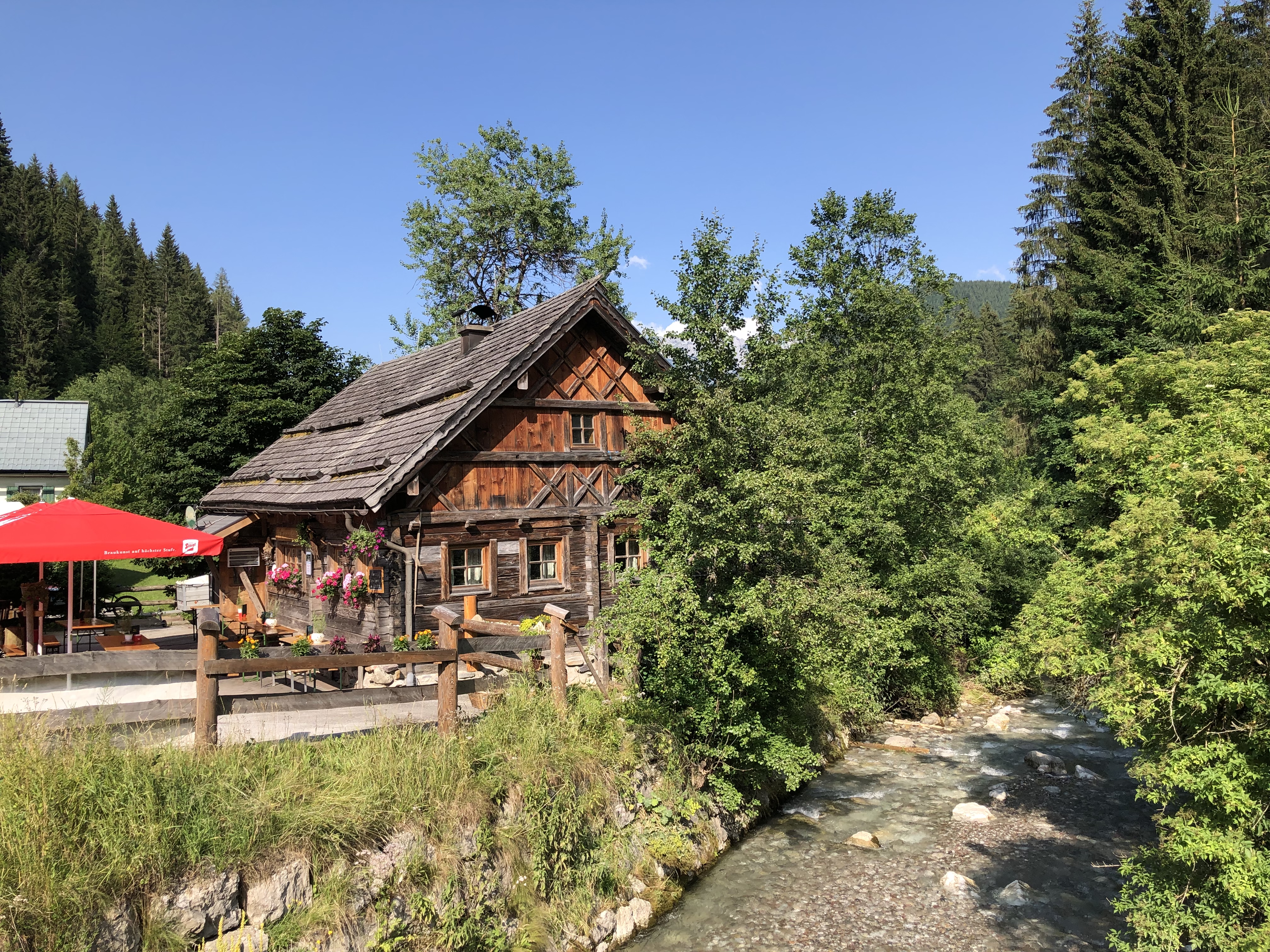 So eine Reise in die Vergangenheit ist zwar spannend, aber mag man heute noch so leben? Was man aber sicher heute noch mag, sind die kulinarischen Köstlichkeiten nach alten Rezepten. Und sowas hab ich in der Gastwirtschaft gleich gekostet: Griesstrudel mit Sauerkirschenkompott, hmmm, köstlich. Gestärkt packten wir die nächsten 244 Kilometer in Richtung Bad Mitterndorf an. Nach guten vier Stunden Fahrzeit meldete sich der kleine Hunger beim Bock-Chef. Im Salettl in Lungötz bestellten wir ein Jausenbrettl. Nur so viel: Gut, dass wir eine Tupperdose dabei hatten. Die Tauplitzalm-Straße war an dem Tag noch unser Zielpunkt vom Pässemarathon. Es war eine schöner Sommerabend. Die Auffahrt auf die Alm am Abend war super, kein Verkehr, die Straße gehörte faktisch – bis auf einen Fuchs – uns alleine.