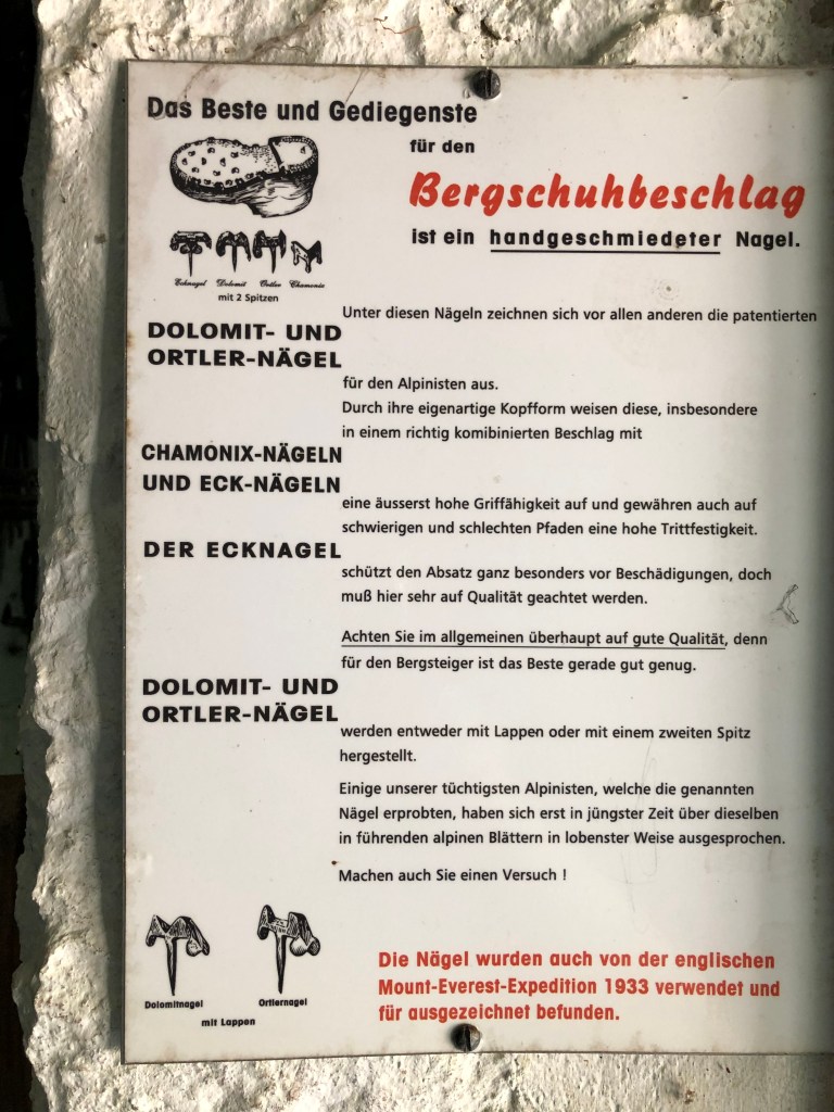 Es gab viele schöne Häuser, Almhütten und Wirtschaftsgebäude von Handwerkern in der Anlage. Das alte Werbeschild in der lokalen Schmiede fand ich aufschlussreich und wird vielleicht die Blog lesenden Bergfexe auch interessieren.