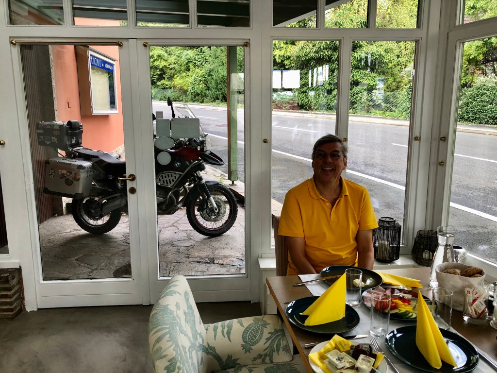 Frau lässt ja nichts unversucht, um dem Regen zu entkommen. Anfänglich schien es ja nicht so schlecht zu werden an unserem zweiten Fahrtag in Slowenien. Wir meanderten so dahin auf ein paar schönen Nebenstrassen und plötzlich klopften schon wieder ein paar Regentropfen an den Helm. Oh Mann, muss das sein! Buss-Häuschen? Regendress anziehen? Ja, aber mehr weil mir kalt war mit der luftigen Sommerjacke. Bald war der Regenspuk vorbei. Die Aussentemperaturen waren gestiegen. Es gab zwar noch viele Wolken, aber es war ok. Die Regenjacke landete wieder in der Packtasche. Die Hose behielt ich an, weil die ist unterwegs schwieriger anzuziehen. Sicher ist sicher! Ich erinnerte mich an eine Freundin, wann immer sie einen Regenschirm in der Tasche hatte, hat es nicht geregnet. Sie nannte das Phänomen „Trick 17“. Vielleicht funktioniert das mit der Regenhose genau so, dachte ich mir. Zumindest am heutigen Tag hat es schon mal geklappt, bis zum Quartier kein Regen mehr.