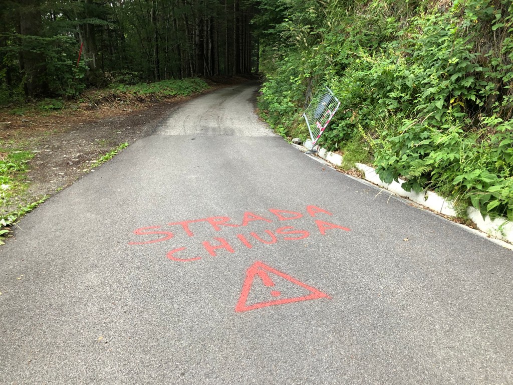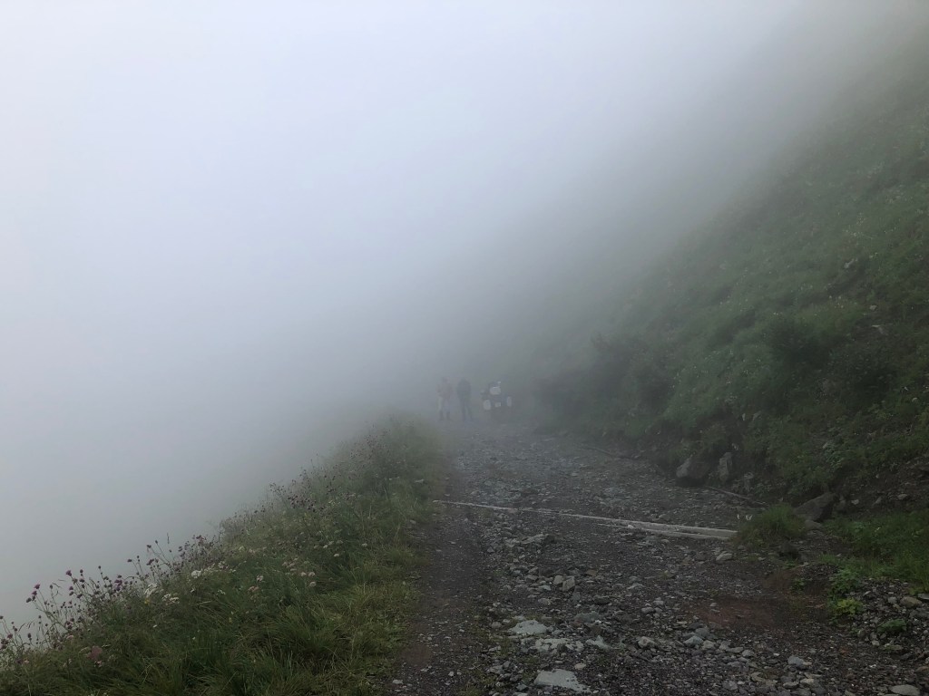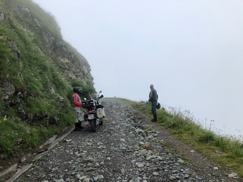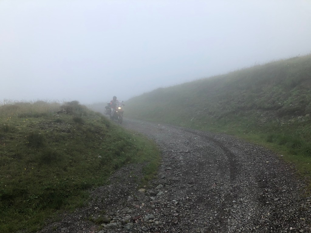 Neuer Tag, neues Glück! Wir sind extra früh aufgebrochen, denn wir wollten nochmals den Monte Tenchia probieren bevor der von der Wetter-App versprochene Regen kommt. Das gibt es ja nicht, dass der Berg nicht zu finden ist. Andere waren ja auch schon da. Laut Roadbook ist die Straße ab Kilometer 7 richtig gesperrt, aber wenigstens das Foto sollte für die Wertung im Kasten sein. Wir fuhren zurück nach Cercivento, links nach der Kirche zum Friedhof hoch, um die Mauer herum und schon waren wir auf der richtigen Straße zum Monte Tenchia. Geschafft! Kurve um Kurve schlängelten wir uns die kleine Straße hoch, vorbei an dem umgefallenen Gatter mit der Verbotstafel. wir kamen trotz immer schlechter werdender Sicht gut voran. Es sollte oben auch noch schottrig werden, wir waren gespannt. Und es wurde schottrig, sogar sehr schottrig. Die Piste war nicht mehr Sozia tauglich. Der Bockchef wurde alleine mit seinem fahrbaren Gefährten hoch geschickt und ich machte mich per pedes auf den Weg, um auch auf dem Foto drauf zu sein, vorausgesetzt man würde überhaupt jemanden darauf erkennen, bei dem Nebel. Wir hatten den Monte Tenchia bezwungen. Was für ein Gefühl!