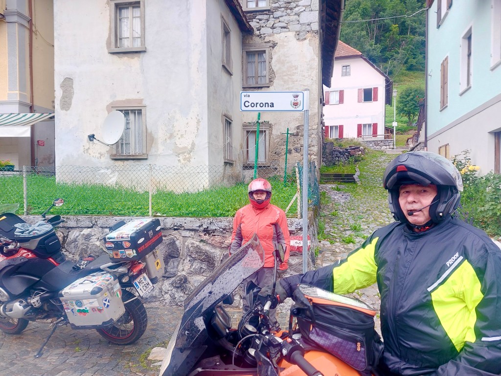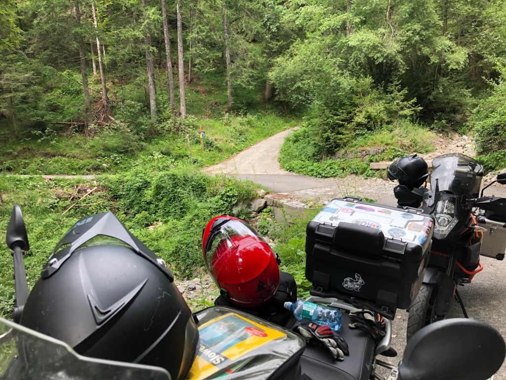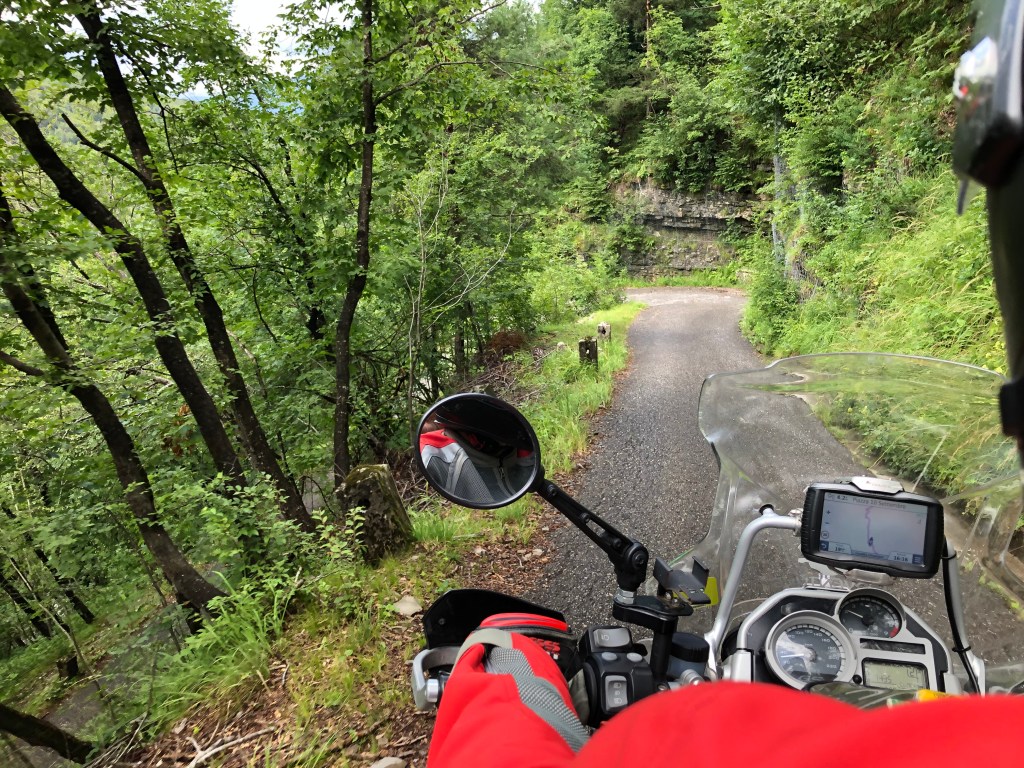Bei den nächsten Zielpunkten waren einige Selle (Sattel = weniger hohe Pass-Straße, um es einfach auszudrücken) am Programm. Gleich hinter Pontebba erreichten wir den Sella di Cereschialis. Von dort sollte es über Tolmezzo zum Sella Chianzutan gehen. Leider mussten wir uns beim Lidl in Tolmezzo unterstellen, weil wieder ein Mal ein mächtiger Regenschauer herunter prasselte. Also sicherheitshalber wieder die Trick-17-Regenhose angezogen, damit wir weiter fahren konnten. Irgendwo zweigten wir auf eine kleine schmale Straße ab. Die Kurven schmiegten sich an die Felswände. Es war super fein zum Fahren. Laut Navi waren wir am Zielpunkt Sella Chiampon angekommen. Klick, klick, Beweisfoto und schon kurvten wir weiter, denn eigentlich wollten wir den Monte Tenchia an dem Tag noch fahren. Doch Meister Garmin schickte uns in der Gegend herum. Irgendwie war der Einstieg nicht zu finden. Es war schon spät am Nachmittag. Die Mission Impossible muss vertagt werden.