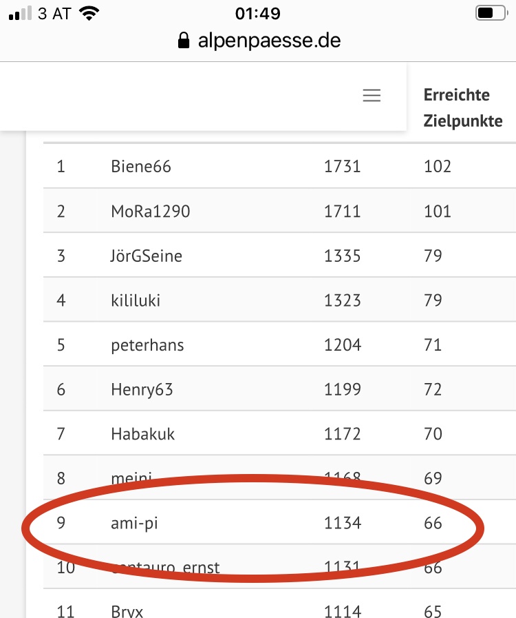 Wir sind durch und haben alle österreichischen Pässemarathonpunkte abgeholt. Damit liegen wir derzeit in der Rangliste auf Platz 9. Daumen hoch!