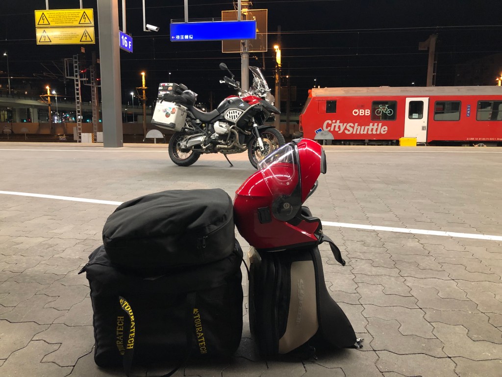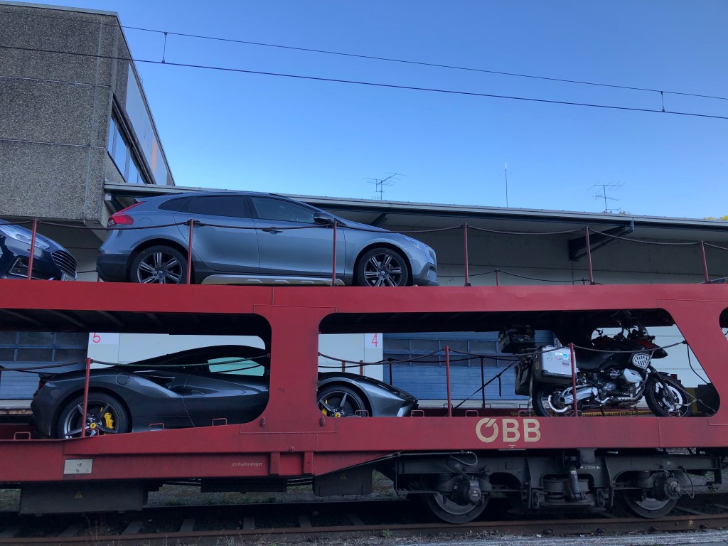 Ein Stück des Weges sparten wir uns und nahmen den Night-Jet-Autoreisezug bis Feldkirch/Vorarlberg. Das war ganz praktisch, erstens sparten wir den Materialverschleiss beim Bock, bei den Reifen, wir ersparten uns eine menge Kilometer und kamen halbwegs ausgeschlafen im Ländle früh am Morgen an.
