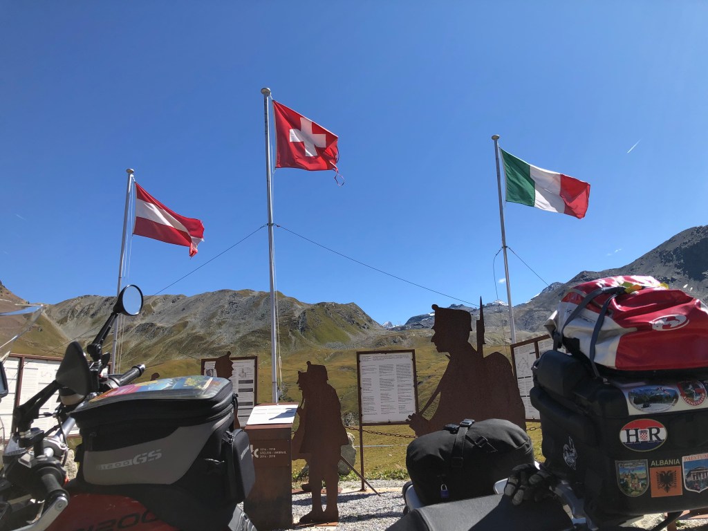 Die sehr kehrenreiche Umbrailpass-Straße wurde erst 1901 eröffnet und setzte die Tradition der schon seit Jahrhunderten benutzte Saumstraße fort. Diese wichtige Nord-Süd-Handelsrute wurde in der Folge von der Schweizer Armee weiter ausgebaut und genutzt. Heute wird der Pass fast nur noch von Auto- und Motorradtouristen als Zubringer zu der Stilfser-Joch-Straße genutzt. Wir haben es hautnahe erlebt. Echt viele Motorradkollegen und Fahrradenthusiasten wuselten den Berg hoch und auf der anderen Seite wieder runter und das Mitten in der Woche. Am Wochenende sollte man dieses Kurvenparadies wohl besser meiden.