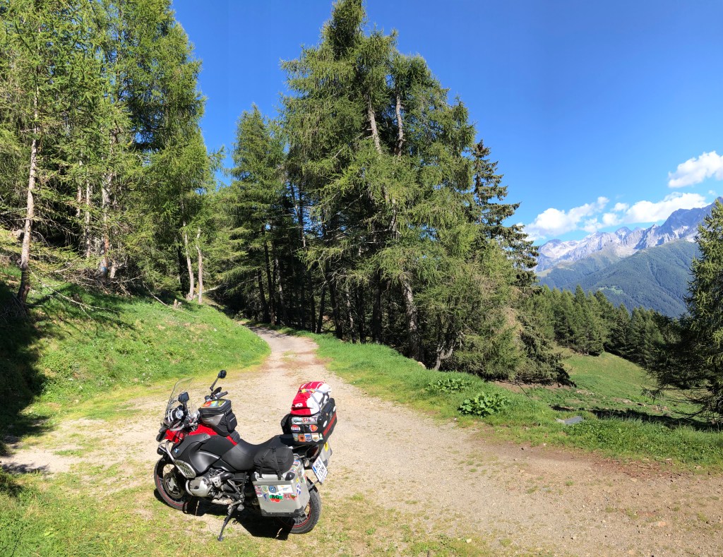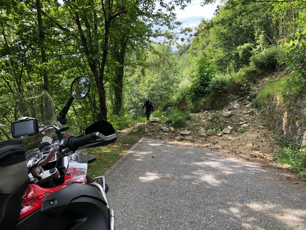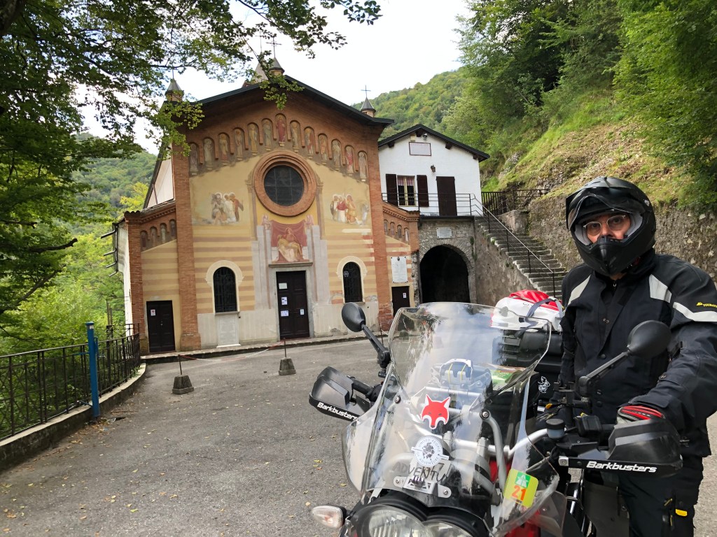 Diese beiden Marathonpunkte lagen etwas von einender entfernt. Also durfte sich Meister Garmin was ausdenken, wie man dort hin kommt. Die Tunnel von vorhin waren möglicherweise seine Inspiration, uns durch weitere Tunnel der Lombardei zu jagen, wobei sicher die Strasse entlang vom Lago Iseo landschaftlich schöner gewesen wäre. Das kann passieren, wenn Meister Bockchef dem Routenmeister freien Lauf lässt und keine zusätzlichen Wegpunkte eingibt! Unsere Lungen waren mit Abgasen und Baustellenstaub gut gefüllt. Hust, hust! Irgendwann erreichten wir doch den Einstieg zum Monte Stino. Eine sehr schmale Straße mit schlechtem Belag schlängelte sich den Berg hinauf. Gegenverkehr braucht man auf so einer Strecke nicht wirklich. War so schon so manche Haarnadelkurve grade breit genug, dass der Bock herum kam. Der Straßenplaner hat wohl einen kleinen Fiat 500 besessen. Trotz all der Mühen, der Monte Stino war geschafft. Meister Garmin hat scheinbar eine Alexa oder einen Siri zum Mithören von unserem Geschimpfe über die Miststrecke durch die Tunnel eingebaut. Denn – schau an – die nächste Etappe, die er sich ausgedacht hatte, war echt wild romantisch, ganz nach unserem Geschmack.