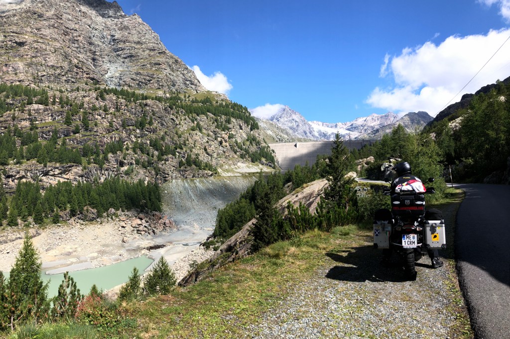 Den Bock und uns gleich mit, hat es in so einer Kurve umgeworfen. Das kann z.B. passieren, wenn man zu langsam fährt und die Kurven halt relativ eng sind. Es ist nix passiert, ausser ein paar blaue Flecken und ein paar Kratzer am Schurzbügel. Den Staub und die Blätter abgeschüttelt, ging es weiter rauf auf 2024m zur Staumauer Alpe Gera (1961-1964). Von der Ferne schon sah man den Ghiacciaio-Gletscher, der den gleichnamigen Lago mit Schmelzwasser speist. Dahinter liegt ein Gebirgsmassiv. Und es war einfach alles wieder „breathtaking“! Der Zielpunkt war erreicht. Los weiter zum nächsten Punkt, den Monte Stino.