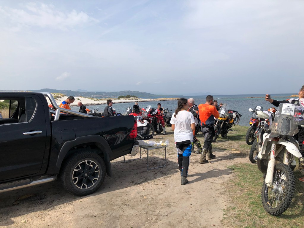 Um 8:00 war Treffpunkt in einem Cafe in Olbia. Eine Menge Hard-Enduro-Maschinen waren schon versammelt. Die Tour war aber für Big-Enduros ausgeschrieben. Mal sehen, ob sich noch eine blicken lässt, dachte ich. Alle waren in ihrem Erzberg-Rodeo-Outfit angetreten. Mir schwante Schreckliches. Ein Pärchen wurde gesichtet, aber auch die waren enduro-mäßig ausgestattet. Ein zweites Pärchen wurde dann auch noch gesichtet, die blieben aber auf der Straße, weil sein Motorrad vorab schon w.o. gegeben hatte, daher die Straßenvariante. Dann folgte die Einteilung der Gruppen: 1x „Erzberg hard“, 1x Enduro für Profis und 1 x Enduro für Neo-Profis, geleitet von Alessandro, der technisch gleich nach Chris Birch kommt. Seine Maschine wurde persönlich von Chris signiert. Die letzte Gruppe war dann auch unsere Gruppe. Die Spannung stieg. Unser Bock war auf alle Fälle das Schwergewicht unter all den Gefährten und mit uns beiden drauf, dann nochmals um einiges schwerer.