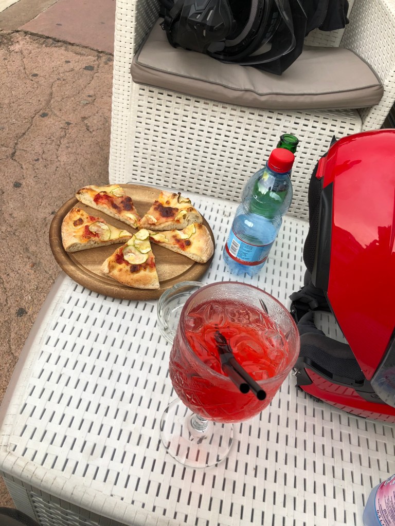 Mir kamen nach den ersten Kilometern, die gar nicht so schwierig waren, die ersten Zweifel, ob das das Richtige für uns ist. Es machte zwar Spass, wir fuhren manche Passagen stehend, es war ziemlich staubig und wir waren immer das Schlusslicht. Bei der alten Römerstraße ging es dann schon heftig zur Sache. Enge sandige Kurven, steil bergab und dann auch noch tiefe Furchen in den Kurven und felsiges Terrain. Und dann patsch, lagen wir schon da. Dong! Gott sei Dank war nichts Böses passiert. Erschrocken war ich aber schon. Lorenzo sammelte uns ein und Alessandro brachte den Bock in Sicherheit. Dankend nahm ich das Angebot an, mit einem der Begleitfahrzeuge (Jeep oder Furgone) weiter mit zu fahren. In der Mittagspause wurden noch die Boxen und das Top-Case abmontiert, damit der Bock-Chef mit ganz leichtem Gepäck weiter fahren konnte. Ich war froh über die Entscheidung, denn immerhin sind ja noch etliche Kilometer im Herbst geplant. Dafür braucht es einen gesunden Bock-Chef und einen heilen Bock. Sicherheit geht vor, so meine Devise für die beiden und für mich.