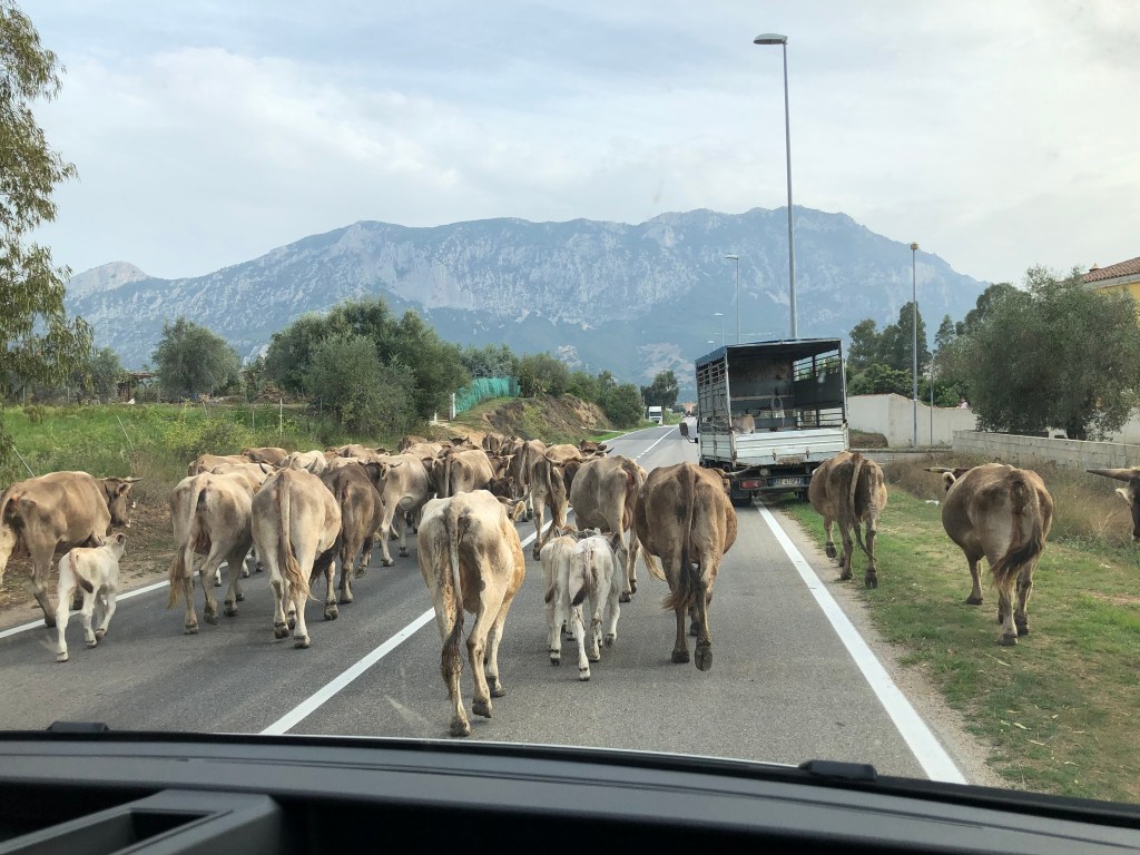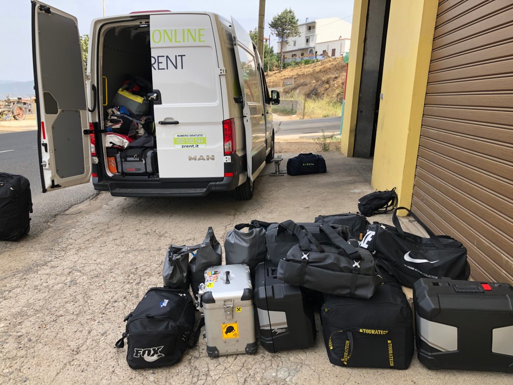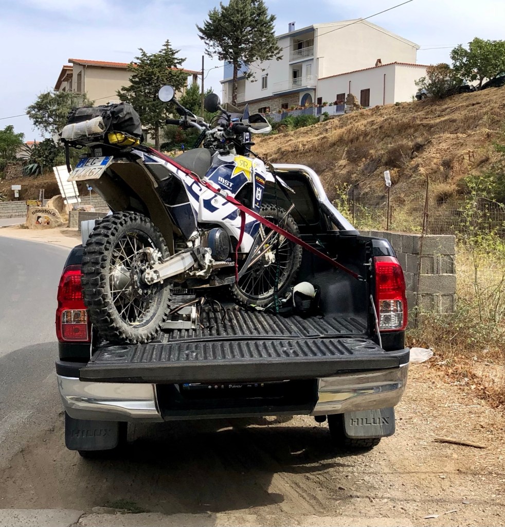 Nun, wie schon bekannt bin ich am ersten Tag gleich nachmittags in den Furgone* umgestiegen. Valentin, der Fahrer, sprach auch fliessend Englisch. So war die Verständigung gesichert. Er kündigte mir gleich (scherzhalber) an, dass das Unterhaltungsprogramm bei im im Lieferwagen kostenpflichtig sei. Nun denn, den Aufpreis musste ich in Kauf nehmen. Valentina mit dem Jeep gab gleich zu erkennen, dass sie nur Italienisch spreche. Also entschied ich mich für´s Erste im Furgone mitzufahren. Coole Musik und groovigen Drive gab es am Weg zum Hotel, bis das Telefon klingelte und wir kurz davor umdrehen mussten, um zurück zum Treffpunkt von der Mittagspause zu fahren. Ein Motorrad hatte den Geist aufgegeben und musste geborgen werden. Speedig ging es retour. Die kleine Enduro-Maschine von Massimo wurde auf den Jeep geladen und eine Werkstatt in der Nähe des Hotels gesucht, welche die Reparatur noch am gleichen Abend erledigen konnte, damit es am nächsten Tag weiter gehen kann. Alles erledigt, der Furgone und der Jeep rollten am Parkplatz in Gonone ein.