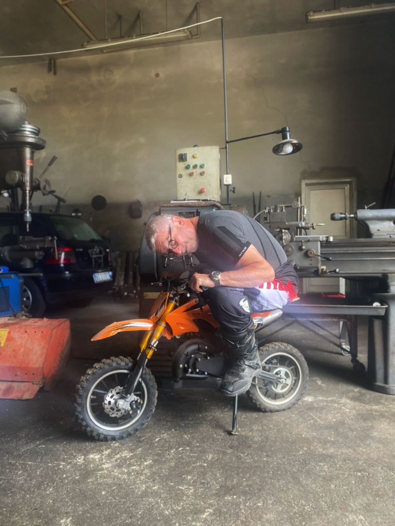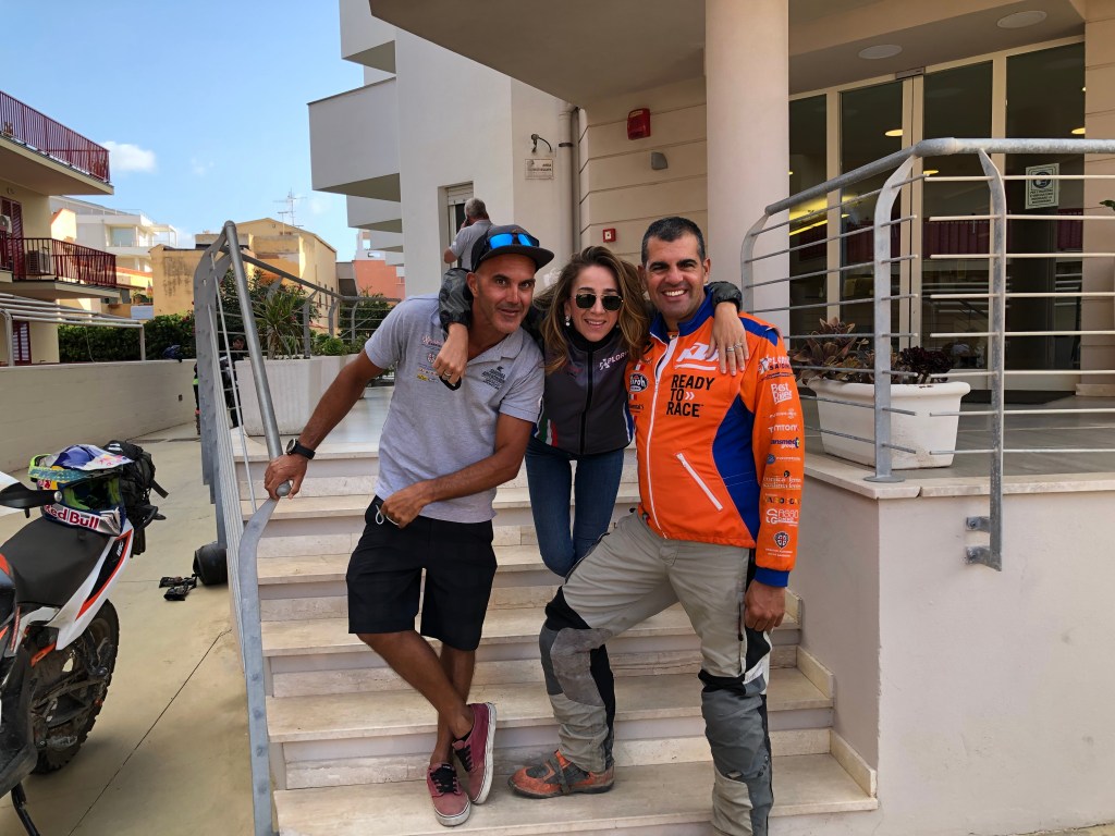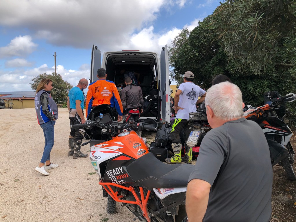 Roberto startete mit der intakten Maschine von Andrea, der sich leider eine Rippe angeknackst hatte, ins Gelände. Sein ramponiertes Gefährt landete wieder am Jeep. Mit Didis Maschine, festgeschnallt auch am Jeep, wurde der Servicedienst in Alghero angefahren. Es konnte nicht viel sein. Der Fachmann hatte das Problem gleich erkannt und behoben. Die Maschine wurde frei gelassen und Didi konnte mit den anderen die Tour fort setzen. Also eine Menge Rochaden, dass man da nur nicht durcheinander kommt. Ich glaube ich kenne jetzt ziemlich alle Werkstätten in Sardinien. Gott sei Dank haben Valentin und Valentina den Überblick behalten, wer und wessen Fahrzeug wann und wo war. Zum Abschluss wurde die Ersatzmaschine der Guides auch noch benötigt, weil sich Alessandro auf den letzten Kilometern noch einen platten Reifen eingefahren hatte. Also es war ziemlich turbulent aber auch urlustig beim Team Furgone. Danke Valentina & Valentin & Massimo (er war ja quasi unfreiwillig vom ersten Tag an im Furgone oder Jeep unterwegs).