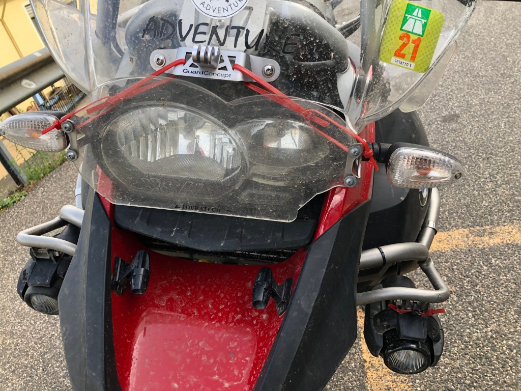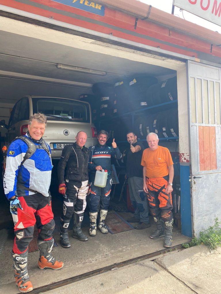 Es wird eng im Team Furgone. Didis Maschine will auch nicht mehr. Roberto beschliesst seine Maschine notdürftig zu reparieren, damit er wenigstens auf der Straße zum Hotel fahren kann und Platz für eine weiteres Motorrad am Jeep ist. Es gelang ihm. Er steckte ein Kabel irgendwo auf der Seite in die Eingeweide seiner Enduro, ein Funke und schon startete der Motor. Aber das Problem war jetzt, dass wir keinen Fahrer für den Furgone hatten, denn Valentin war mit dem Jeep unterwegs. Wenn wir auf ihn hätten warten müssen, hätten wir ganz viel Zeit verloren. Massimo wurde als Fahrer für den Furgone aktiviert, immerhin hatte er vor Jahren schon ein Mal ein Wohnmobil gesteuert. Roberto hielt sich im Windschatten des Furgone, damit wir ihn bei eventuellen Problemen noch aufnehmen hätten können. Mit den Sitzplätzen wäre es zwar etwas eng geworden, aber wo ein Wille, da auch ein Weg. Alle geborgen. Zwei Maschinen am Jeep. Roberto knatterte mit seiner geflickten Enduro in die Hoteleinfahrt. Ein paar Reifen wurden noch in der Nacht gecheckt. Alles super!