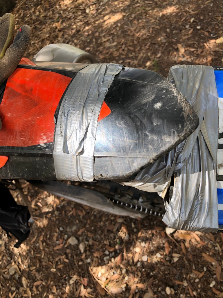 Massimos Maschine und Massimo wurde zum Dauerbegleiter im Team Furgone. Keine Chance seine Enduro wieder zu beleben. Ich war ja nur Halbtagesgast beim Begleitdienst. Robertos Maschine hat die Seitenverkleidung verloren, daher war offroad nicht mehr so ratsam, neuer Fahrgast auf und im Jeep. Noch zur Erklärung, wie die Begleitfahrzeuge funktionieren. Jeep-Pick-Up und Furgone fahren parallel auf der Straße zum Track. Wenn es irgendwo im Gelände ein Problem gibt, startet der Jeep ins Gelände und holt Maschine und Mann dort ab. Der Furgone wartet irgendwo und je nach Sachlage wird herumgeladen, was das Zeug hält, zur Werkstatt gefahren, zum Hotel gefahren, was auch immer nötig ist. Langsam wird es kompliziert mit den Plätzen in den Fahrzeugen für Mann und Maschinen. Im Fugone ist nämlich noch eine Ersatzmaschine für die Guides festgeschnallt. Ich fahre einfach mit Valentina mit. Ist für mich ja auch ein gutes Italienisch-Training.