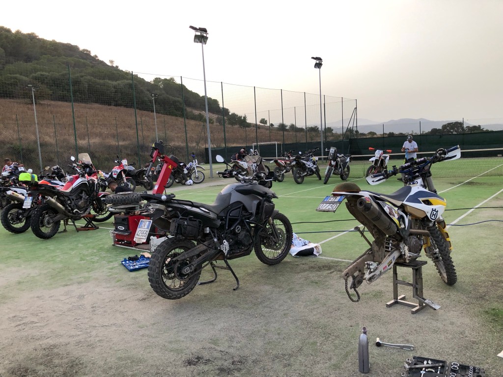 Am Abend gab es am Tennisplatz beim Hotel für alle, die neue Reifen brauchten, ein professionelles Serviceteam zum Reifenwechsel. Toll organisiert von Exploring Sardinia.