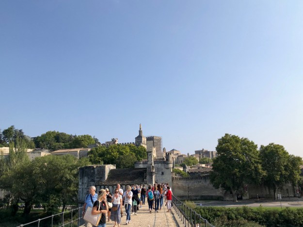 Für mich hat niemand die Bekanntheit der Stadt so gefördert wie Mireille mit dem alten Lied „Sur le Pont d´Avignon“. Die ersten belegten Texte dazu stammen angeblich aus dem 15. Jahrhundert. Die Brücke führte damals über die Rhone zu den Vergnügungsinseln, die sich mitten im Fluß befanden. Mit dem Lied wird auf das Tanzen und die Geselligkeit angespielt. Das Lied hat sich überall hin verbreitet. Es wurde auf jeder Hochzeit gesunden. Man hat den Eindruck, es gibt niemanden, der das Lied in Frankreich nicht kennt.