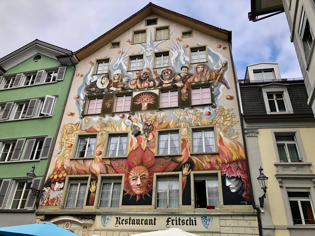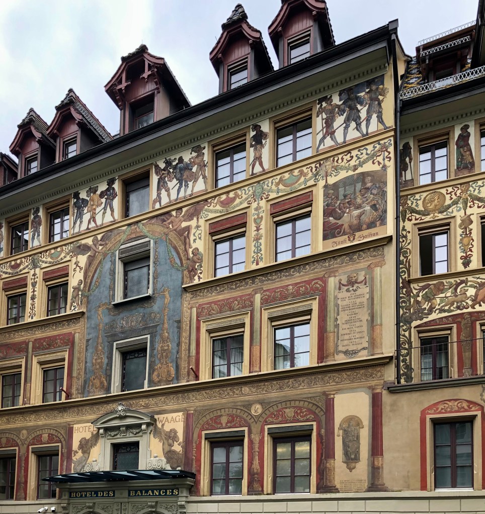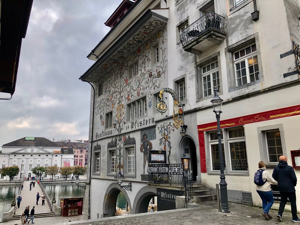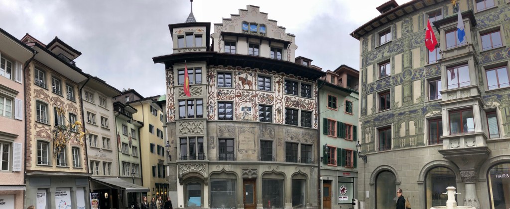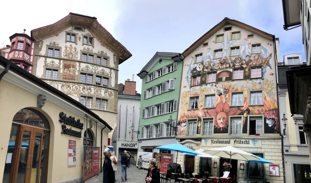 Weiter ging es zur einzigartigen Kapellbrücke, die über die Reuss führt. Sie wurde nach dem Brand 1993 wieder in Stand gesetzt. Einige der kostbaren Bilder aus dem 17. Jahrhundert blieben damals von den Flammen verschont. Sie wurden wieder im Dach angebracht. Die Brücke ist demnach ein kostbares Open-Air-Museum. An den Brückengeländern hängen 268 Blumenkästen, soviel für die Botaniker unter der Leserschaft. Diese Brücke ist angeblich das meist fotografierte Objekt der Schweiz, vor allem wenn die asiatischen Reisegruppen wieder kommen.  Wir erfuhren in der Stadt etwas über den Fritschi, den Urfaschingsnarren der Schweiz. Karneval ist scheinbar ganz ein wichtiges Ereignis im Jahreskalender der Eidgenossen. Der LutzKaffä geht angeblich auf diese Figur zurück. Aber dazu kommen wir noch später.  In der Altstadt gibt es wunderschöne bemalte Fassaden der ehemaligen Zunfthäuser zu bestaunen. Richard Wagner weilte auch gerne bei der wohlhabenden Gesellschaft in der Schweiz. Sein Stammlokal, wo der Bayernkönig Ludwig II immer die Zeche bezahlen musste, ist heute natürlich fest in chinesischer Hand.
