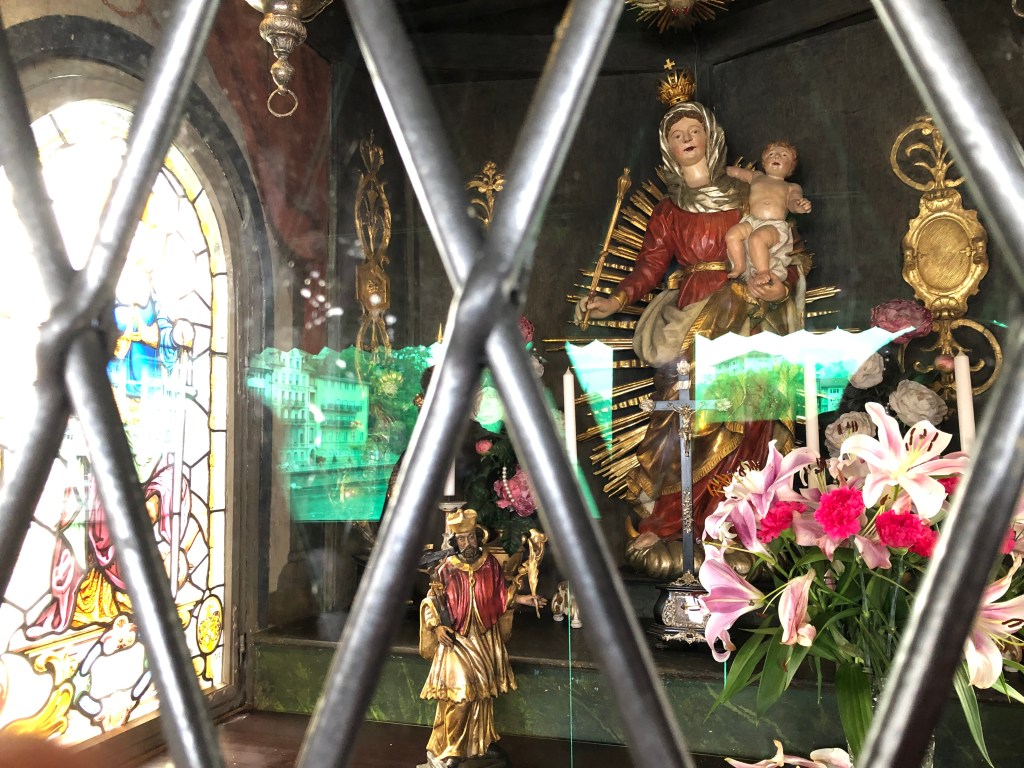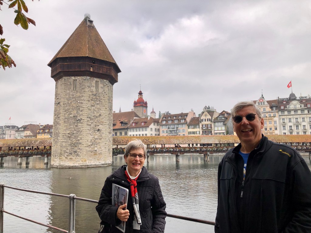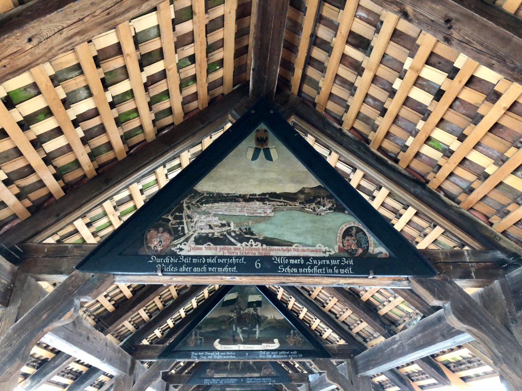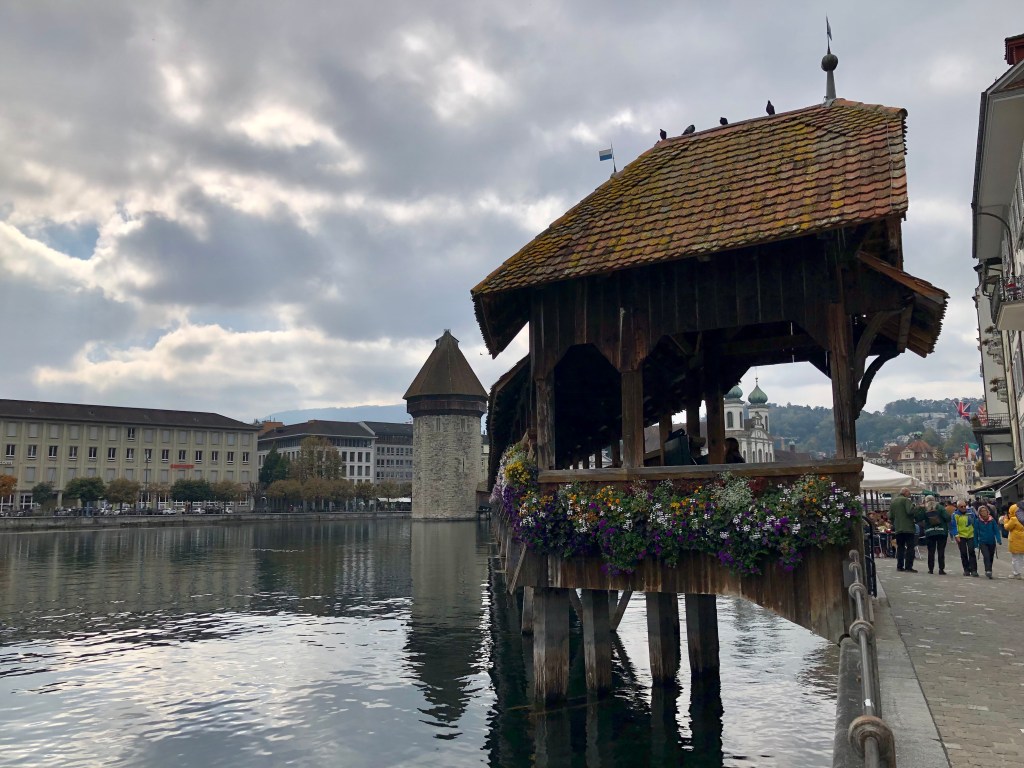 Weiter ging es zur einzigartigen Kapellbrücke, die über die Reuss führt. Sie wurde nach dem Brand 1993 wieder in Stand gesetzt. Einige der kostbaren Bilder aus dem 17. Jahrhundert blieben damals von den Flammen verschont. Sie wurden wieder im Dach angebracht. Die Brücke ist demnach ein kostbares Open-Air-Museum. An den Brückengeländern hängen 268 Blumenkästen, soviel für die Botaniker unter der Leserschaft. Diese Brücke ist angeblich das meist fotografierte Objekt der Schweiz, vor allem wenn die asiatischen Reisegruppen wieder kommen.  Wir erfuhren in der Stadt etwas über den Fritschi, den Urfaschingsnarren der Schweiz. Karneval ist scheinbar ganz ein wichtiges Ereignis im Jahreskalender der Eidgenossen. Der LutzKaffä geht angeblich auf diese Figur zurück. Aber dazu kommen wir noch später.  In der Altstadt gibt es wunderschöne bemalte Fassaden der ehemaligen Zunfthäuser zu bestaunen. Richard Wagner weilte auch gerne bei der wohlhabenden Gesellschaft in der Schweiz. Sein Stammlokal, wo der Bayernkönig Ludwig II immer die Zeche bezahlen musste, ist heute natürlich fest in chinesischer Hand.