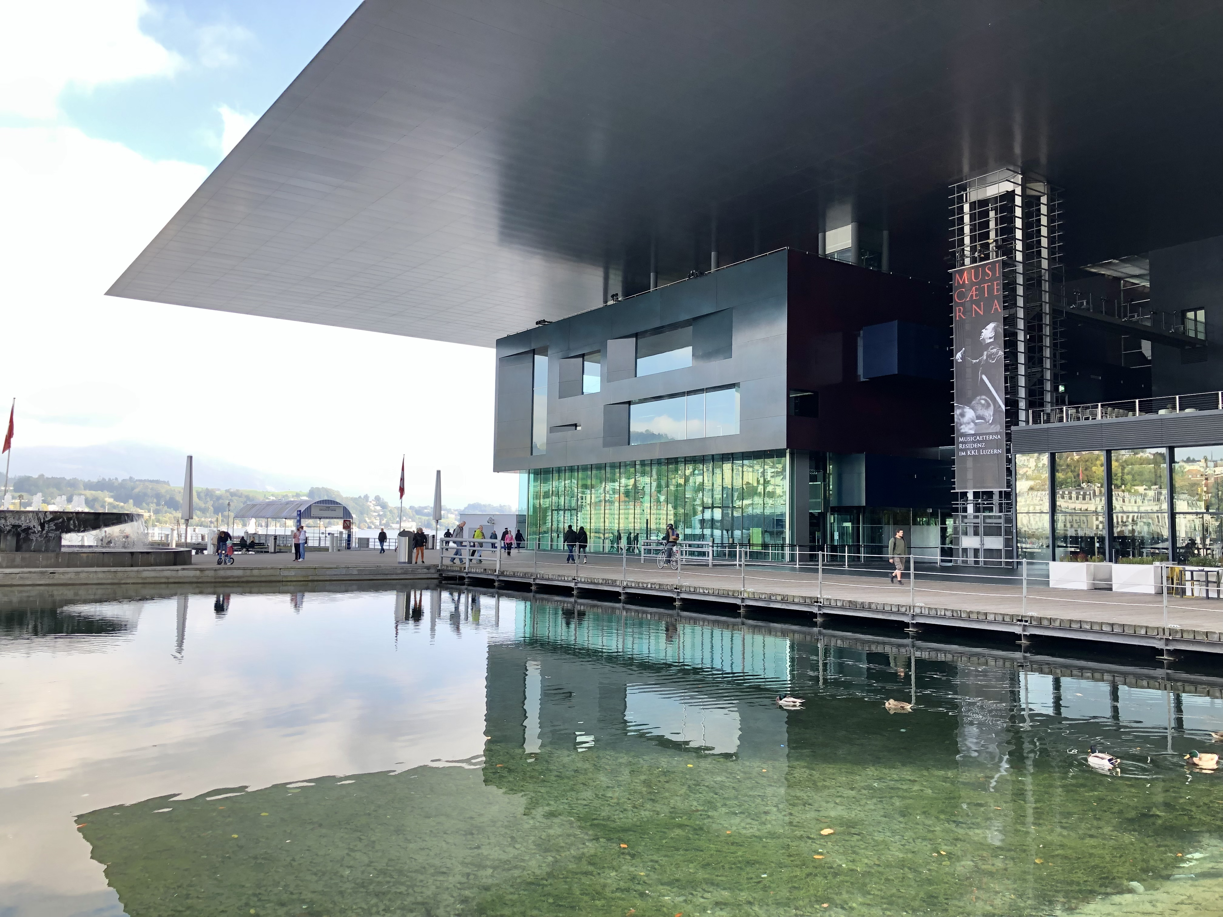 Rita macht jeden Sonntag eine Stadtführung für das Tourismusamt in Luzern. Da haben wir uns angeschlossen. Mangels anderer Teilnehmer kamen wir in den Genuss einer privaten Tour. Wir starteten beim Kultur- und Kongresszentrum Luzern (KKL) am Vierwaldstätter-See, das 1998 eröffnet wurde. Die Pläne stammen von dem französischen Architekten Jean Nouvel, dem wir bereits bei der Fassade der Oper in Lyon begegnet waren. Die Idee für Luzern war, einen Konzertsaal, ein Museum und ein Veranstaltungszentrum unter einem Dach zu vereinen. Die architektonische Klammer mit der umgebenden Landschaft, sprich Wasser, erreichte er durch die Einbindung des Elements in den Bau. Zwei lange Wasserbecken ziehen sich durch das ganze Haus und vor der dem See zugekehrten Hauptfassade ist ein Bassin eingelassen und ein Springbrunnen installiert. In dem weit vorkragenden Dach spiegelt sich je nach Lichtverhältnissen der See. Noch zur Qualität des Hauses, der Konzertsaal verfügt über eine unglaubliche Akustik und ist daher bei weltberühmten Künstlern sehr gefragt.