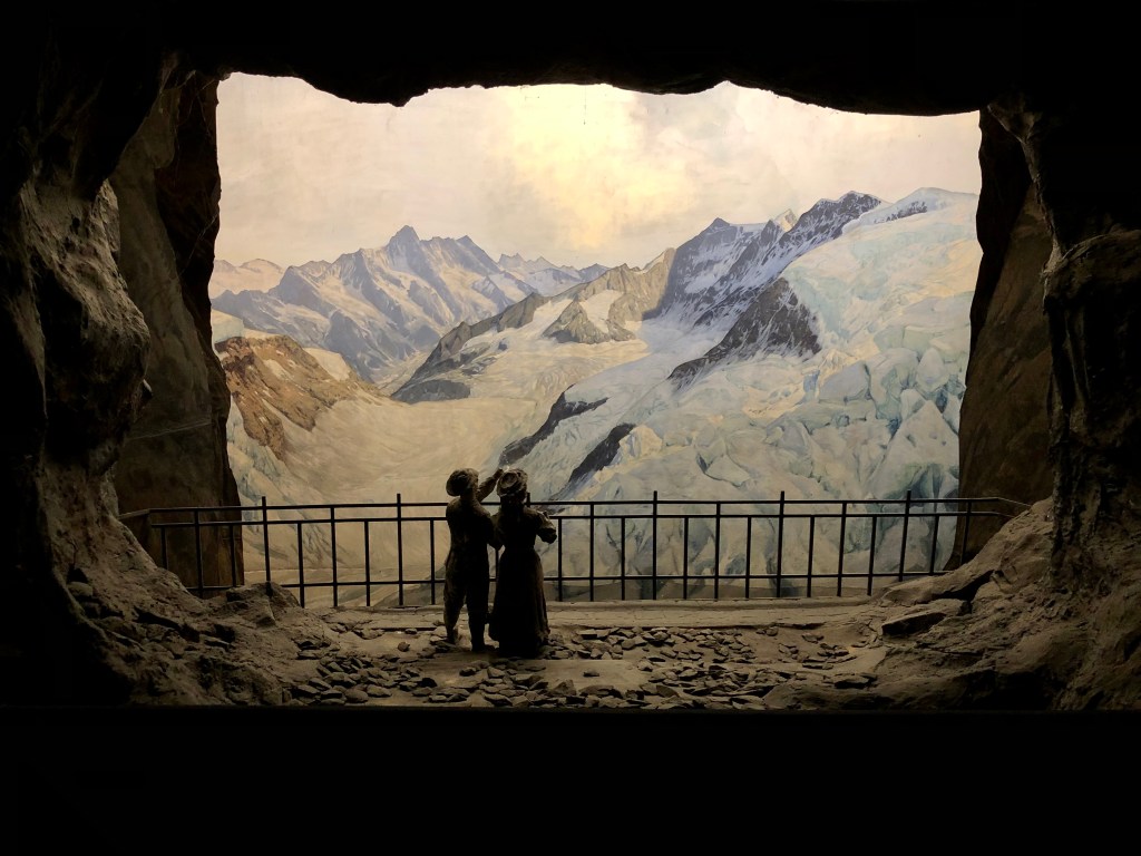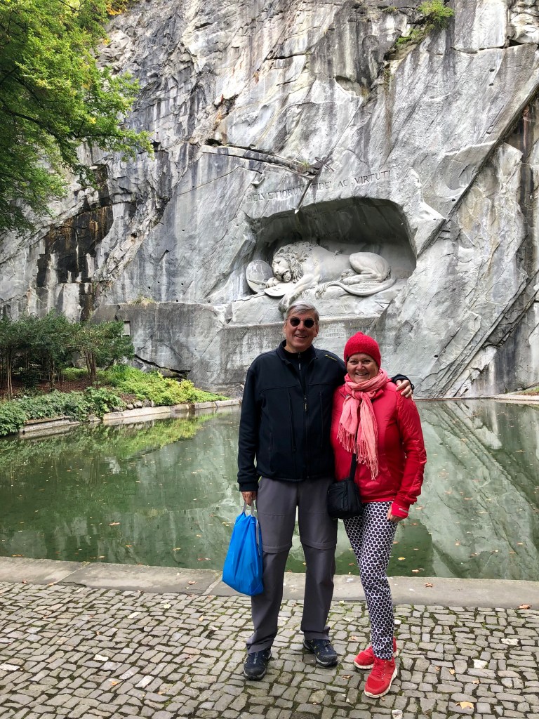 Es war ein aufschlussreicher interessanter Spaziergang, der beim Löwendenkmal endete. Dieser „Löwe von Luzern“ gilt als Gedenkstätte an die 1792 beim Sturm der Tuilerien in Paris gefallenen 800 Schweizergardisten. Der Kommandant der Truppe, Offizier Karl Pfyffer von Altishofen war zum Zeitpunkt des Revolution auf Urlaub in Luzern. Jedoch der Verlust seiner Waffengefährten ging ihm sehr nahe, so dass er den berühmten dänischen Künstler Bertel Thorvaldsen mit der Gestaltung eines würdigen Denkmals beauftragte. 1821 wurde der „sterbende Löwe“ eingeweiht. Der amerikanische Schriftsteller Mark Twain sagte angeblich darüber: „ Der Löwe von Luzern ist das traurigste und bewegendste Stück Stein der Welt.“ Es könnte hin kommen. Rita schwärmte auch von dem weit über 100 Jahre alten 3D-Alpendiorama, das gleich vis a vis vom Löwen in einem klassizistischem Rundbau untergebracht ist. Riesige Diarama-Gemälde mit gestaltetem Vordergrund zeigen die schönsten Gebirgsregionen der Schweiz in einer verblüffenden dreidimensionalen Darstellung. Die Szenen sehen aus wie in einem riesigen Guckkasten. Ein Diorama war quasi der Vorläufer der heutigen Massenmedien Kino und Fernsehen. Es war lustig in diese Erlebniswelt von damals einzutauchen. Um die Finger wieder aufzuwärmen, probierte ich den hochprozentigen LutzKaffä. Muss schon sagen, der heizt richtig ein. Und das geistreiche Lozärner Rägetröpfli schmeckte auch gut dazu.