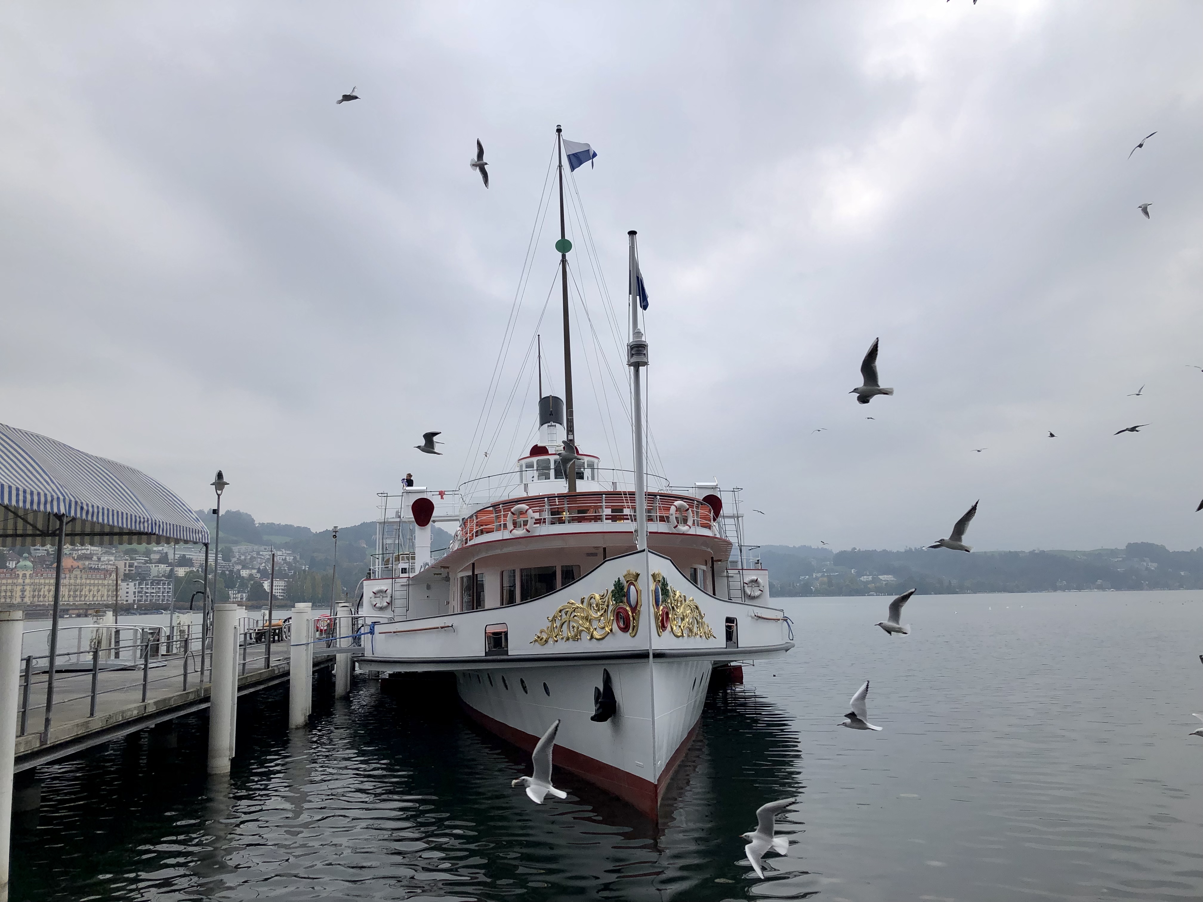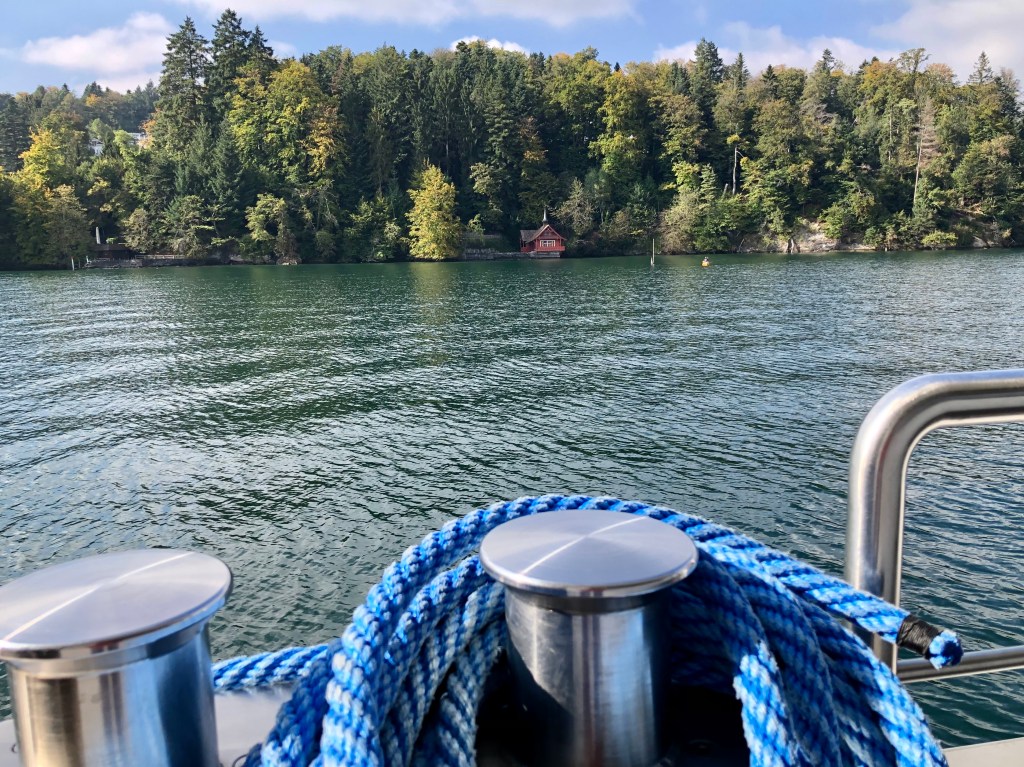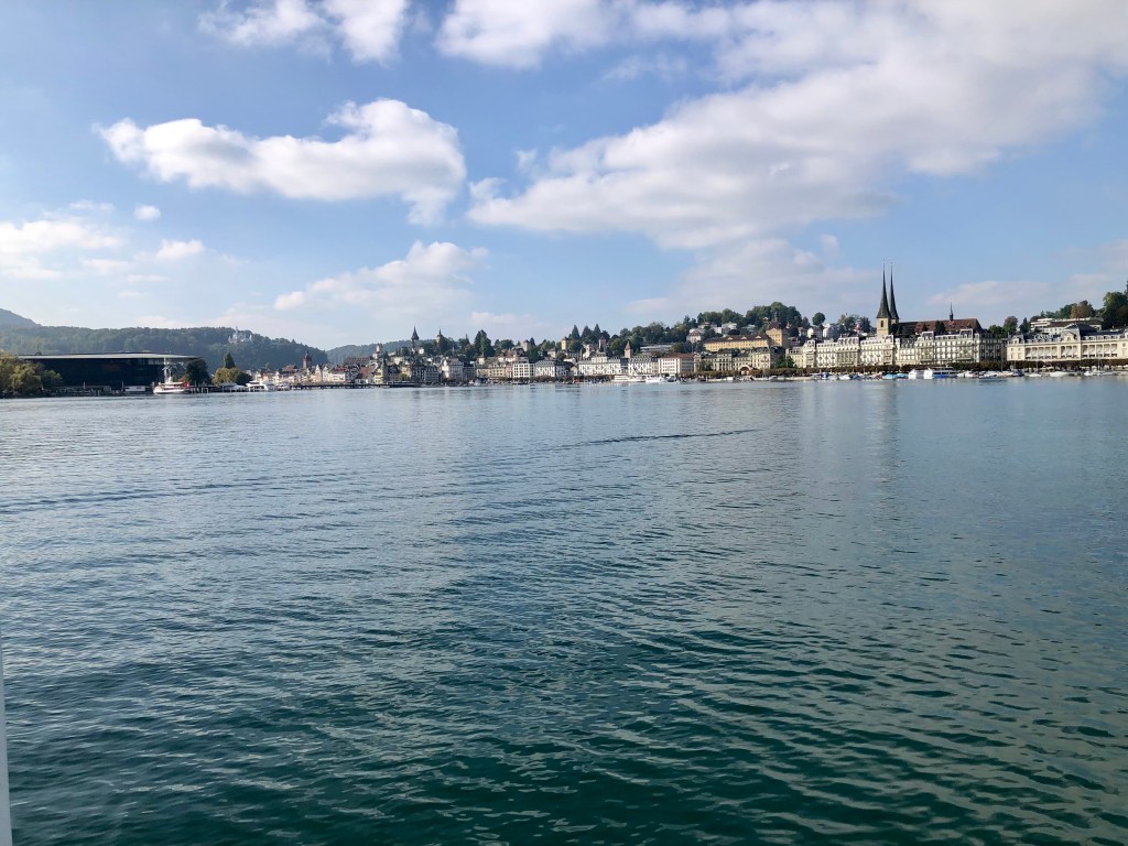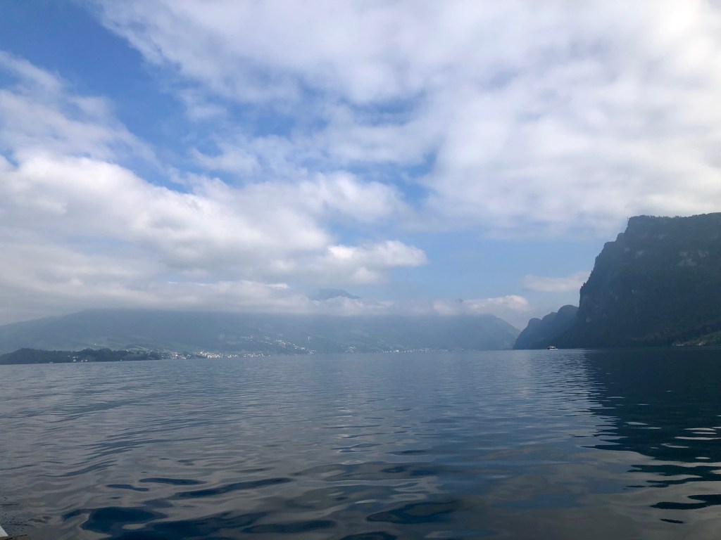 Die Hausberge Rigi und Pilatus von Luzern versteckten sich noch immer in den Wolken, also war nix mit tollen Ausblicken. Wir beschlossen daher mit dem Ausflugsschiff am  Nachmittag einwenig auf dem Vierwalsstätter-See herum zu schippern. Die Sonne kämpfte sich langsam durch, was beim Einlaufen in die Bucht von Luzern ein wunderschönes Stadtpanorama her gab.  Die Schweizer Franken flutschen an dem Tag nur so durch die Finger, daher deckten wir uns im Supermarkt am Bahnhof mit Proviant ein und pilgerten mit unserem Picknick zurück zum Hotel.