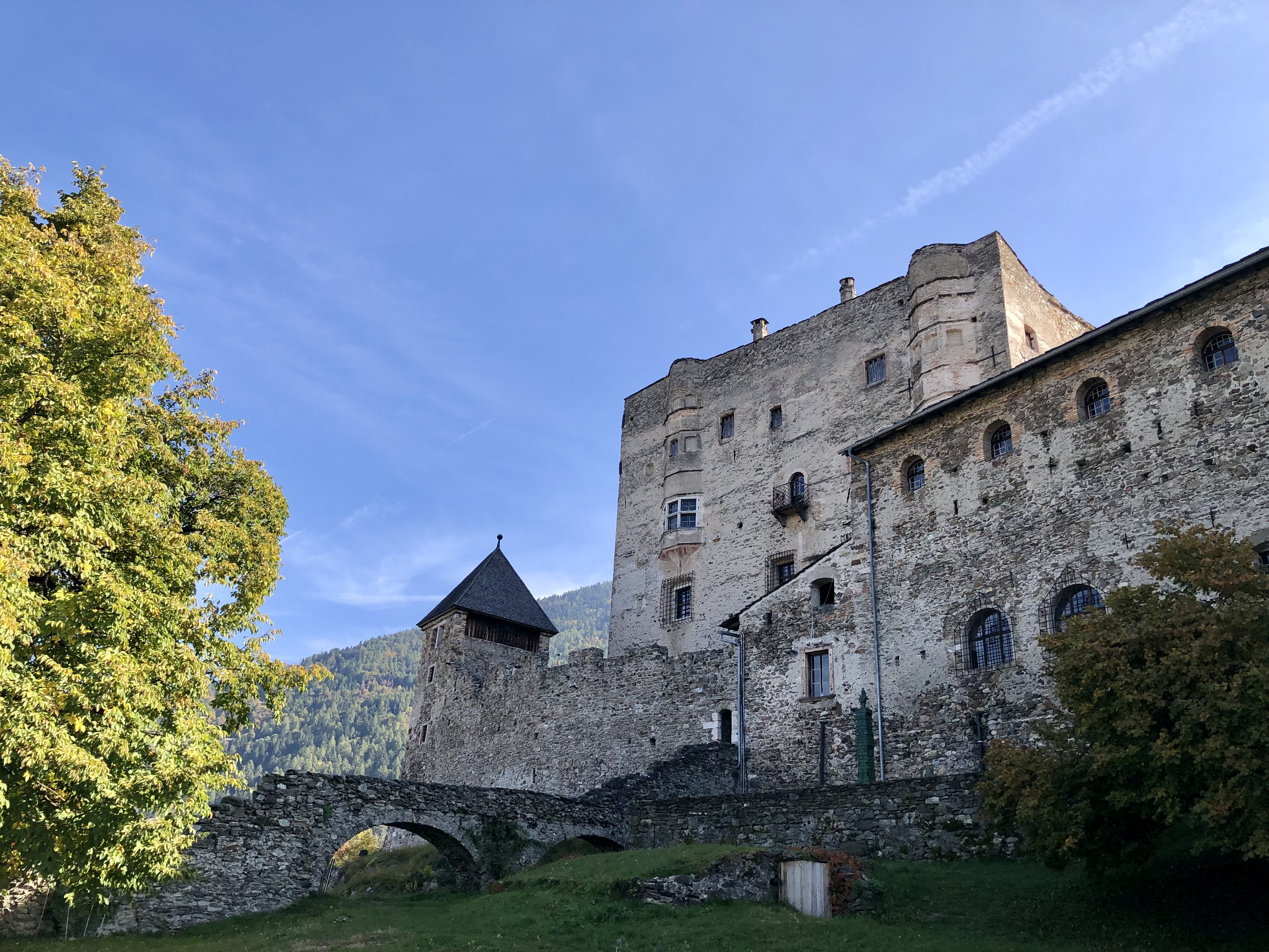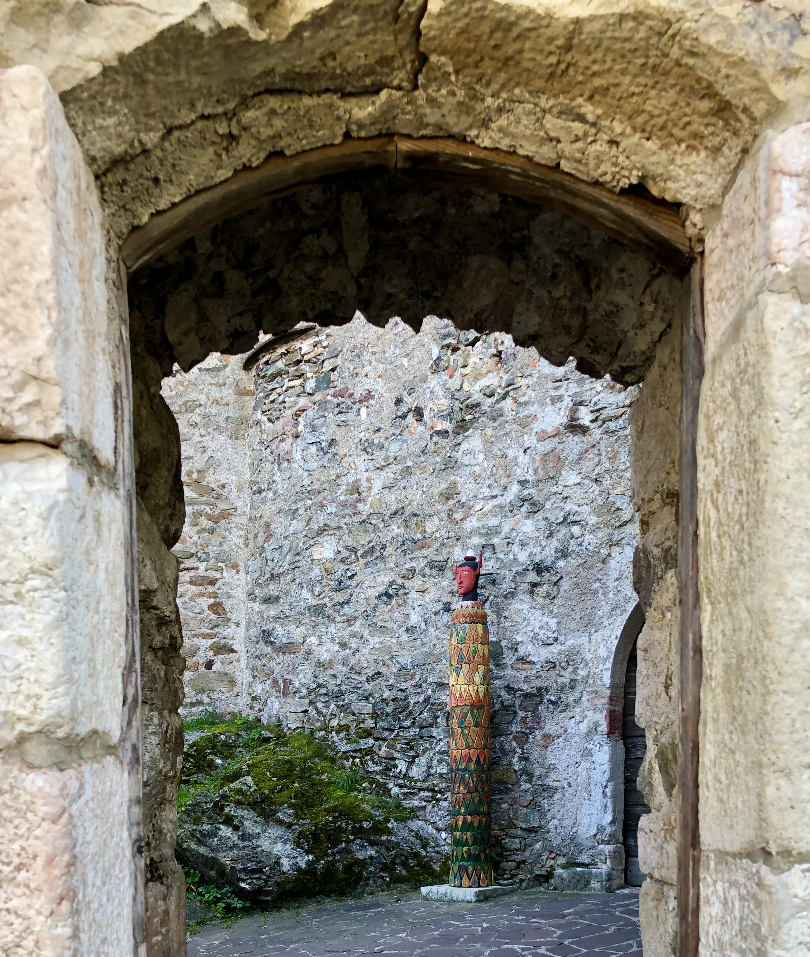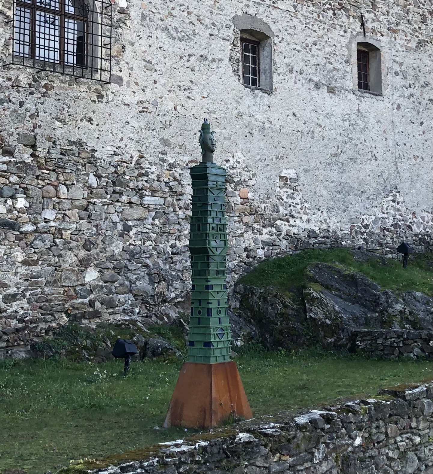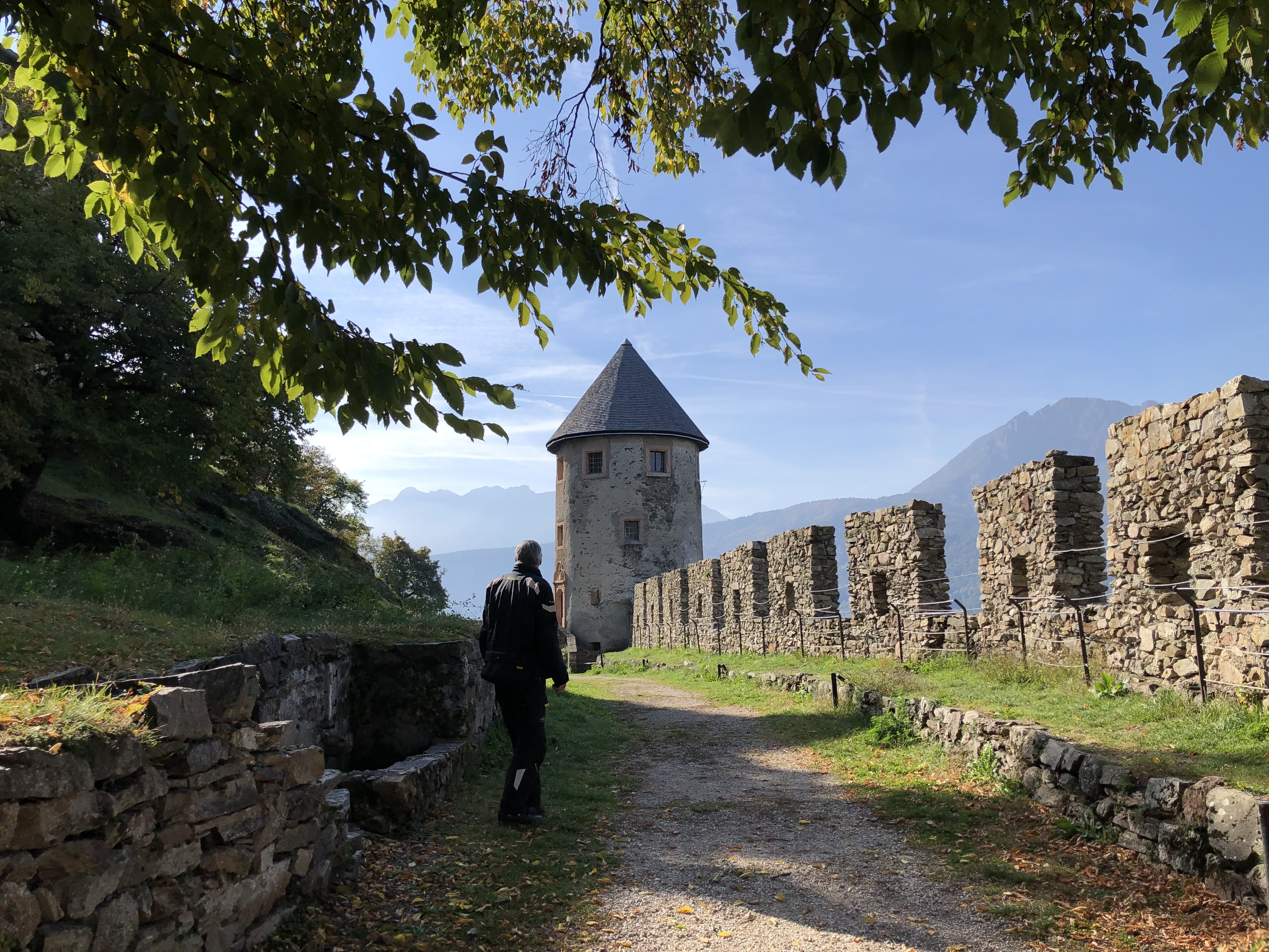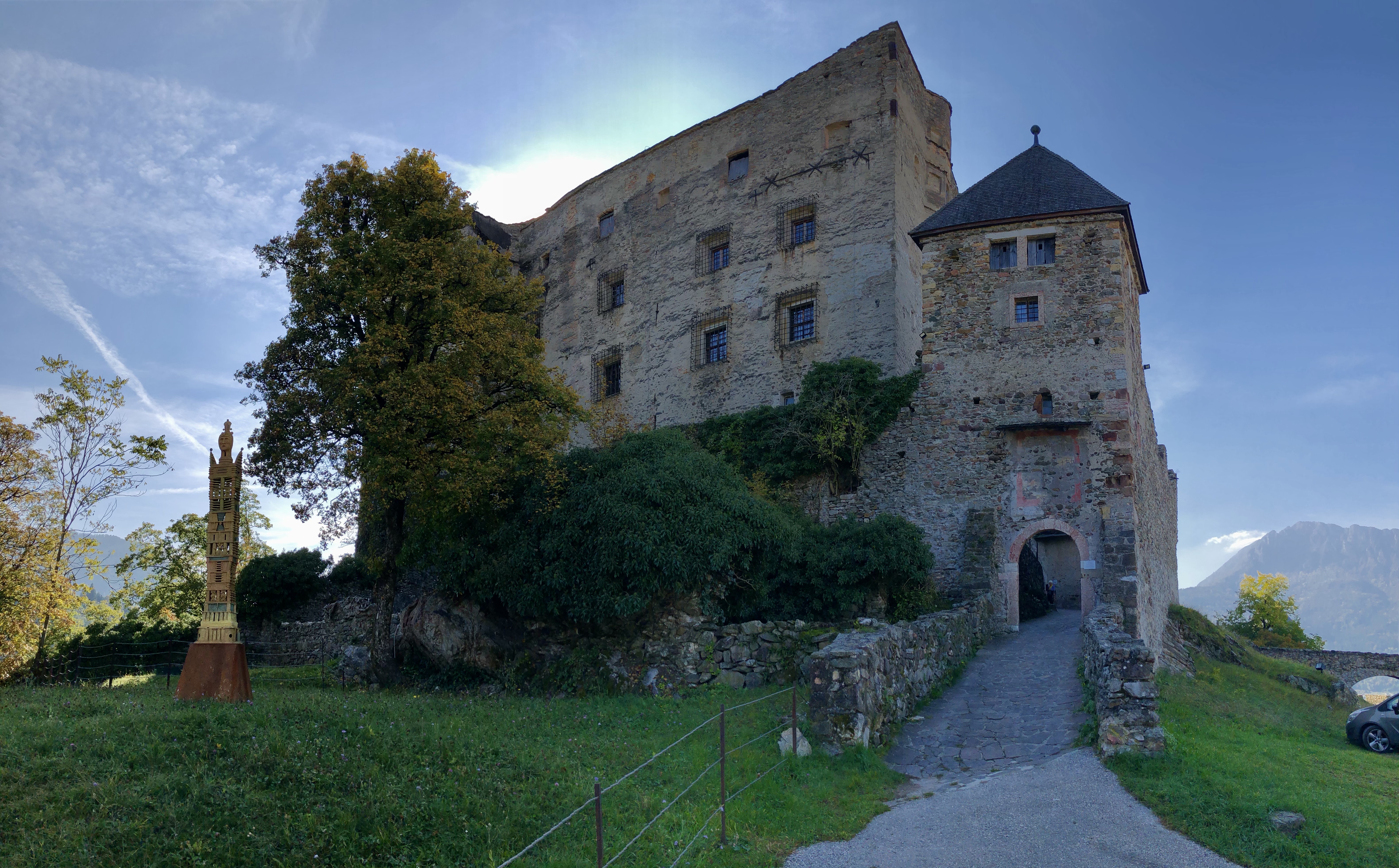 Wenn man für mehrere Tage ein Basecamp hat, fährt man meistens die ersten Kilometer die gleichen Strecken los bis man eine andere Richtung einschlägt. Das riesige Castello di Pergine, das nur wenige Kilometer vor Trient auf einem Hügel liegt, hatten wir schön öfter von der Ferne gesehen. Diesmal fuhren wir nicht vorbei. Die imposante mittelalterliche Burg gehörte während der Herrschaft von Margarethe Maultasch und später von Maximilian I., den Tiroler Fürsten. 1531 ging sie in den Besitz des Trentiner Fürstbischofs über, eine wechselhafte Geschichte. Seit 1900 kümmert sich eine Gesellschaft um den Bau, der heute als Hotel und Veranstaltungszentrum genutzt wird. Nachdem schon Saisonschluss war, lag das Hotel bereits im Dornröschenschlaf, so dass wir nur die Skulpturenausstellung „Torri“ (Türme) von Pietro Weber im äußeren Burghof anschauen konnten.