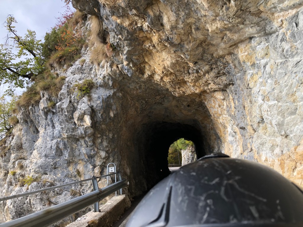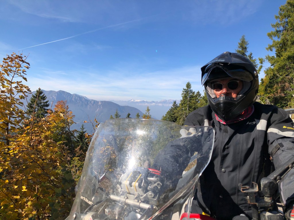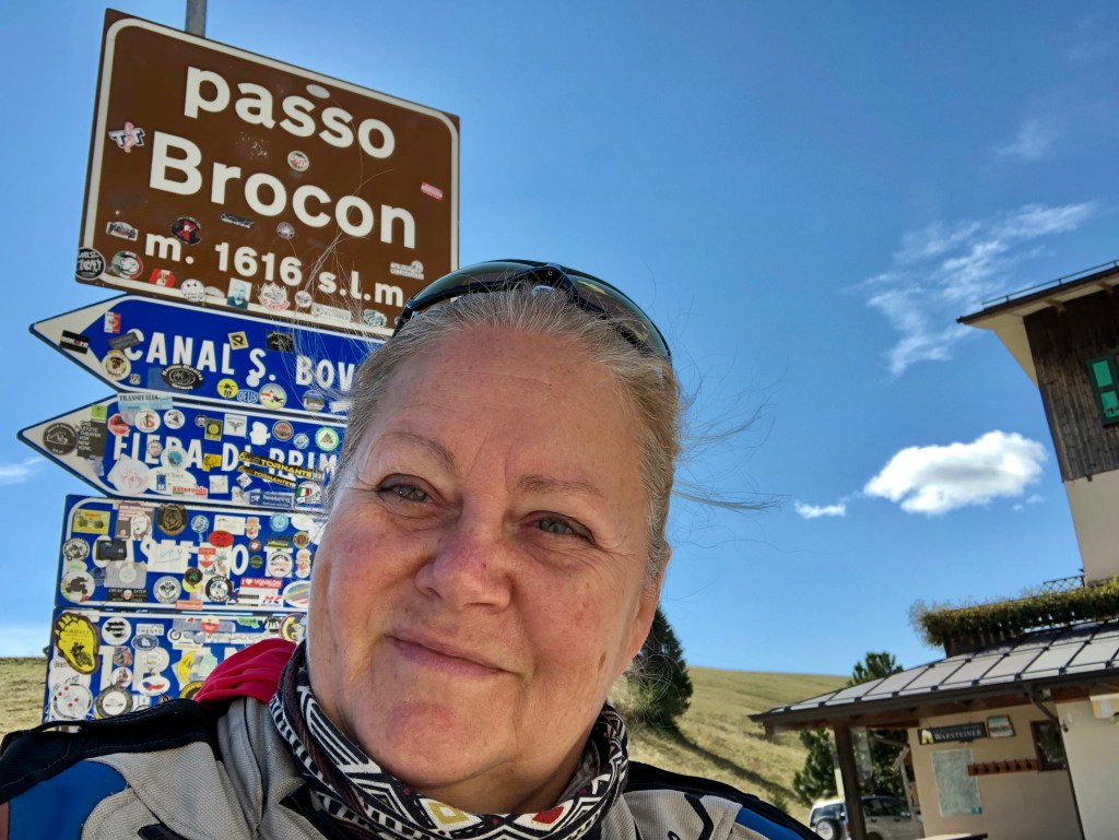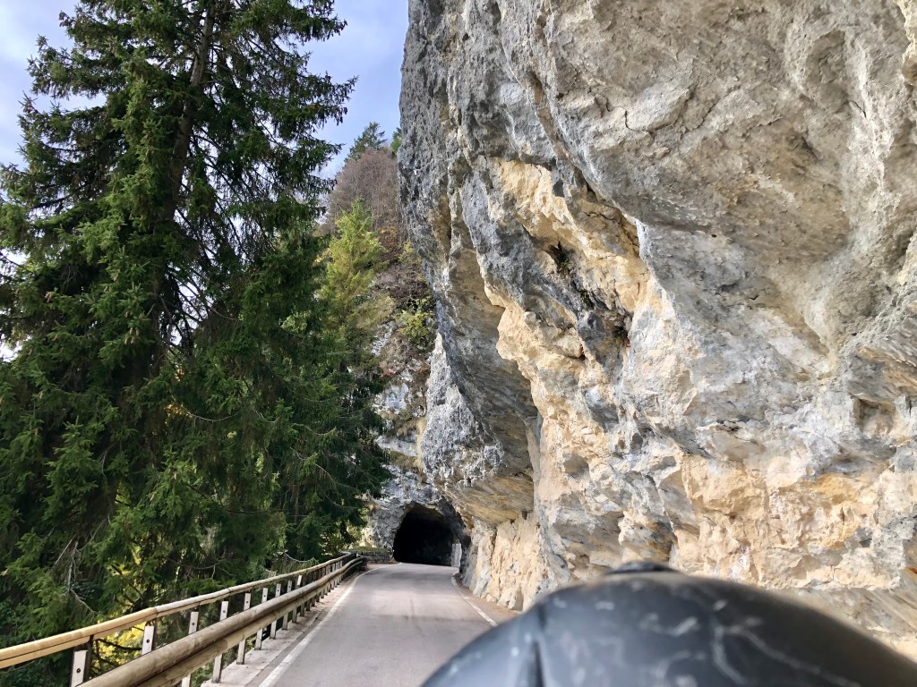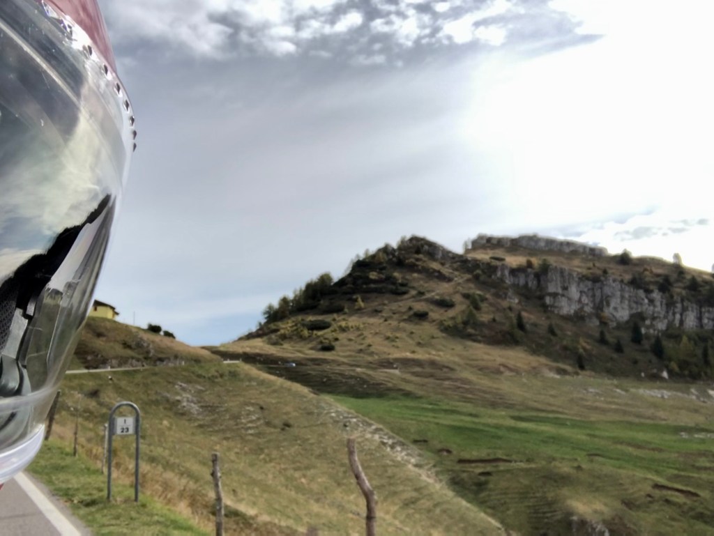 Der Abstecher war zwar nicht fix geplant, aber der sonnige Tag war zu verlockend, um die wunderbar 45 km lange schön ausgebaute kurvige Straße auf den Passo Brocon auf 1.616 m rauf zu wedeln. Es ist trügerisch, wenn die Sonne so durch die Bäume blinzelt und man sich den Berge hoch schraubt. Höchste Vorsicht ist bei Fahren angebracht, denn in schattigen Kurven kann es trotzdem schon glatt sein. Wir hatten so eine Situation. Glücklicherweise hat uns ein vorausgefahrener Autofahrer durch Winken und ein Pannendreieck rechtzeitig gewarnt, weil ein Auto auf der Eisplatte hinter der Kurve ins Schleudern gekommen war. Auch der Lenker des Unfallautos hatte viel Glück, dass er auf der hangseitigen Böschung hängen geblieben war und sich nicht überschlagen hatte. Auf der Passhöhe haben alle oben angekommen Motorradfahrer mal tief durchgeatmet, denn das hätte ohne die Warnung ins Auge gehen können.