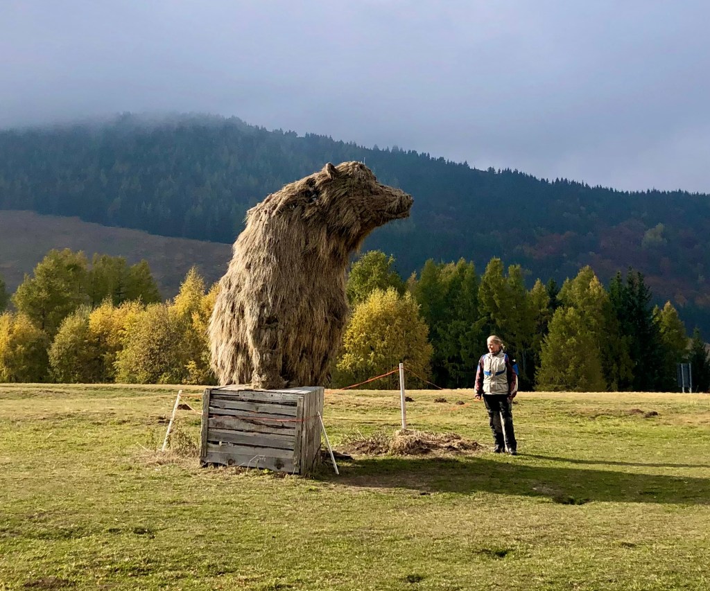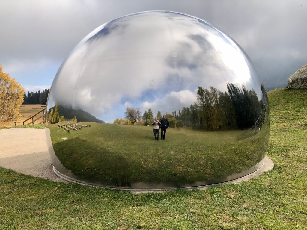 Scheinbar war Entdeckung angesagt. Eine Burg, noch eine Skulpturenschau hatten wir schon. Ich war schon gespannt auf die nächste Bergstrecke. Der Monte Bondone ist der Hausberg von Trient und liegt westlich der Stadt. Auch er gehört zur Gebirgsgruppe der Gardaseeberge. Auf einer Strecke von 17,3 km mit 140 Kurven  findet im Juli hier jährlich das Autorennen Trento-Bondone statt. Es ist die längste Bergrennstrecke Europas. Den Gummiabrieb von den Bremsmanövern konnte man in den Kurven noch immer gut sehen. Nach einer Pause im Vorjahr wurde heuer wieder das Rennen für die Motorsportfreunde ausgetragen. Wir sind natürlich kein Rennen gefahren. So ziemlich alleine unterwegs, hatten wir auch keine Konkurrenz an dem Tag, mit der wir uns messen hätten können :-). Oder vielleicht waren wir so schnell, dass uns keiner eingeholt hat? *grgrgr* Auf alle Fälle, die 140 Kehren bis auf eine Höhe von 1.650m gingen ganz schön rein. Das war wie bergauf Schi fahren. Von dort ging es weiter zum Viote-Hochplateau, wo uns zwei merkwürdige Objekte einbremsen ließen. Die Landartskulptur „Der Bär mit dem Koffer“ und die spiegelnde silberne Halbkugel der Terrazza delle Stelle, ein Observatorium, hatten wir hier nicht erwartet. Nachdem wir alles gründlich inspiziert hatten, pilgerten wir über einen Schleichweg nach Levico Terme zurück, denn in wenigen Tagen  müssen auch wir unsere Koffer packen, wie der Bär. 😦