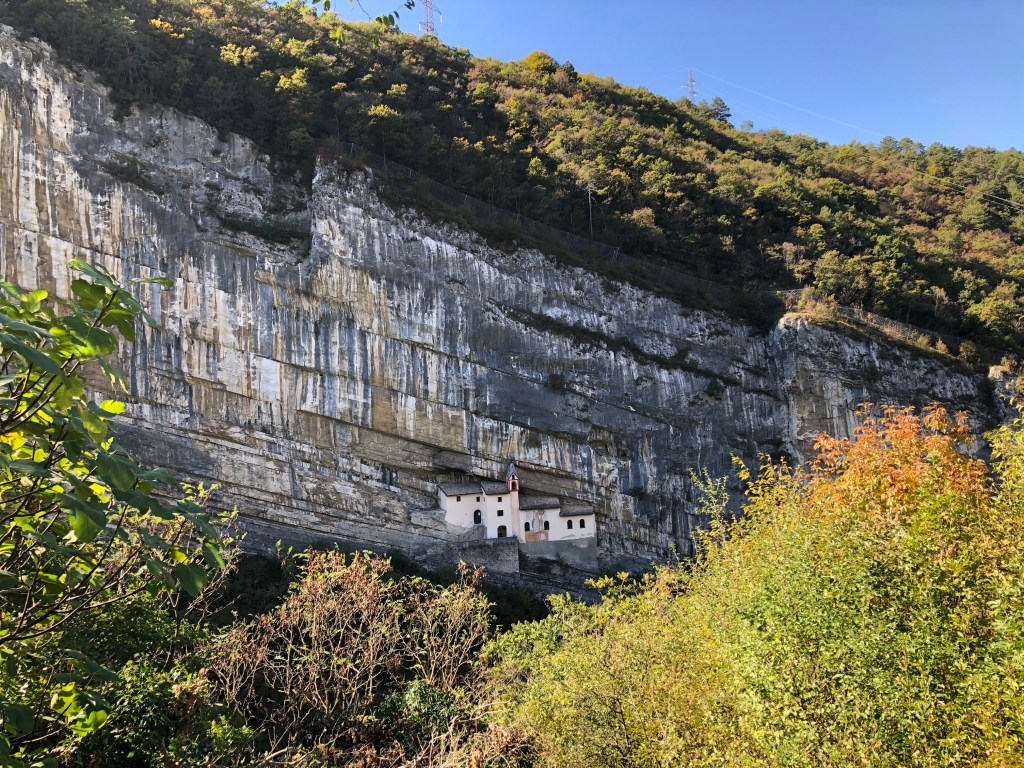 Bei dieser Tour ging es südwärts mit einem kleinen Schlenkerer zu der Einsiedelei San Columbano, die in einer Talenge bei Trambileno direkt auf einem Felsvorsprung erbaut wurde. Die ersten Aufzeichnungen deuten bereits 753 n.Chr. auf eine Besiedelung hin. Glaubt man der Gründungslegende, so gab es hier einen Drachen, der kleine Mädchen verspeiste, die im unterhalb der Kirche vorbei fließenden Bach Leno getauft wurden. Der Heilige war in jungen Jahren ein Ritter und hat diesen Drachen getötet. Warum er sich dann hier als Eremit zurück gezogen hat, bleibt bei der Erzählung offen. Wir könnten die Geschichte ja fertig schreiben. Also bitte um eure Vorschläge!