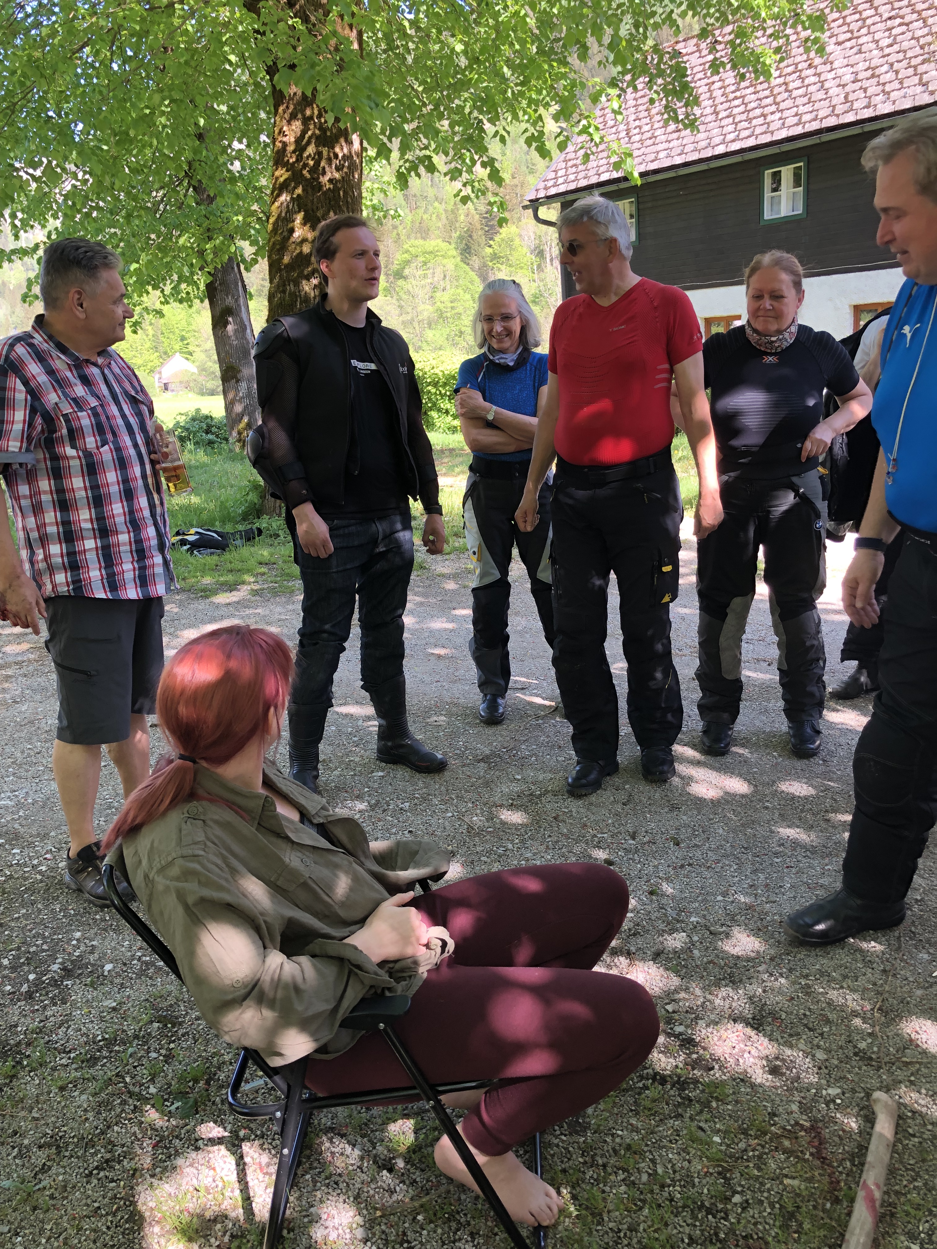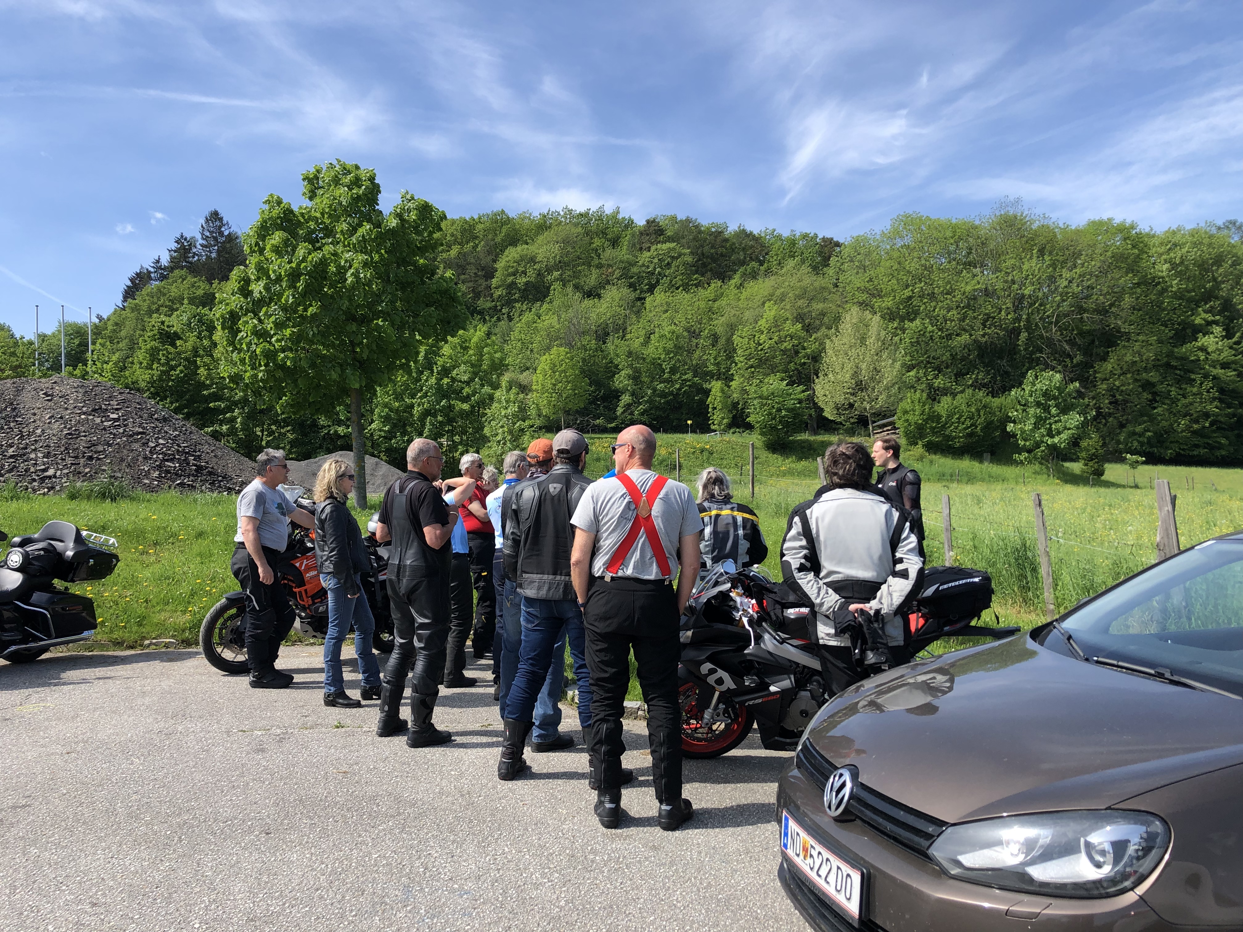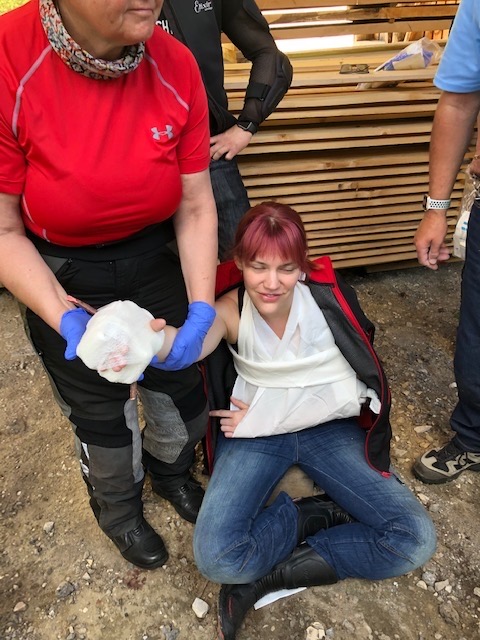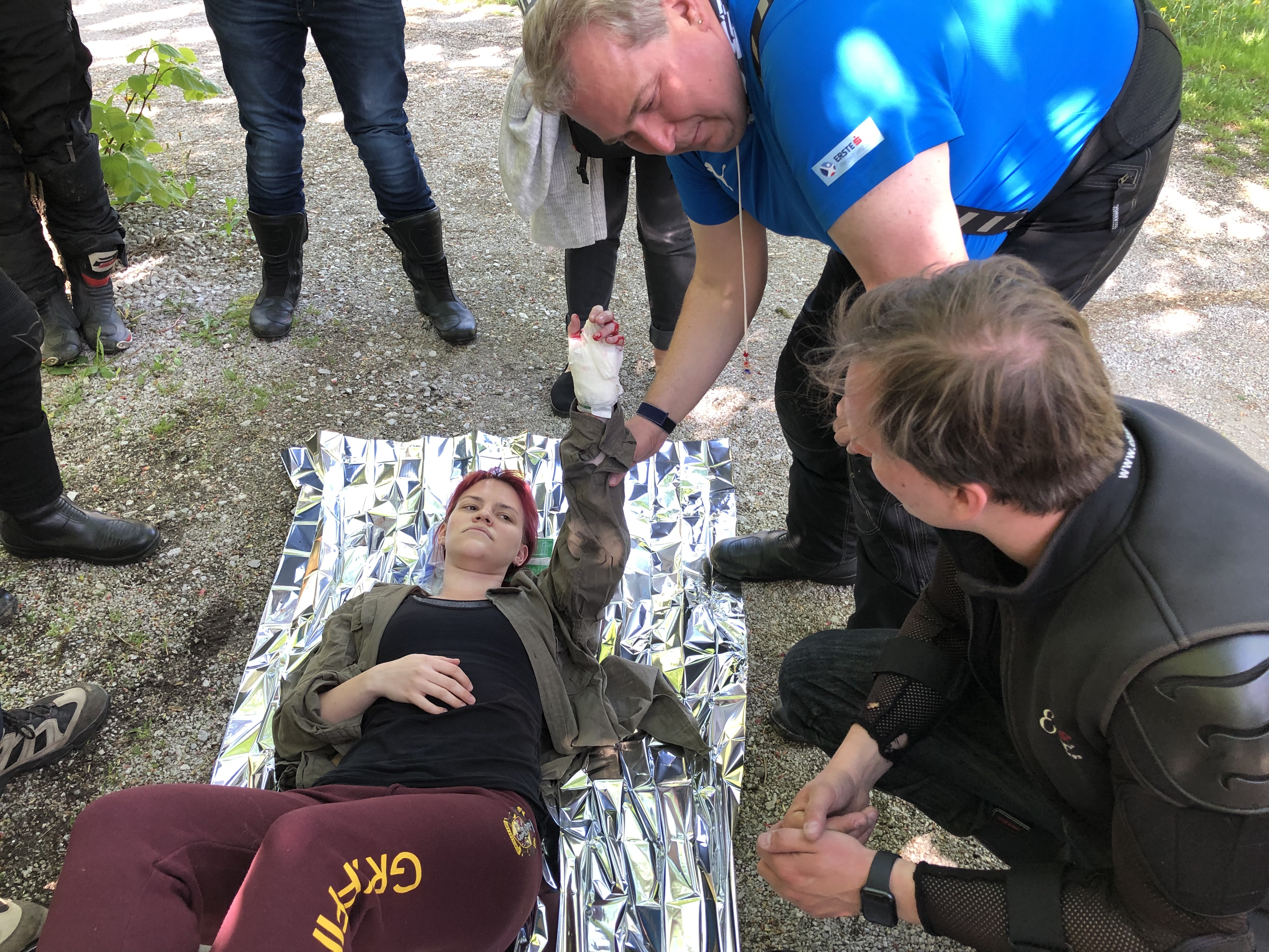 Das war auch gleich der Einstieg von Matthias bevor wir mit dem Motorrädern in die Rax-Region starteten. Barbara mit dem Bike, Andrea und Jörg mit dem Auto, fuhren immer voraus, um am nächsten Zielpunkt eine Überraschung vorzubereiten und mit Überraschung meine ich eine simulierte Notfallsituation, wo Erste Hilfe geleistet werden musste. Wir waren richtig gefordert. So manch blutige Wunde sah ziemlich echt aus. Nachdem wir Barbara und Jörg, unsere beiden Unfallopfer, verarztet hatten und der fiktiven Notruf abgesetzt war, gab es jeweils ausführliche Wiederholungen und Erklärungen zu den Verbänden und zu den jeweils notwendigen Maßnahmen. Ich habe noch nie so viel bei einem Erste Hilfe Kurs gelernt und mir gemerkt, wie bei dem Training am Wochenende.