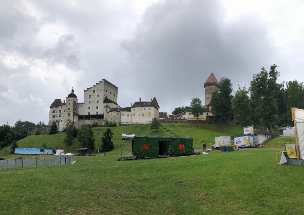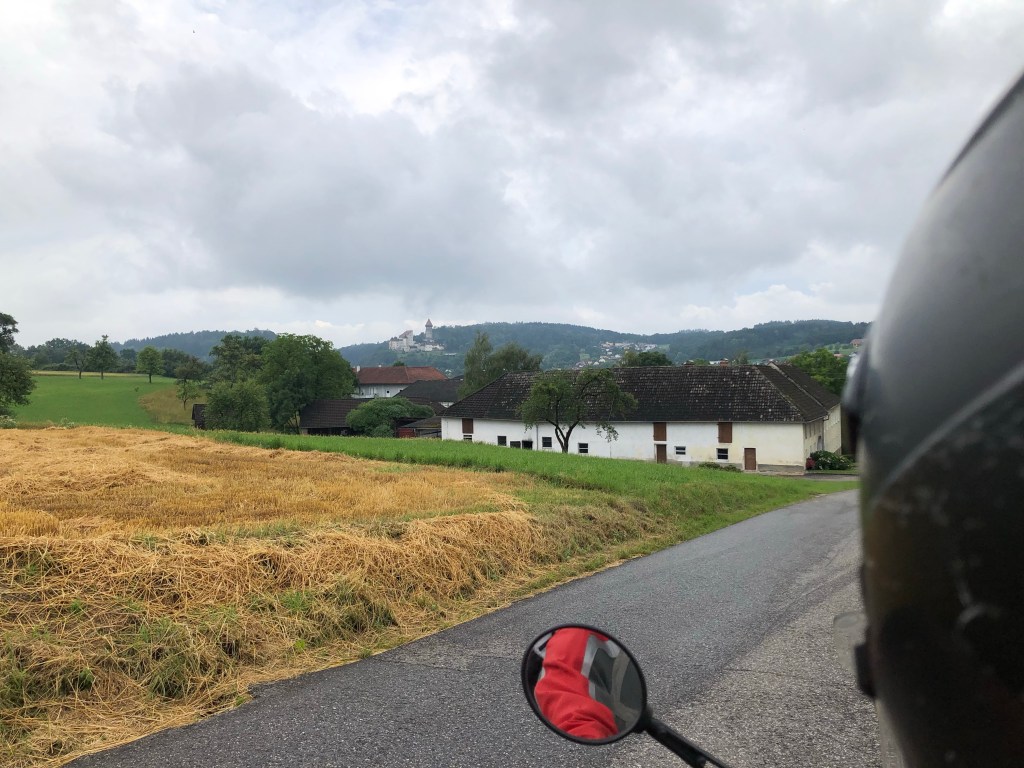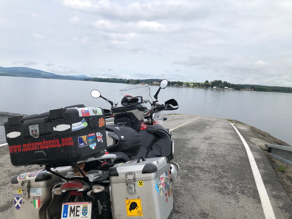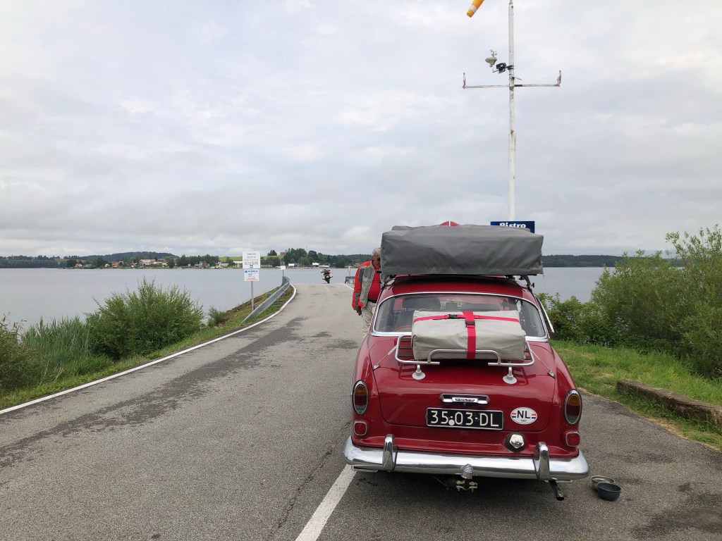 Es begann schon mit einem verspäteten Start in der Homebase, da immer wieder ein paar Gewitterwolken ihre Wassermassen bei uns abregneten. Um 11 Uhr war der Himmel dann endlich vielversprechender und wir meanderten entlang der Donau in Richtung Grein, Kefermarkt, Bad Leonfelden zum Lipno Stausee nahe der tschechisch-österreichischen Grenze, wo wir knapp die kleine Fähre verpassten. 45 Minuten auf´s Wasser schauen, am Ufer stehen oder auf und ab gehen, ein beruhigendes Programm zum Zeit vertreiben. Das Verkehrsaufkommen war sehr überschaubar. Vorerst waren nämlich nur wir an der Anlegestelle. Bald gesellte sich ein sympathisches holländisches Ehepaar mit einem entzückenden jungen Hund dazu. Besonders beeindruckt hat uns deren Reisegefährt ein schicker roter Volvo-Oldtimer mit Rooftop-Zelt. Wir wurden auf einen Kaffee aus deren Picknick-Korb eingeladen und es ergab sich eine interessante kurzweilige Reiseplauderei. Und fast pünktlich holte uns die Fähre ab und brachte uns ans andere Ufer. Zum Abschied wurde kurz gehupt, gewunken und schon war der rote Flitzer weg.