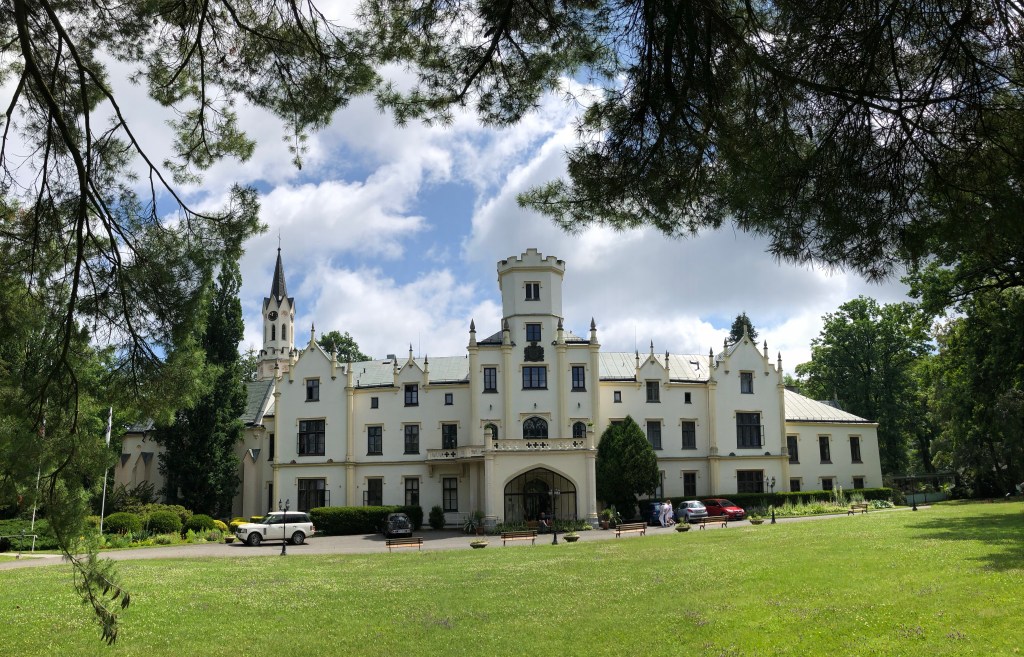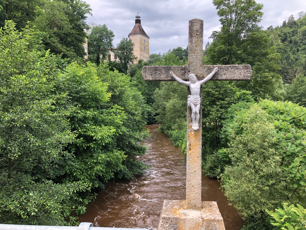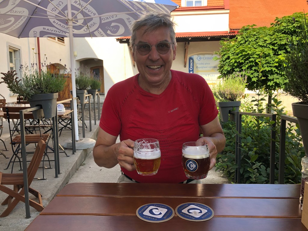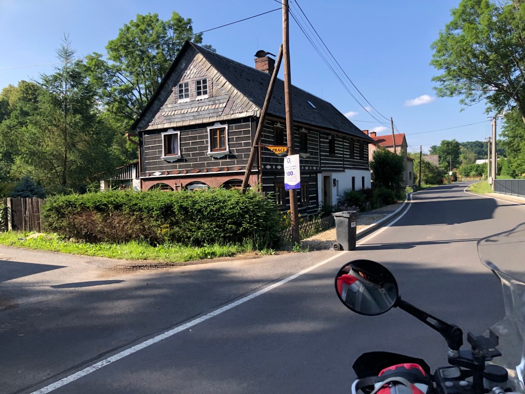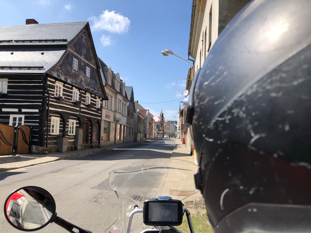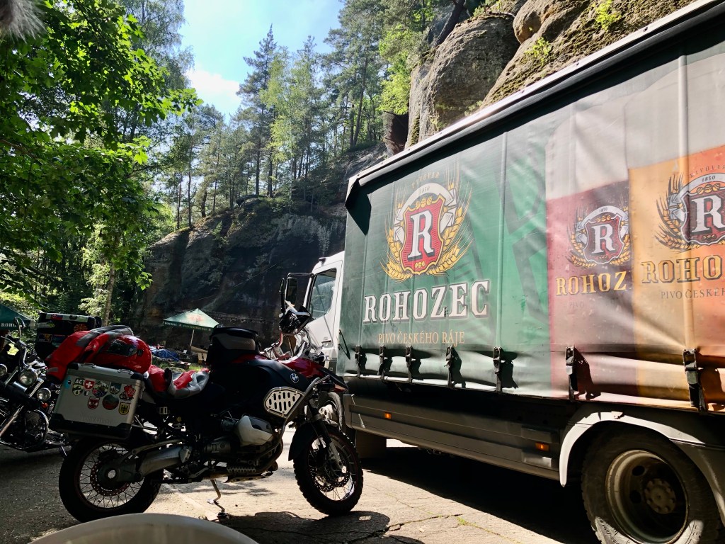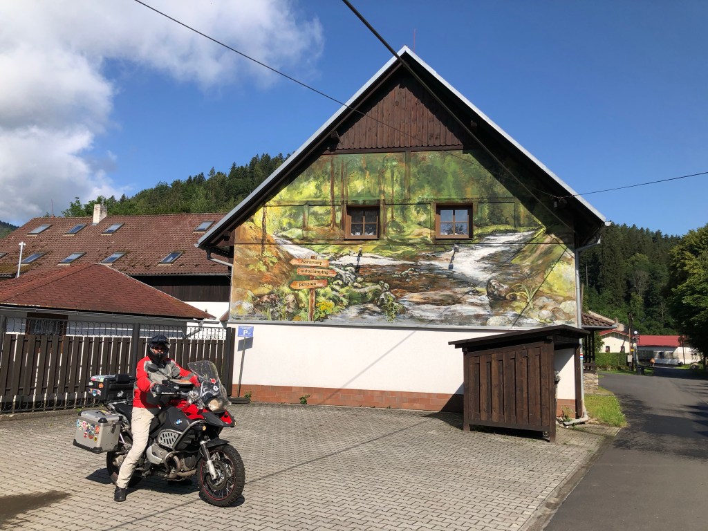 Ziemlich alleine kurvten wir mit dem Bock auf kleinen Straßen durch die tschechischen Wälder. Die Luft war rein, da es in den letzten Tagen hier anscheinend viel geregnet hatte. Kleine Bäche rauschten mit einer rotbraunen Wasserbrühe vorbei. Nasse Blätter am Asphalt, ausgewaschenes Bankett und gelegentlich schlammige Stellen auf der Straße mahnten zur Vorsicht. Aber es war Natur pur, gelegentlich ein kleiner Ort, viel Grün und ein grau verhangener Wolkenhimmel. Der ambitionierte Versuch vom Bockchef einen von Meister Garmin vorgeschlagenen Weg quer durch den Nationalpark zu nehmen, mündete in einer Nationalpark-Umfahrung wegen einer massiven Fahrverbotstafel! Bei so viel Grün konnte man nur tiefenentspannt bleiben, Unwetterwarnung hin oder her. Das Quartier in Rejstejn war ja nicht mehr weit. Mit Tempo überholten wir knapp die Regenwolken und kamen gerade noch rechtzeitig vor dem Weltuntergang-Szenario trocken an. Das Stiefelbier war bei dem Timing redlich verdient.