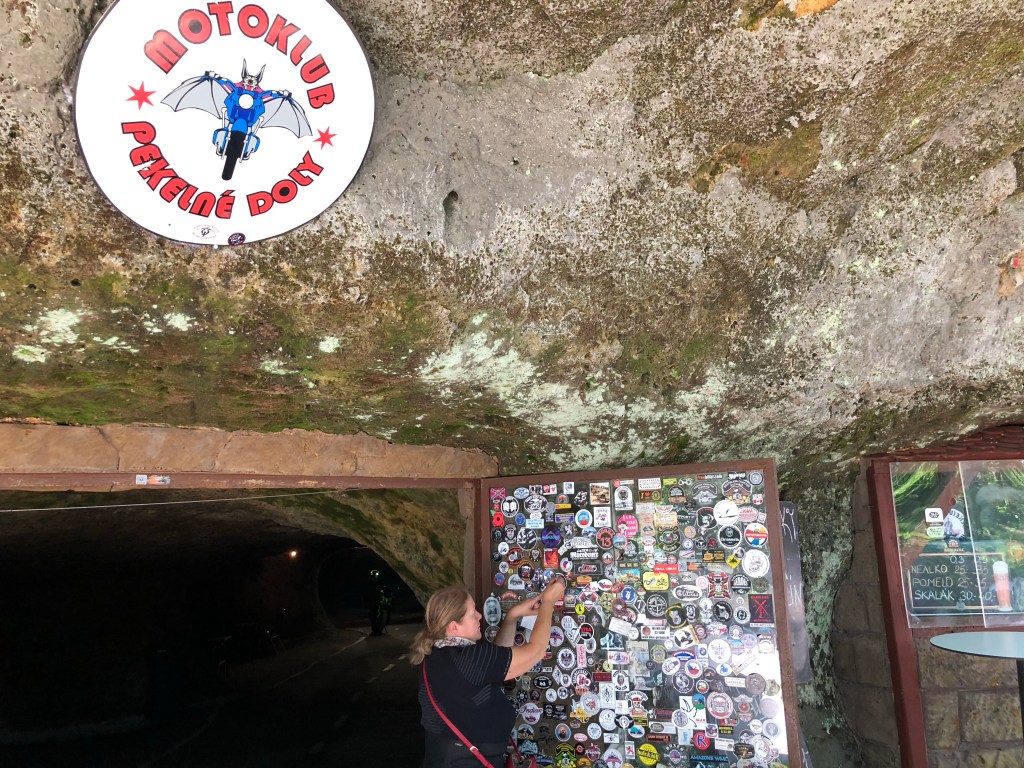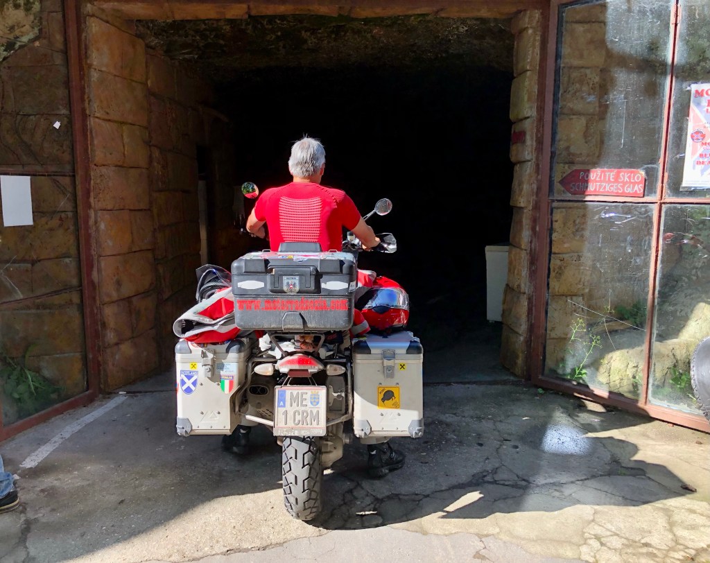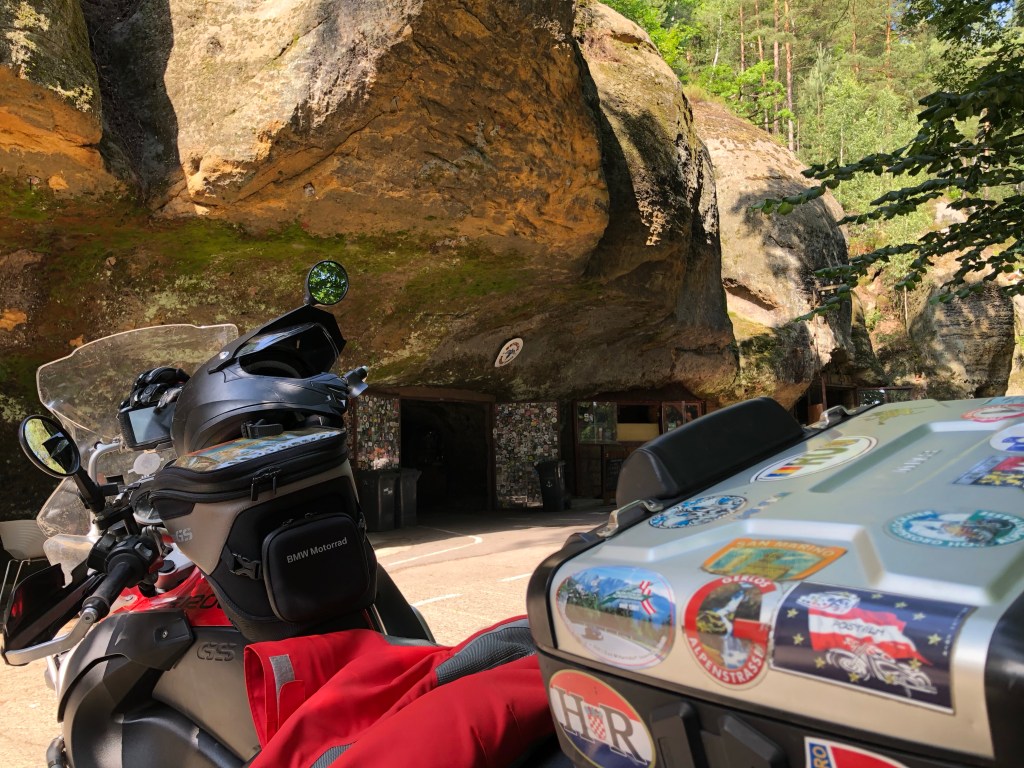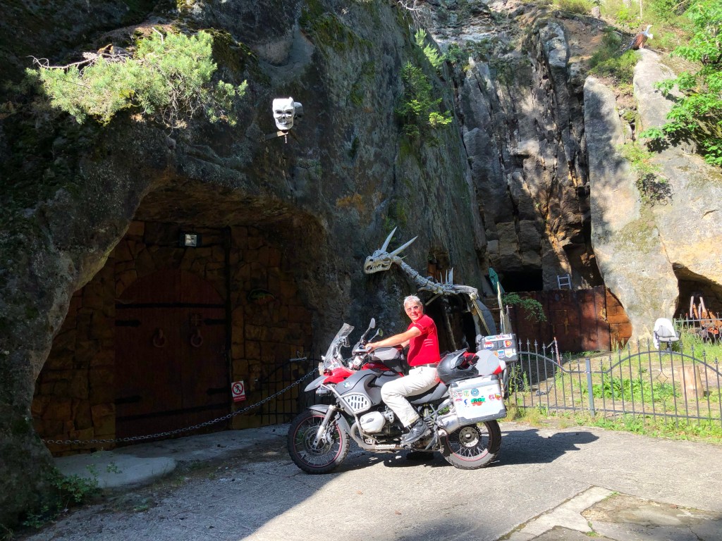 Etliche Kilometer, durch tschechisches Feld und Flur, waren bei Meister Garmin eingespeichert, um am Ende des Fahrtages quasi das Highlight der Tour zu erreichen – DIE MOTORRADHÖHLE. Ich hatte schon davon gelesen und einen Bericht gesehen. Die Höhle „Pekelné Doly“ gehört einem Motorradclub. In den Felsen gehauen befindet sich im Inneren ein überschaubares Straßennetz, Bars und witzige Szenerien, wie in einer Geisterbahn, ein einmaliges Ambiente.