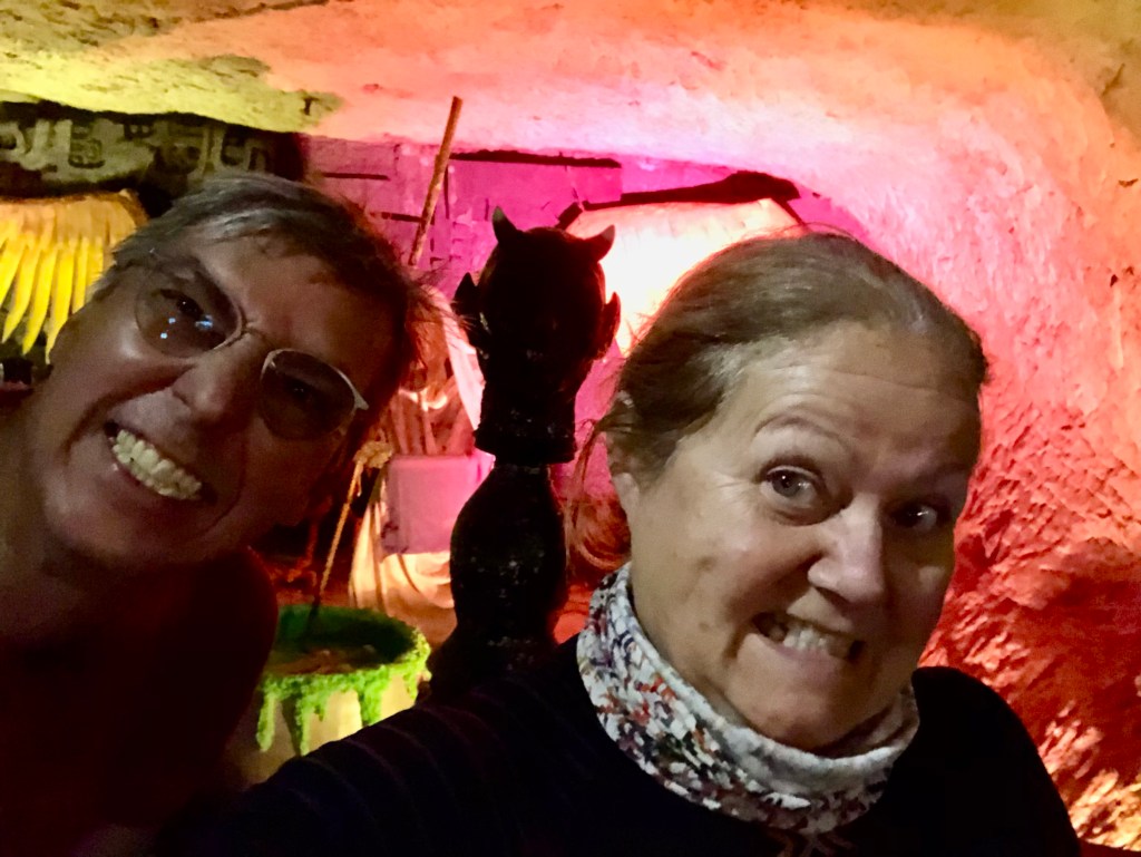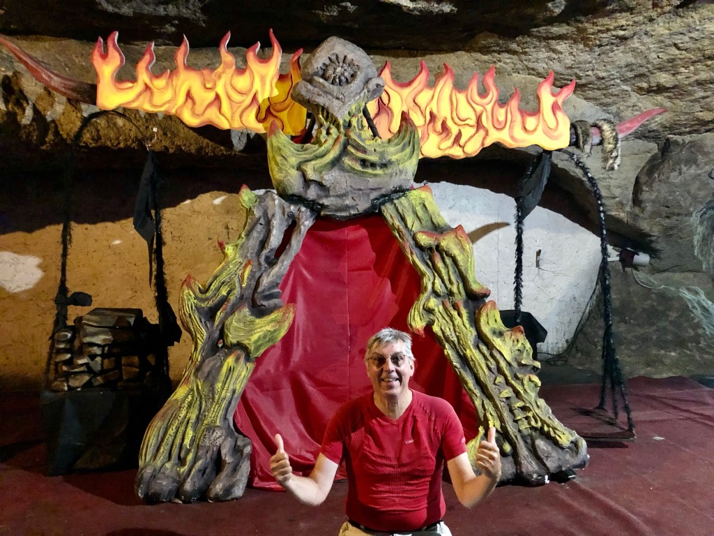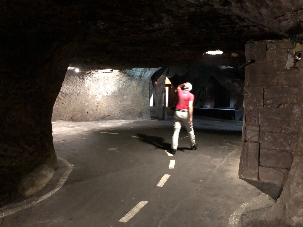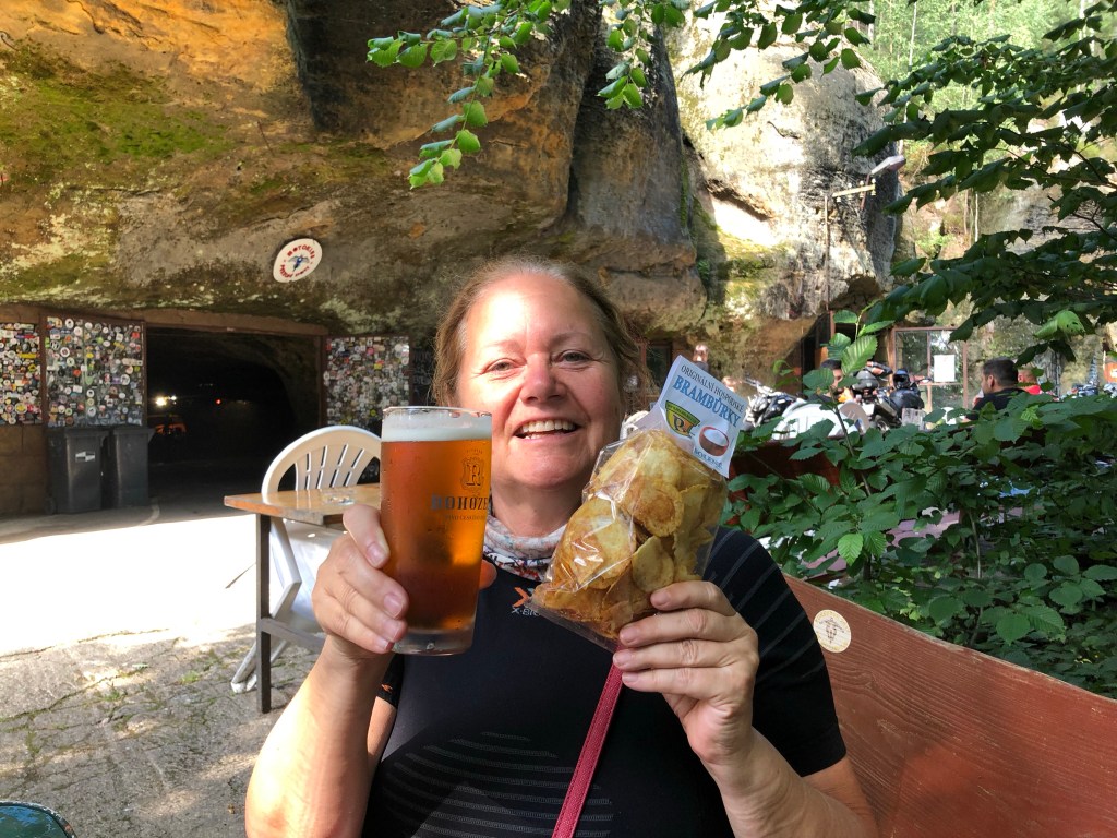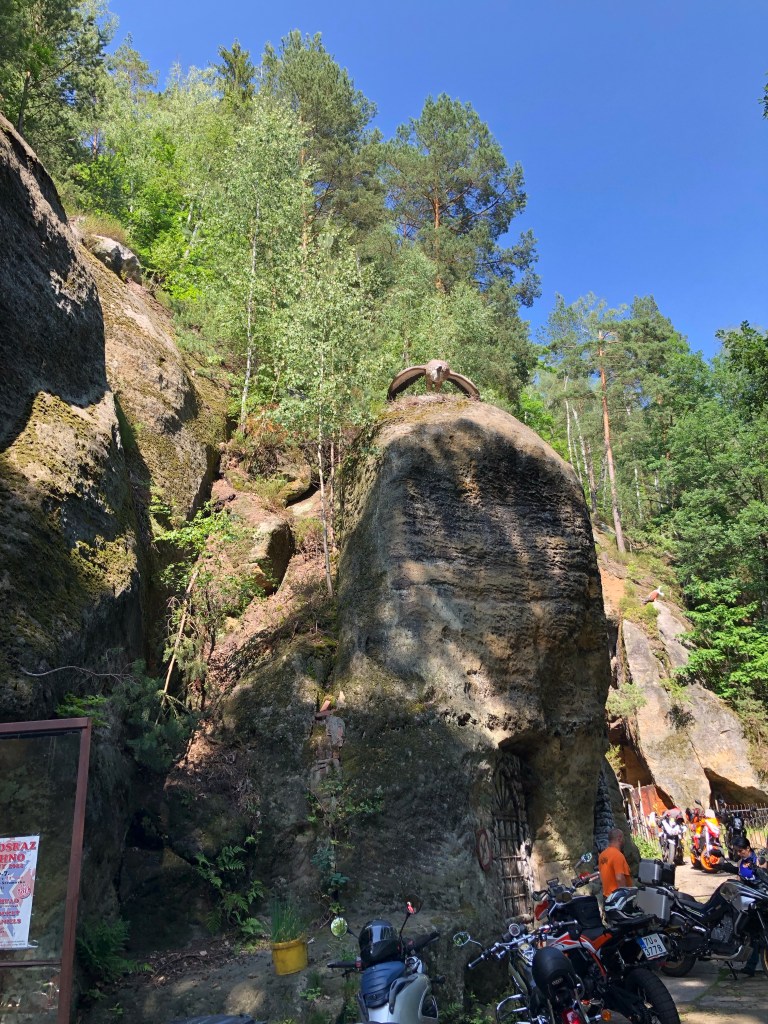 Etliche Kilometer, durch tschechisches Feld und Flur, waren bei Meister Garmin eingespeichert, um am Ende des Fahrtages quasi das Highlight der Tour zu erreichen – DIE MOTORRADHÖHLE. Ich hatte schon davon gelesen und einen Bericht gesehen. Die Höhle „Pekelné Doly“ gehört einem Motorradclub. In den Felsen gehauen befindet sich im Inneren ein überschaubares Straßennetz, Bars und witzige Szenerien, wie in einer Geisterbahn, ein einmaliges Ambiente.