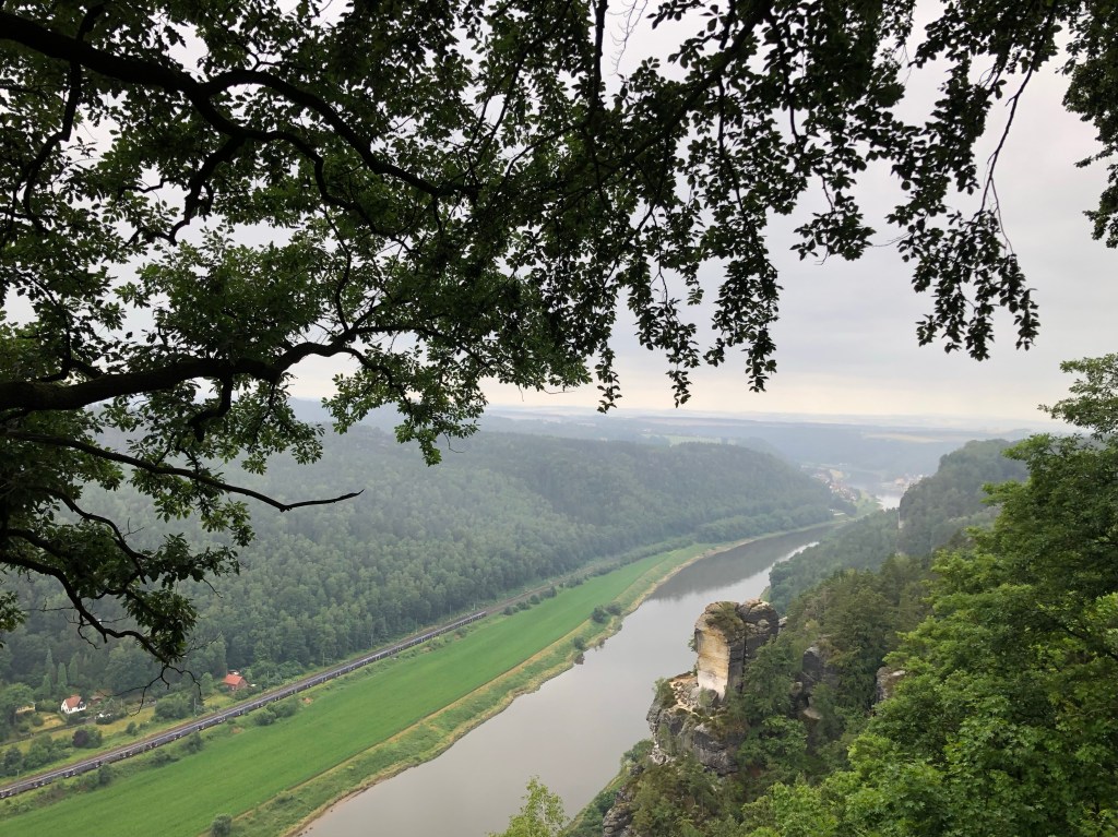 Schon bei der Hinfahrt nach Berlin sahen wir in der Sächsischen Schweiz einige dieser Steinriesen des Elbsandsteingebirges. Die Felsen steigen wirklich direkt am Elbeufer an die 190 m hoch und erreichen im Hinterland an die 300 m.