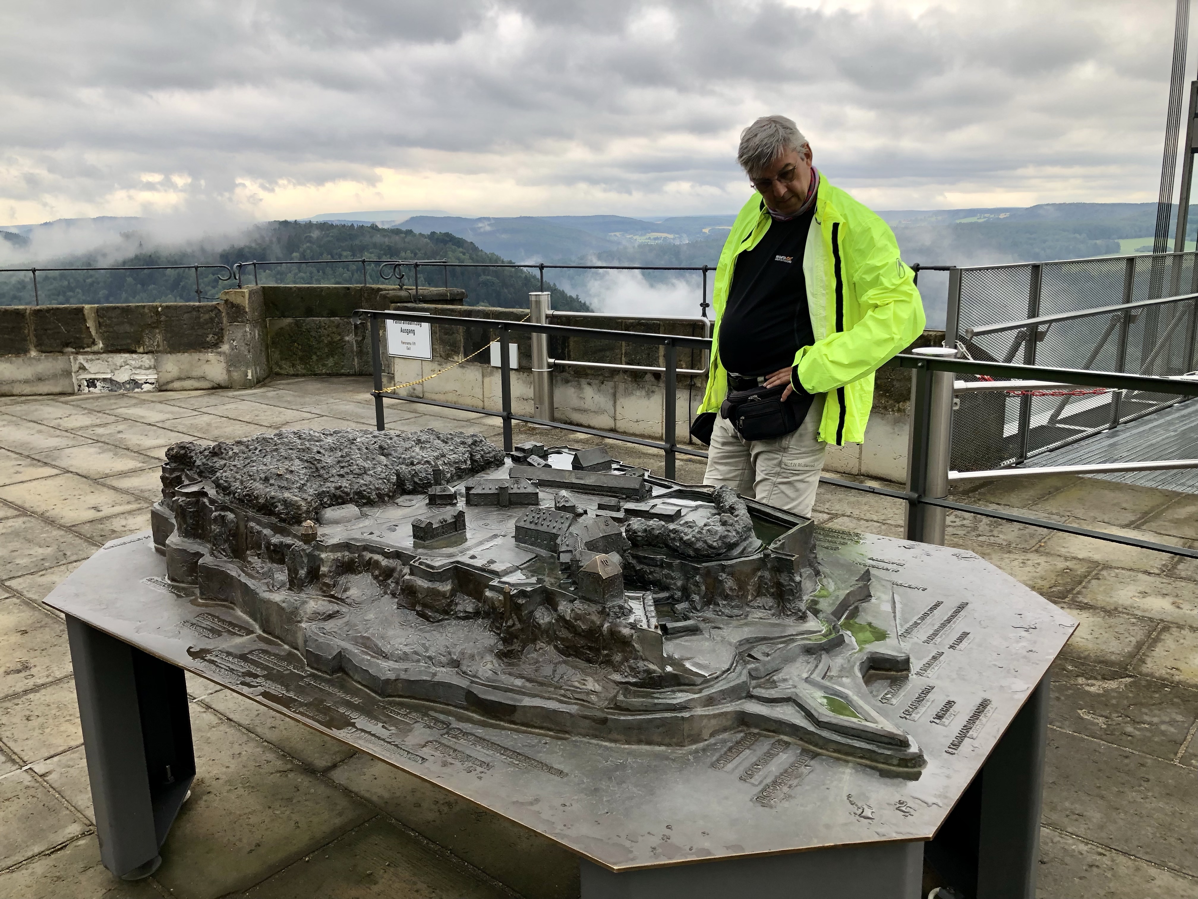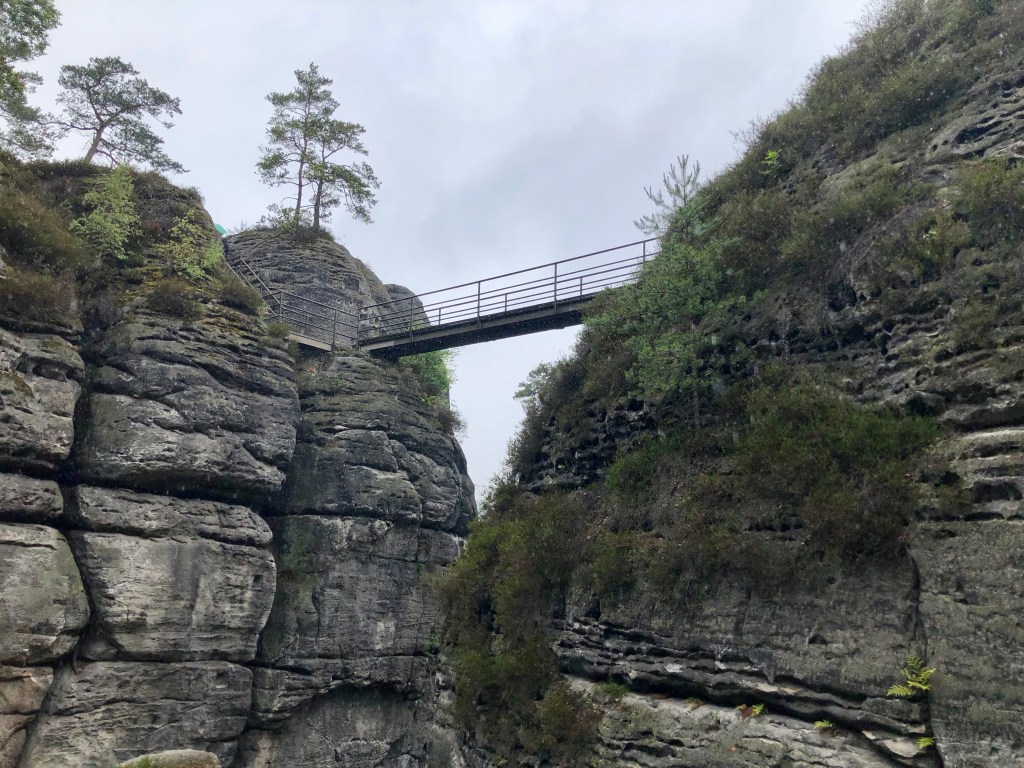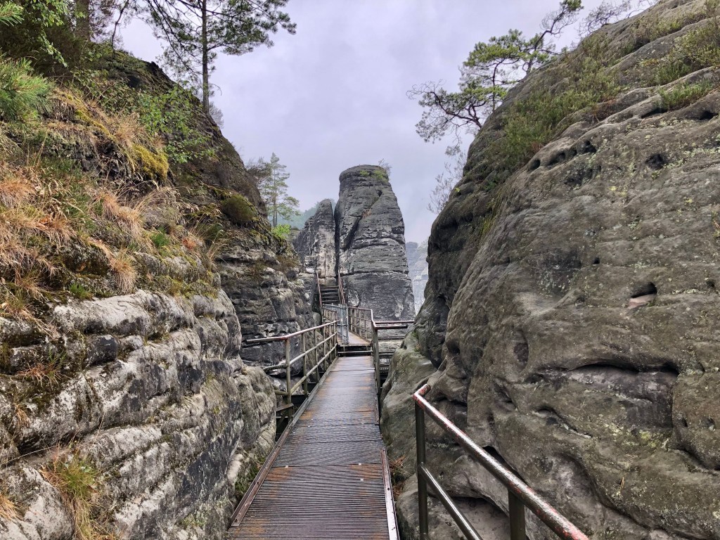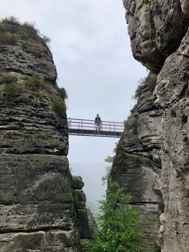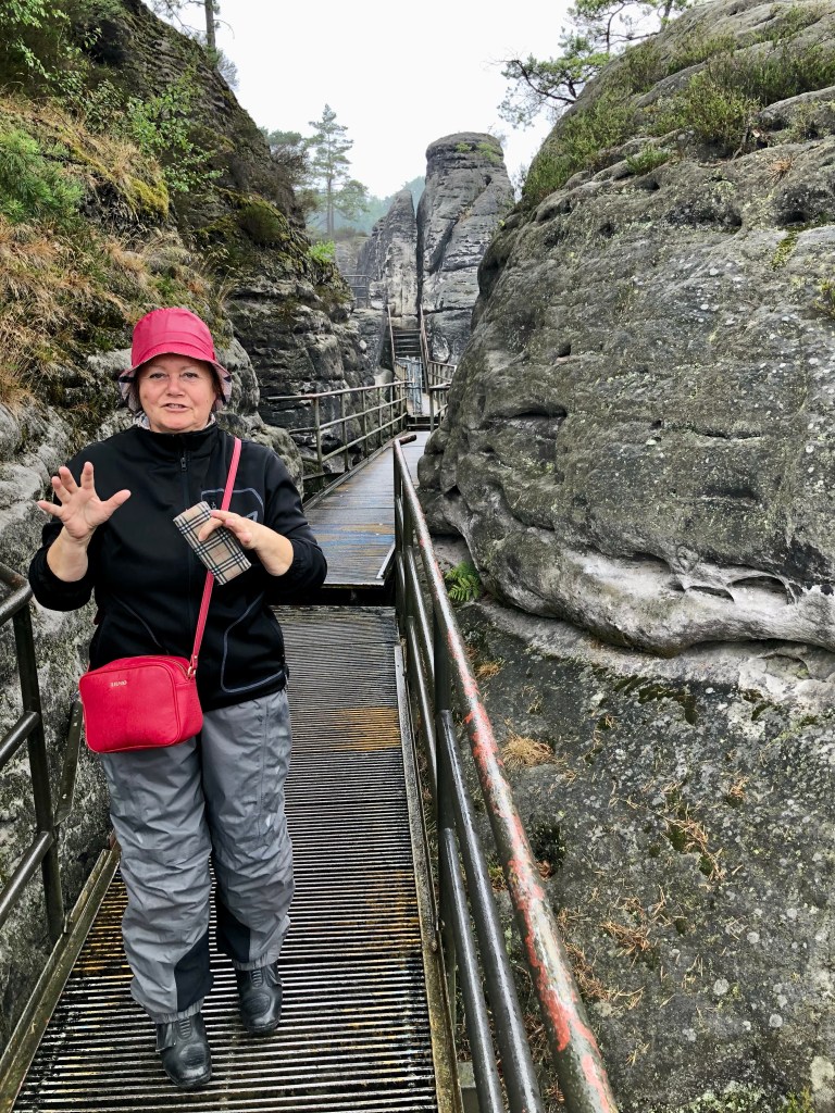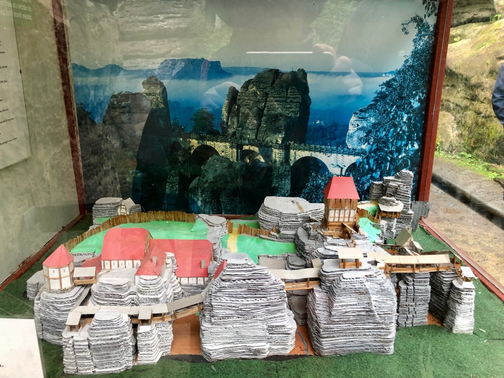 Das touristische Highlight der Region ist unbestritten die Bastei, eine Felsformation, die mit Brücken verbunden ist. Sie liegt in dem Dreieck der Gemeinden Lohmen, Rathen und Wehlen. Der Name Bastei weist auf die Einbeziehung der Felsen in den Verteidigungsring der mittelalterlichen Felsenburg Neurathen hin. Rekonstruktionen und Modelle zeigen die Burganlage. Über Stege und Brücken kann man über Abgründen zwischen den Sandsteinriesen herum gehen, ein schwindelerregendes Erlebnis, sofern man nicht schwindelfrei ist. Ich habe es mutig probiert. Gott sei Dank hat es zu regnen begonnen, so dass wir es vorzogen im „Restaurant zum schönen Ausblick“ einen Kaffee zu trinken. Mit Ausblick war natürlich nichts, weil die Regenwolken tief hingen und der Nebel einfiel.