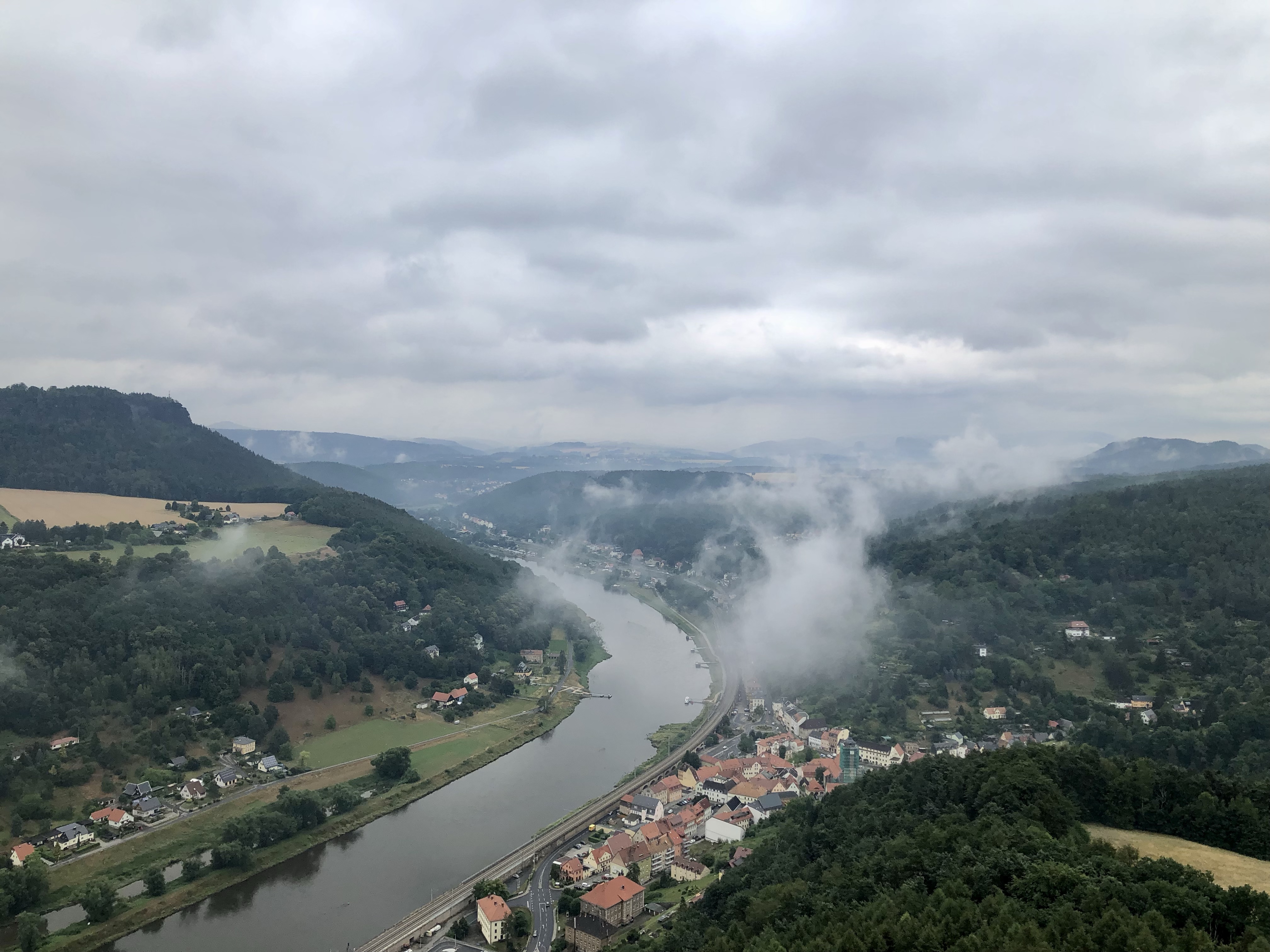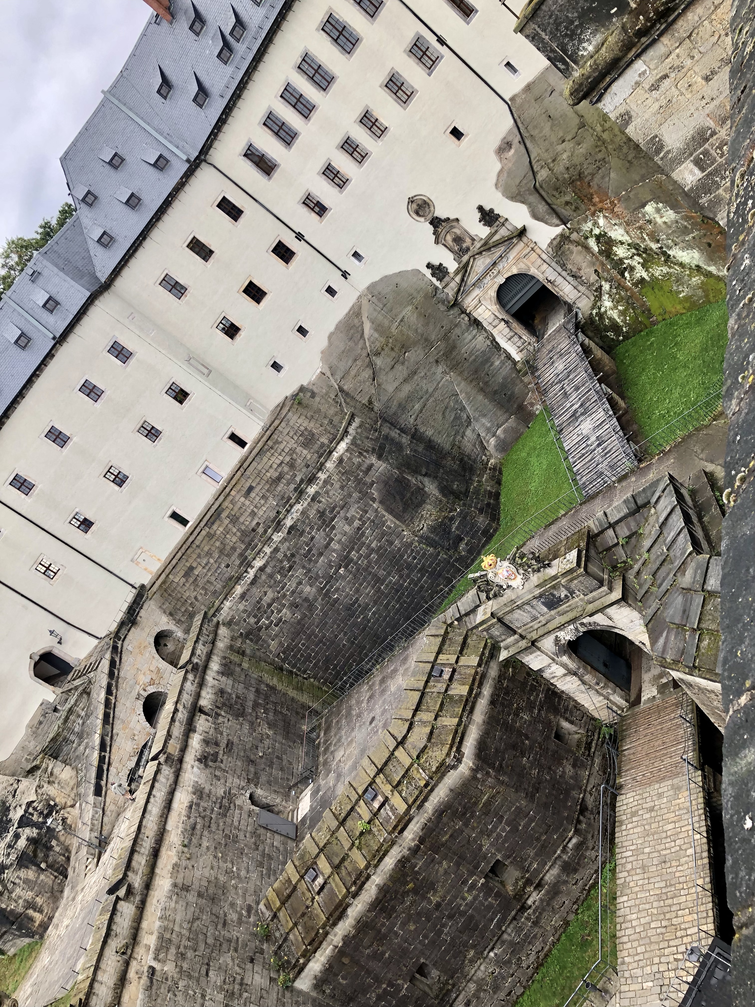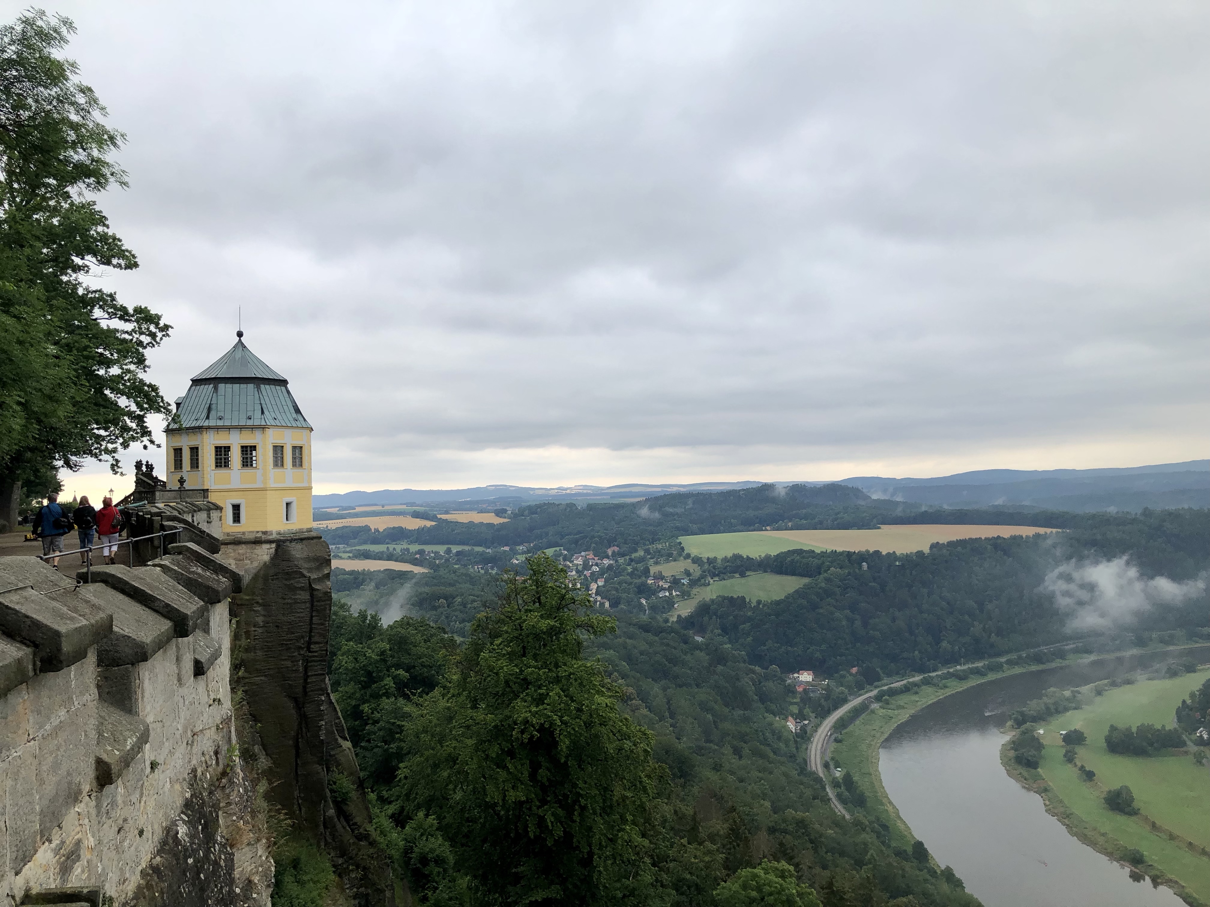 Nach einem kleinen Umweg erreichten wir die Festung Königstein am anderen Elbe Ufer. Das 9,5 Hektar große Felsplateau, erhebt sich 240 Meter über die Elbe und zeugt mit über 50 teilweise 400 Jahre alten Bauten vom militärischen und zivilen Leben auf der Festung. Der Wallgang der Festung ist 1800 Meter lang und hat bis zu 42 Meter hohe Mauern und Sandstein-Steilwände. Die Festung ist die größte Bergfestung in Europa.