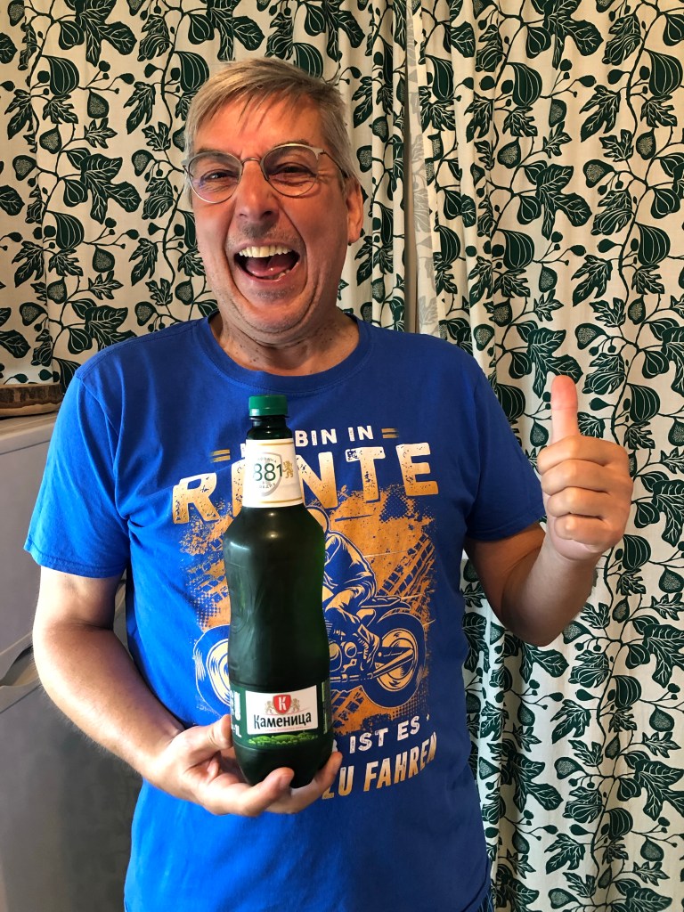 Die Freude über 1 Liter Bier in der Flasche ist unverkennbar.