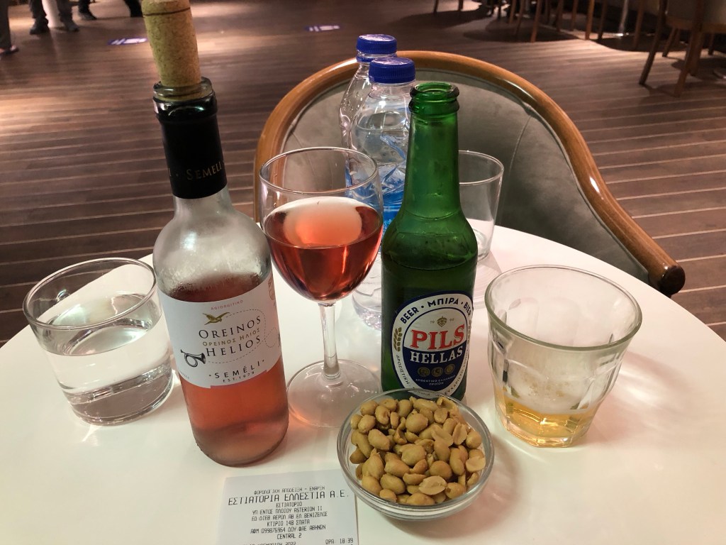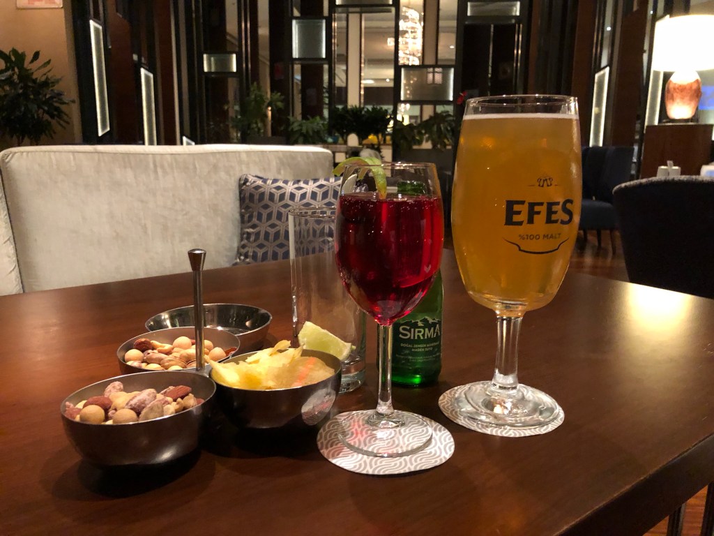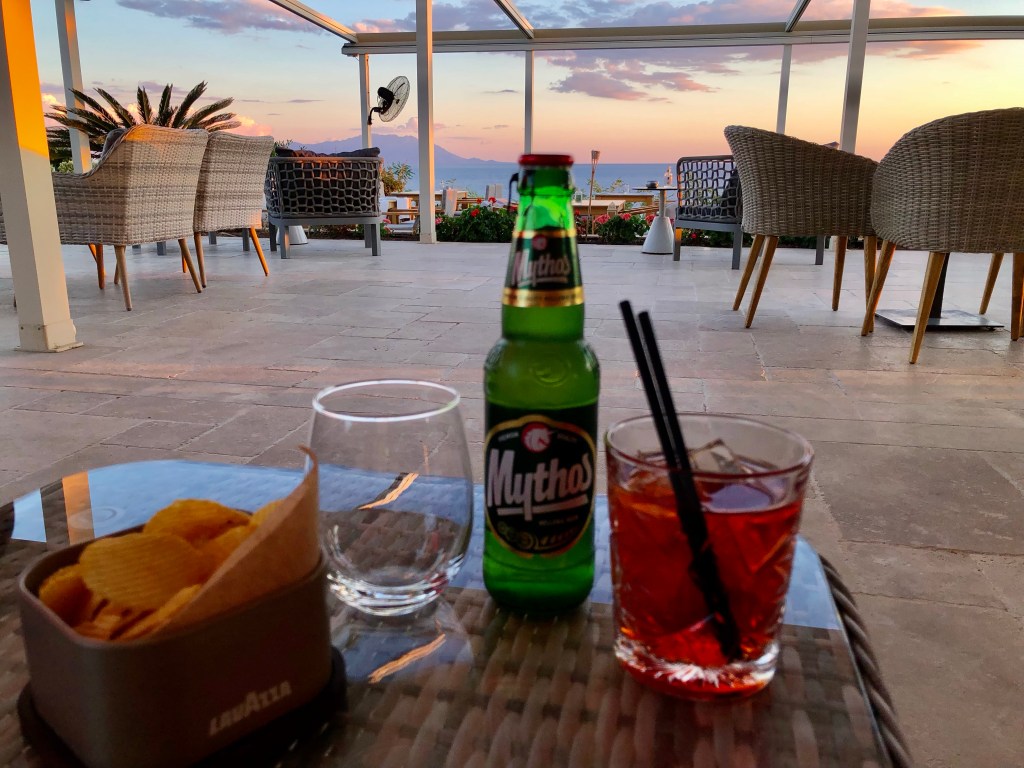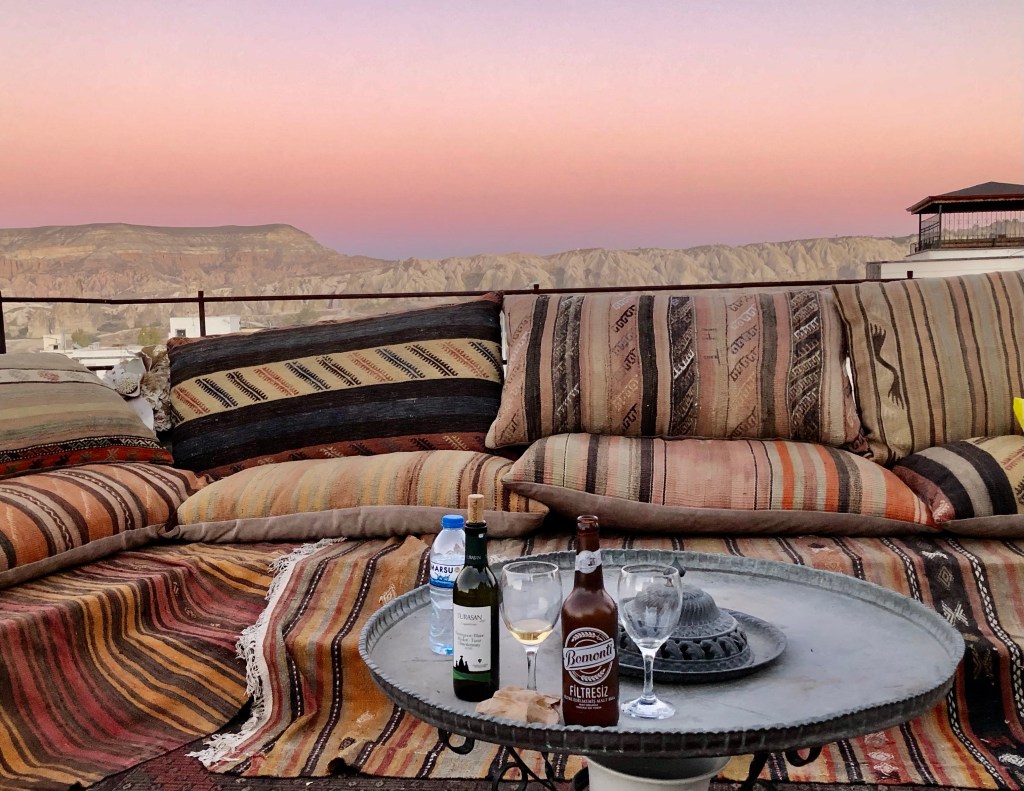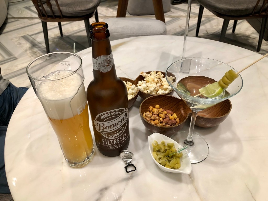 Bomonti und Wein aus dem Getränkeshop, bei Abendstimmung auf der Hotelterrasse genossen.