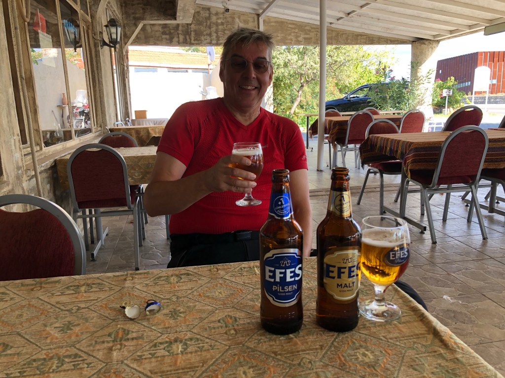 Wir haben ein Lokal gefunden, wo es auch Bier an die Gäste verkauft wird. Efes Gold